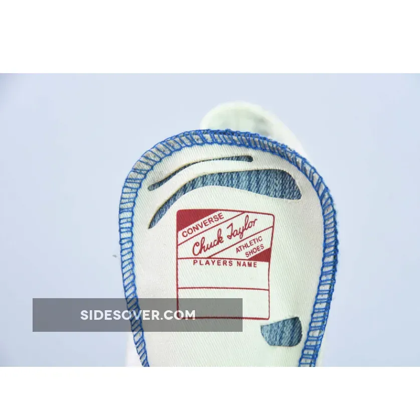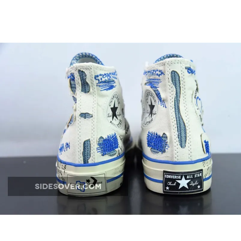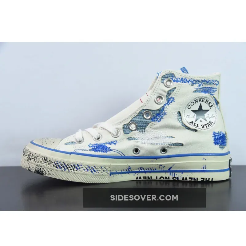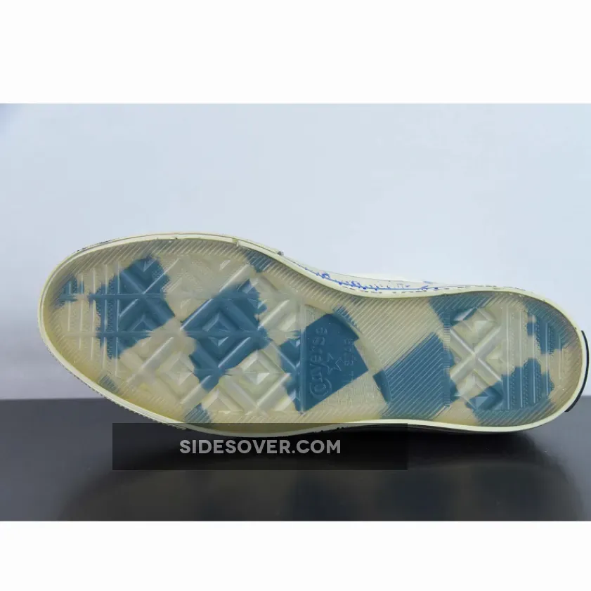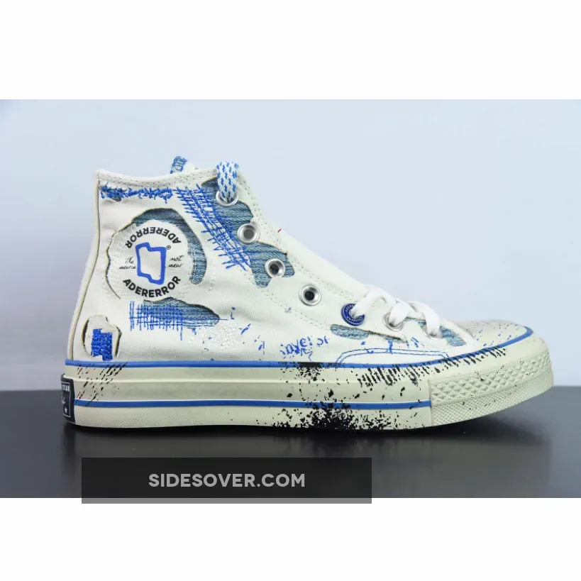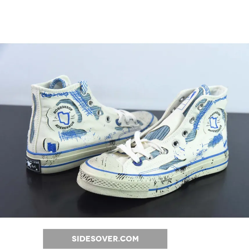 This collaborative colourway features a sail white canvas construction with exposed underlays flaunting blue knitted fabrics. Chaotic blue stitches and co-branded stamp marks maintain the disorganised makeover. Ader Error branding adorns the lateral ankle, while the signature Chuck 70 patch sits on the medial panel. Red Converse labels make up the tongue on the right shoe, with contrasting blue Ader Error branding on the left. The sail white rubber toe cap and midsole have scuff marks, stains, and chipped paint graphics to keep the design consistent. Co-branded nameplates on the heel celebrate the second collaboration between the two brands. The yellowing translucent outsole featuring blue and white plaid patterns wraps up this anarchic Chuck 70 High makeover.