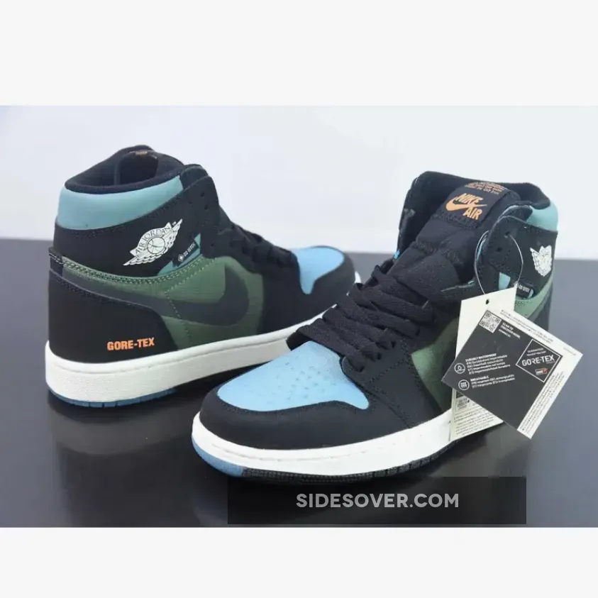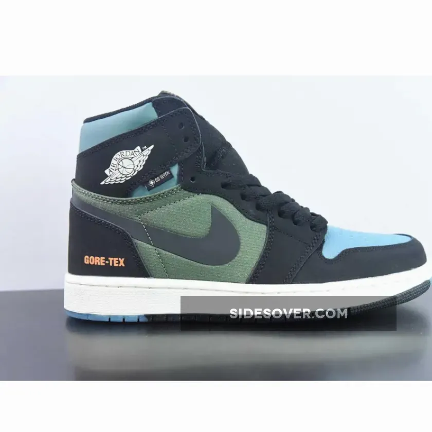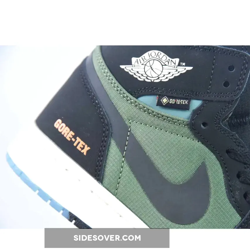 The winterised Jordan 1 starts with a blue ripstop mesh vamp with olive green ripstop fabrics encompassing the quarter panels. Nubuck and nylon materials come together across Peter Moore’s design in a familiar, but updated way. Meanwhile, black nubuck leather overlays wrap most of the upper, juxtaposed with a blue nubuck collar and a white Jordan Wings symbol on the lateral. “GORE-TEX” text are stamped onto the lateral heel, marking the sneaker’s protection against the elements. Bright orange accents illuminate the Nike Air labels on the tongue, while co-branding on the sockliners arranges a complementing blue and orange hue. The sail white midsole adds a touch of vintage that harkens back to the silhouette’s ‘80s origins. The pair also features an experimental, “deconstructed” aesthetic that works well with the toughness of the Element GORE-TEX makeover. Underfoot, the outsole opts for a partly transparent finish that increases grip in tough conditions.