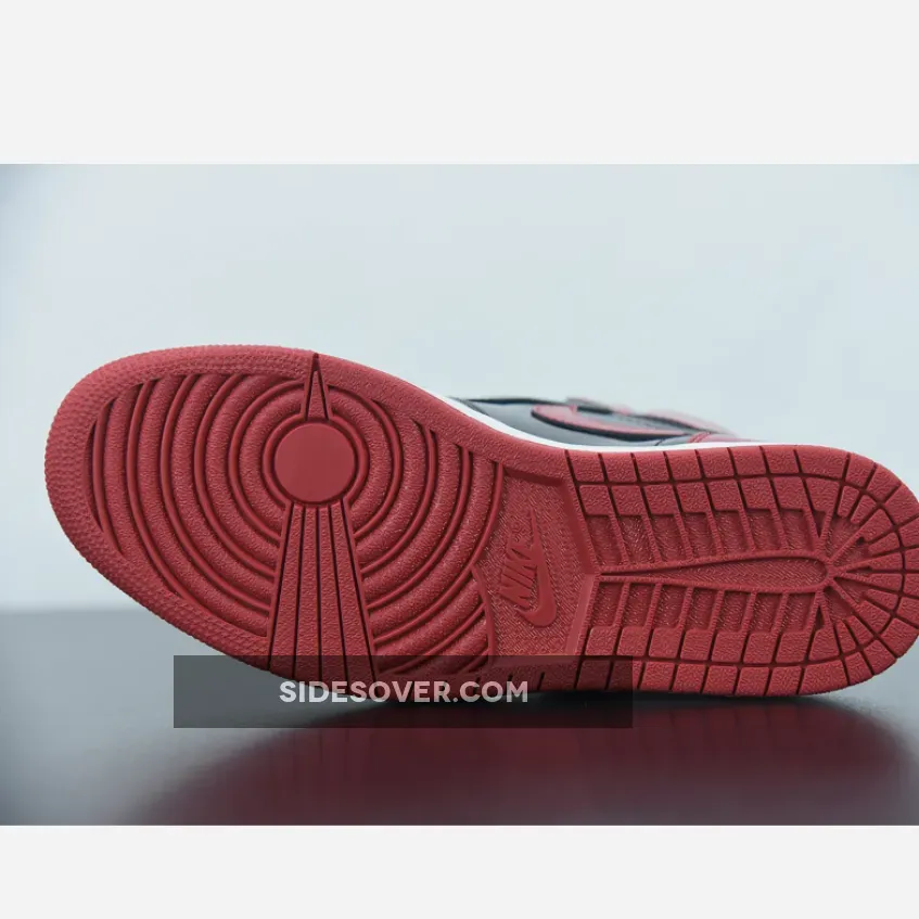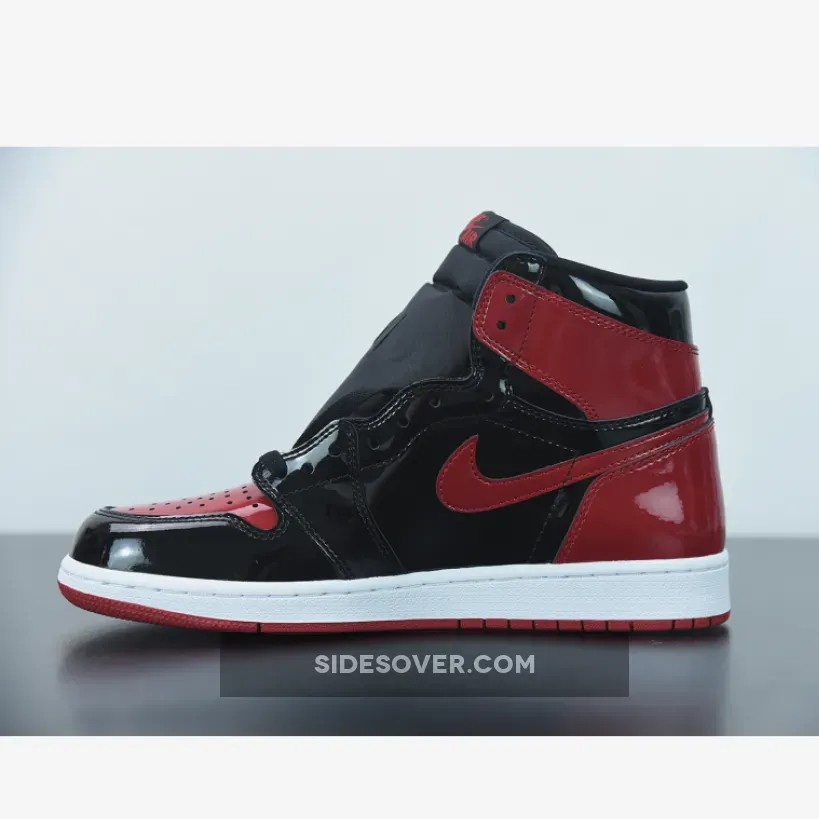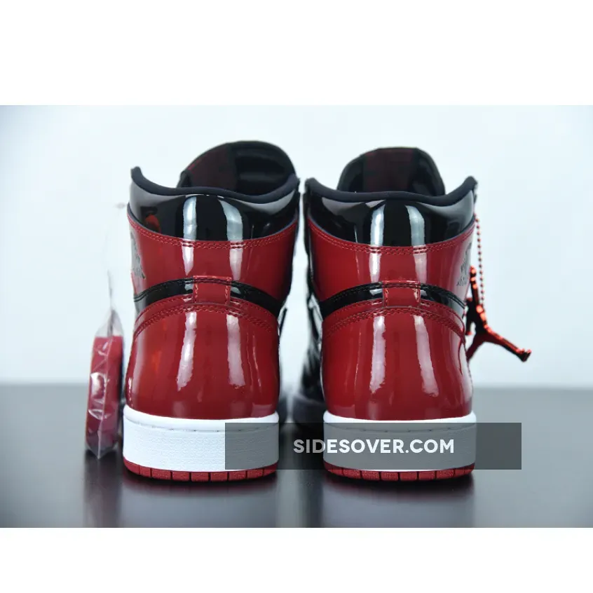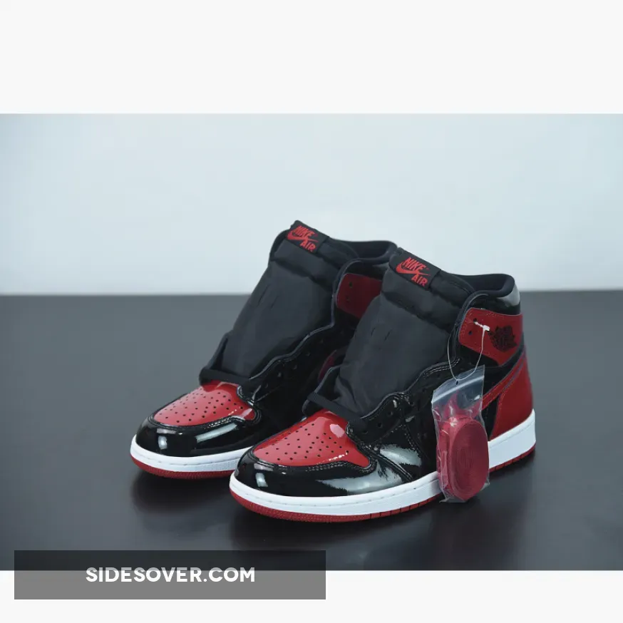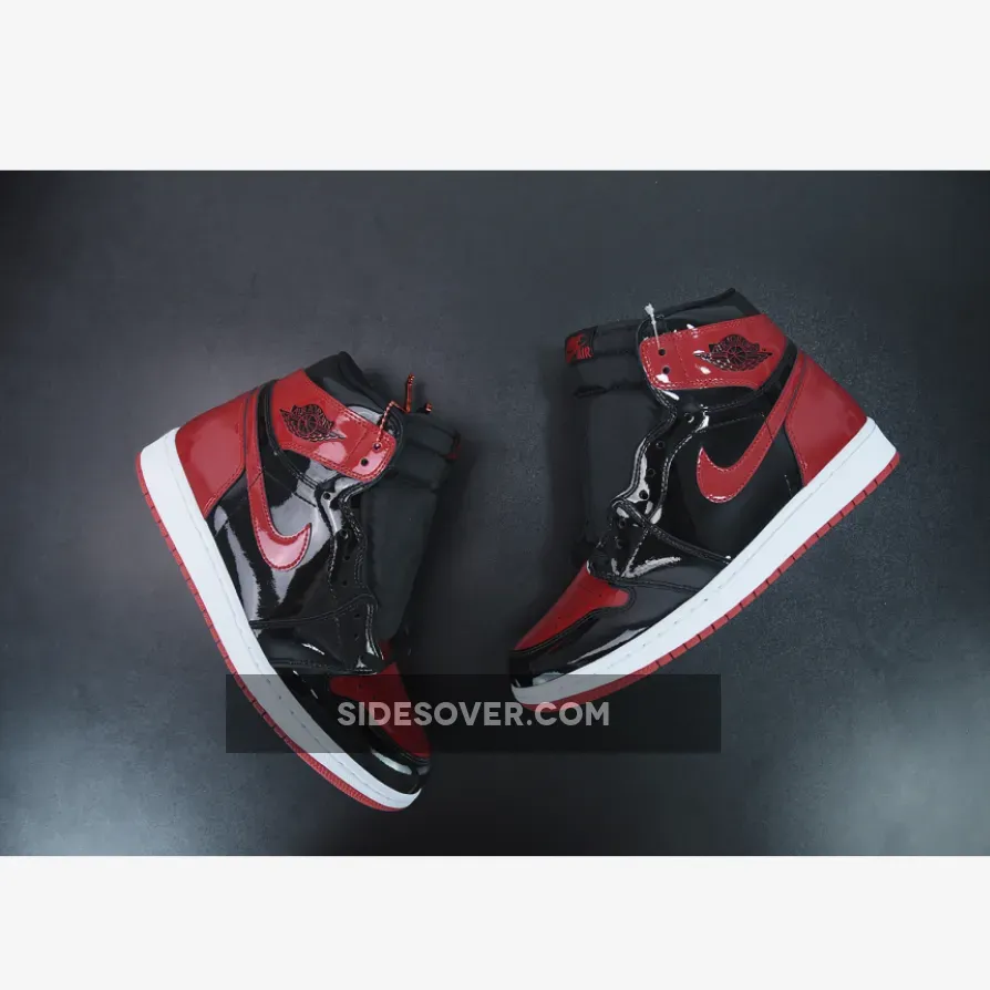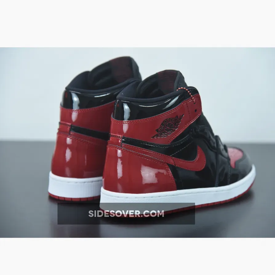 The Air Jordan 1 High Bred Patent features black and red patent leather upper with signature weaved Nike Air tongue labels. From there, a classic Wings logo on the collar and a white with red Air sole complete the retro design.
