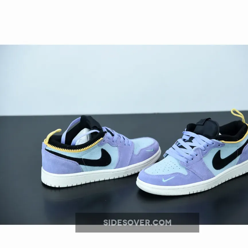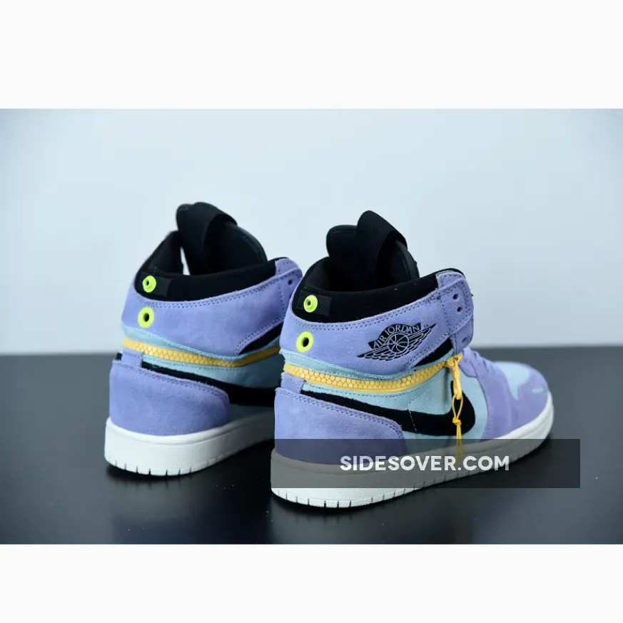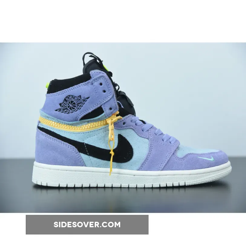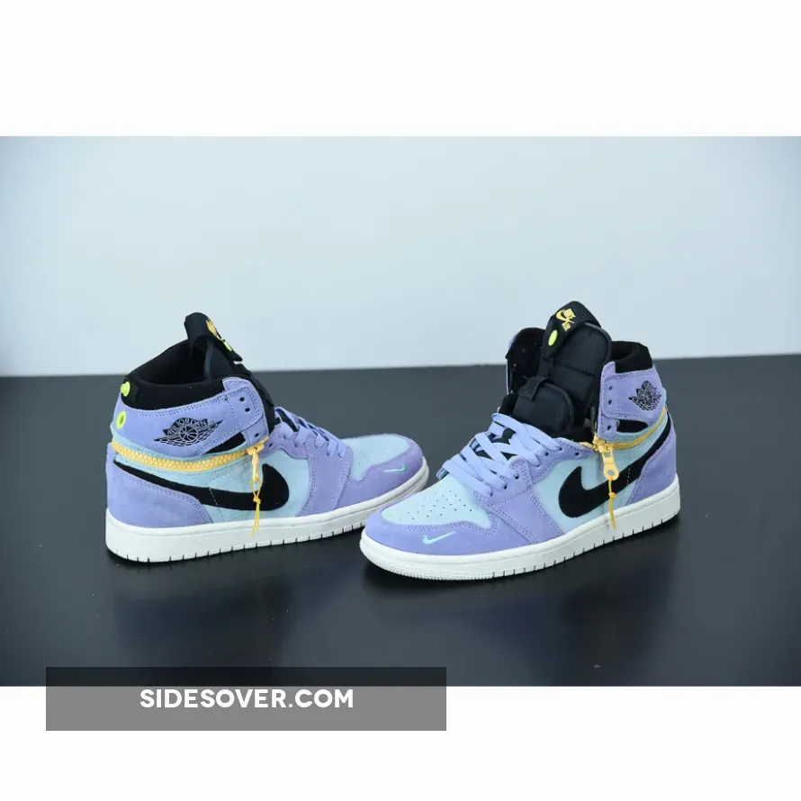 One of the pairs that will be available comes dressed in a Purple Pulse, Glacier Blue, Sail, and Black color scheme. This Air Jordan 1 features a zippered ankle collar that allows you to wear the pair as a high or low. The shoe comes in full suede featuring a Glacier Blue upper with Purple Pulse overlays. Black covers the ankle area, tongues, Wings and Swoosh logos with a Yellow zipper and heel pull tab. Blue also appears on the mini embroidered Swoosh on the toe completed with a Sail rubber outsole.