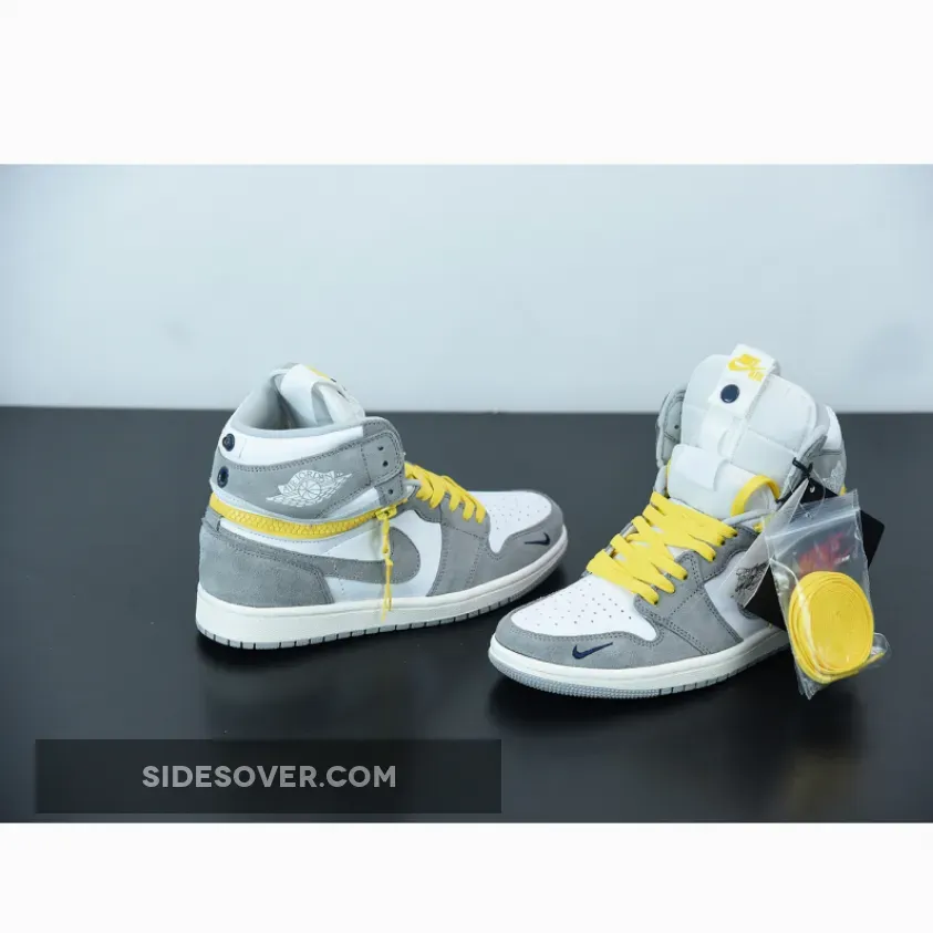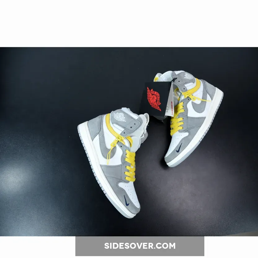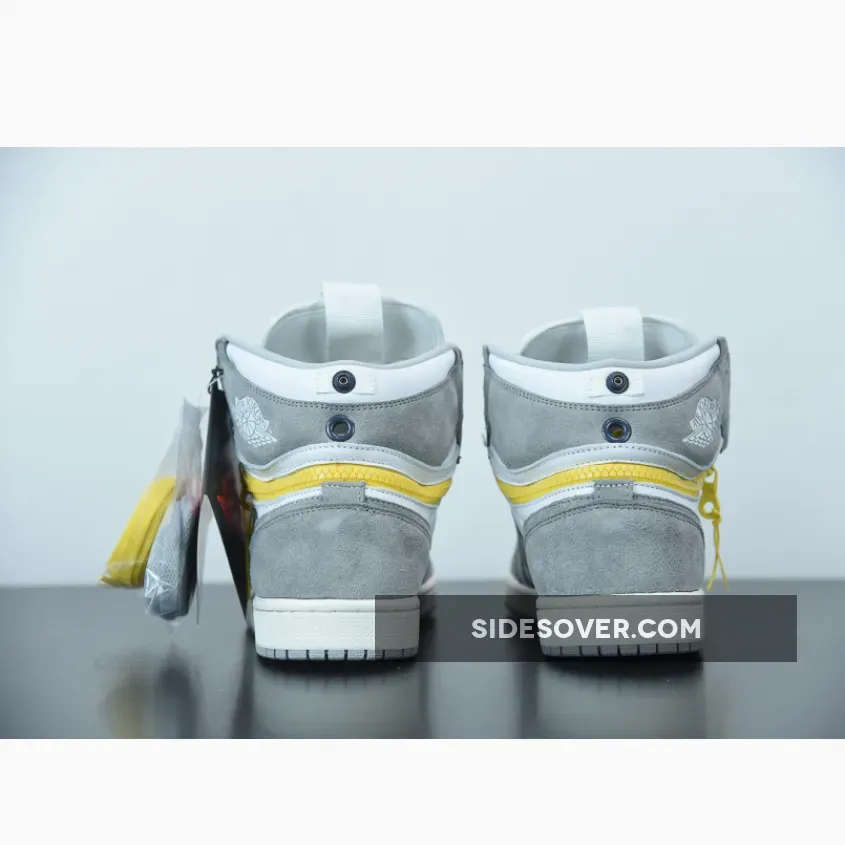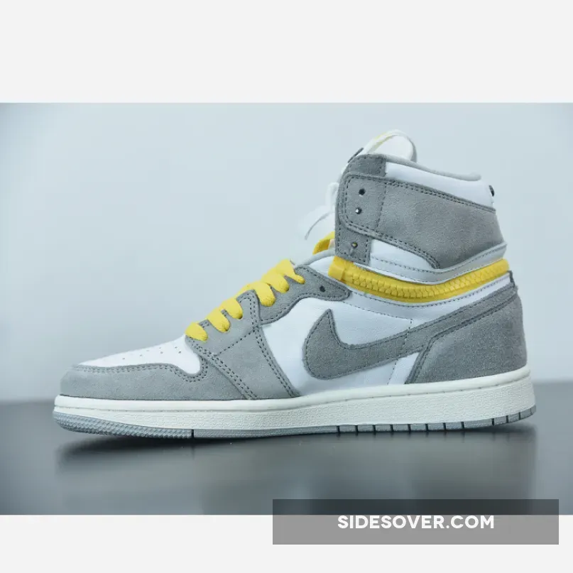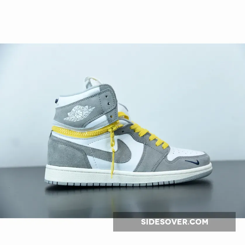 this Air Jordan 1 Switch comes dressed in a White, Light Smoke Grey, Sail, and Tour Yellow color combination. Breaking this pair down, it comes constructed with suede and leather, while White adorns the panels, collar, toe, and Swoosh. Furthermore, Light Smoke Grey appears on the ankle, eyestay, forefoot overlay, Swoosh, and wraps the toe and heel. Yellow appears on the laces, zipper, and heel pull tab. Finally, a Black mini Swoosh on the toe, a Sail vintage-like midsole, and a Grey rubber outsole complete the look.