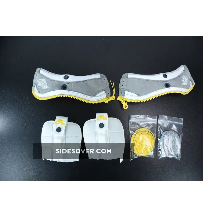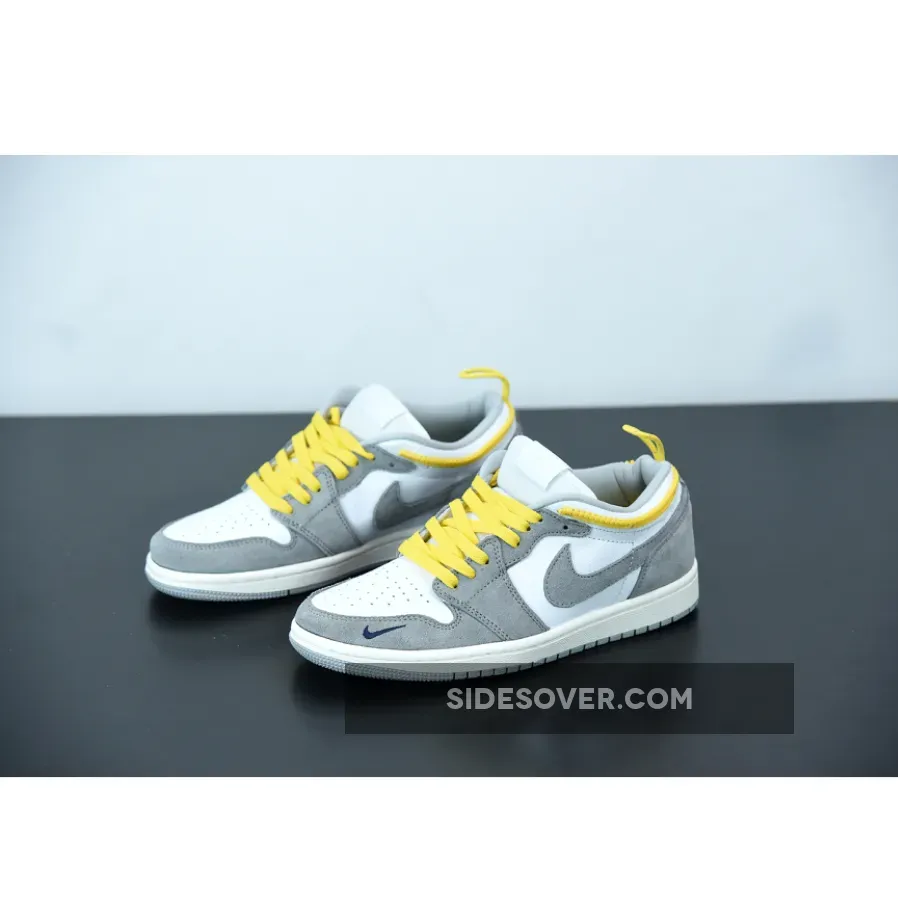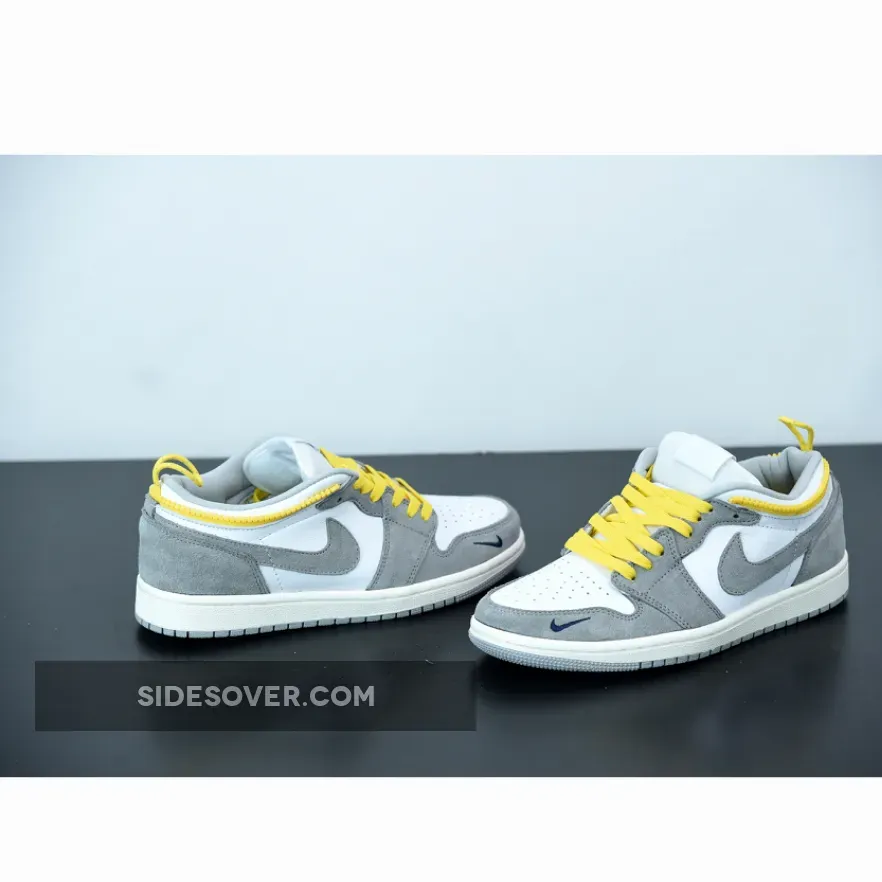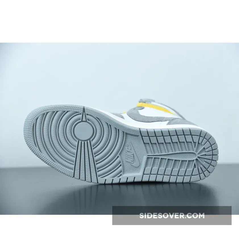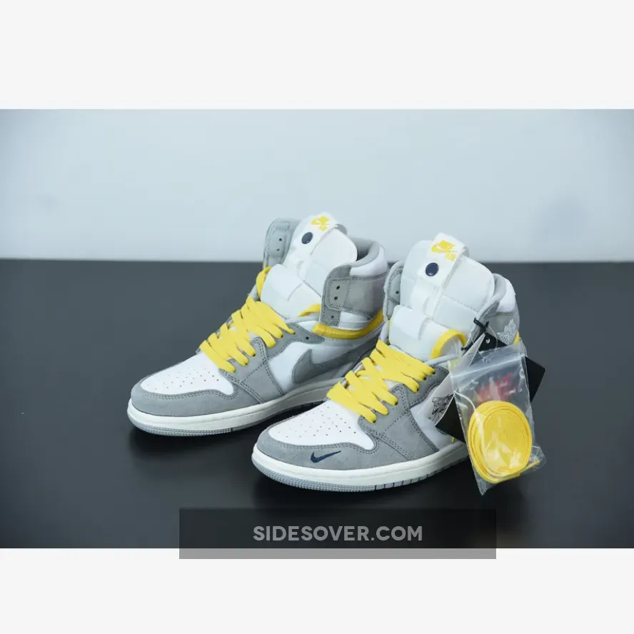 this Air Jordan 1 Switch comes dressed in a White, Light Smoke Grey, Sail, and Tour Yellow color combination. Breaking this pair down, it comes constructed with suede and leather, while White adorns the panels, collar, toe, and Swoosh. Furthermore, Light Smoke Grey appears on the ankle, eyestay, forefoot overlay, Swoosh, and wraps the toe and heel. Yellow appears on the laces, zipper, and heel pull tab. Finally, a Black mini Swoosh on the toe, a Sail vintage-like midsole, and a Grey rubber outsole complete the look.