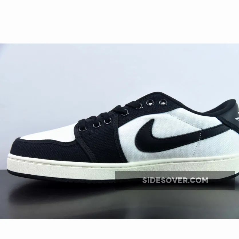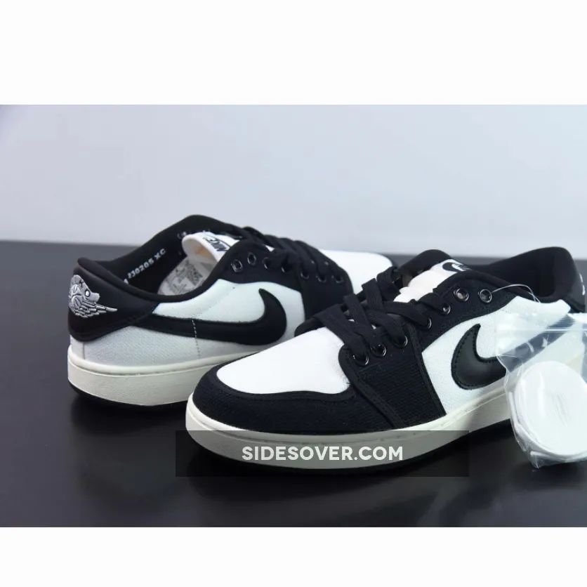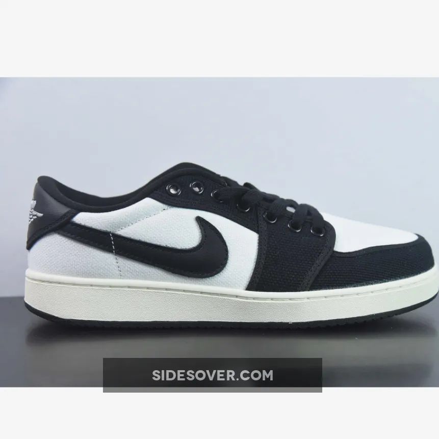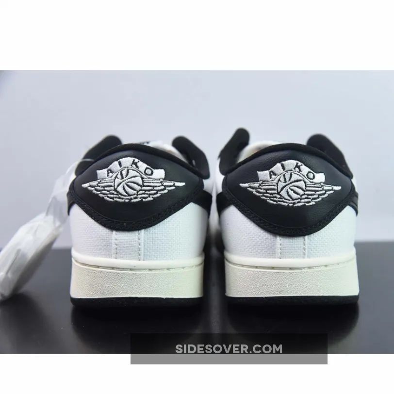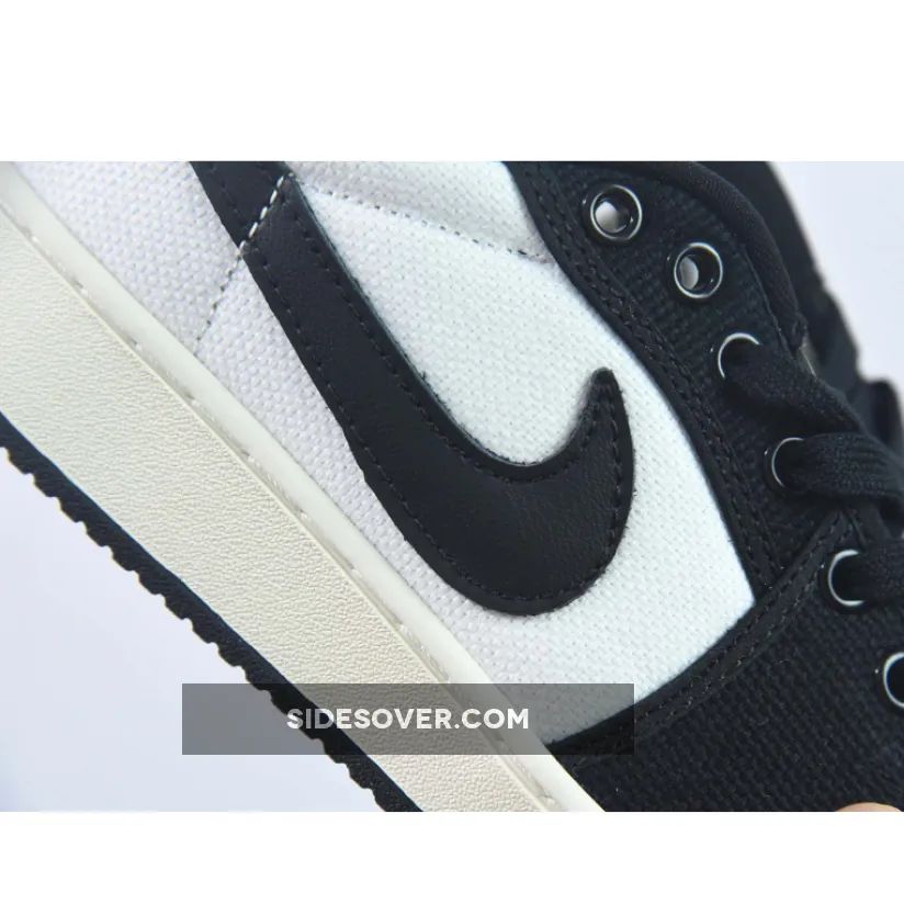 In terms of construction details, this AJ1 KO does not deviate significantly from its previous iterations. This offering of the Air Jordan 1 KO Low comes constricted in a full White and Black canvas base with Black leather Swooshes and heel overlay. The canvas overlays on the toe cap, the mudguard and the eye stay panels are also in black, just like the laces and mesh sock liner. and “Nike” logos on the tongue tags and insole with White Wings embroidery on the heels. Meanwhile, white claims its rightful place on the AJ KO emblems. A sail-coloured midsole and a black rubber outsole cap off the look of this shoe.