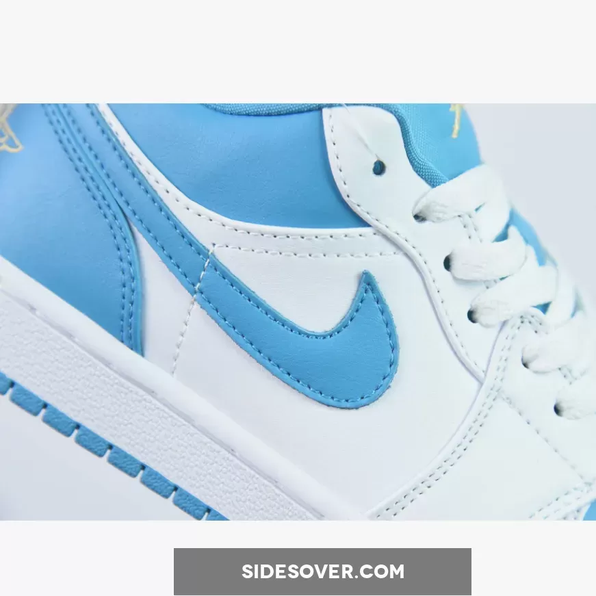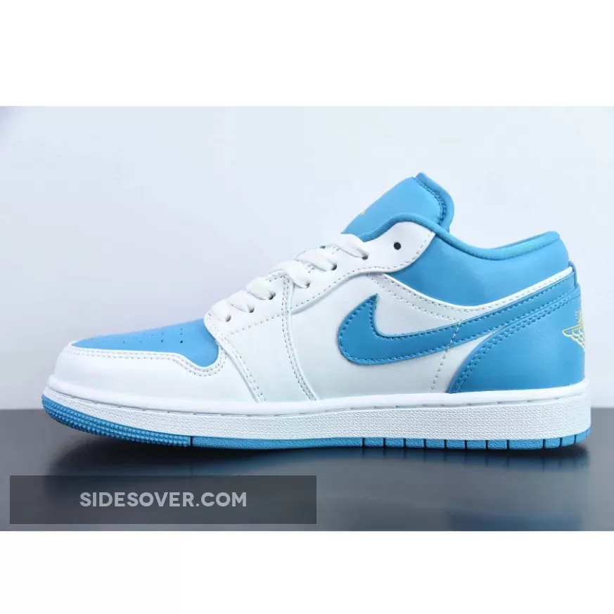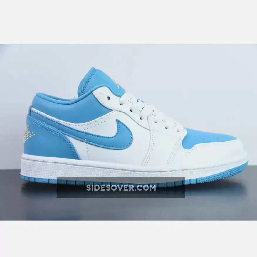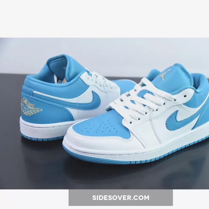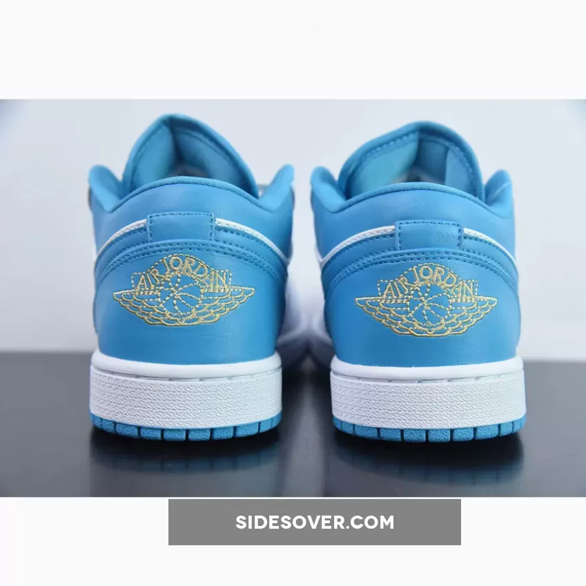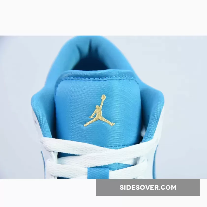 Dressed in a Aquatone, Celestial Gold, and White color scheme. This offering of the Air Jordan 1 Low comes constructed in a full leather build with mesh tongues and lining. It features a White and Aqua base with Gold branding.