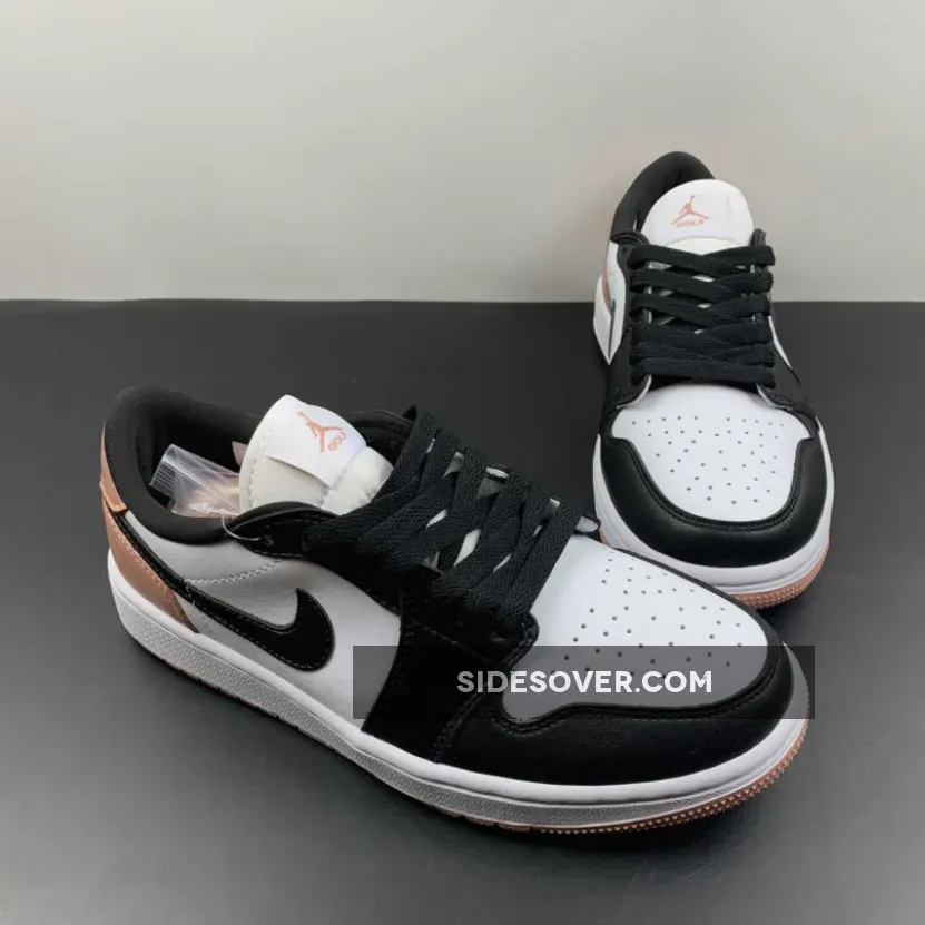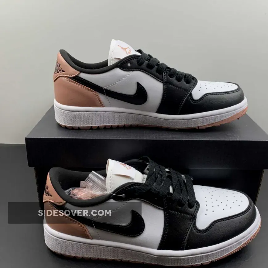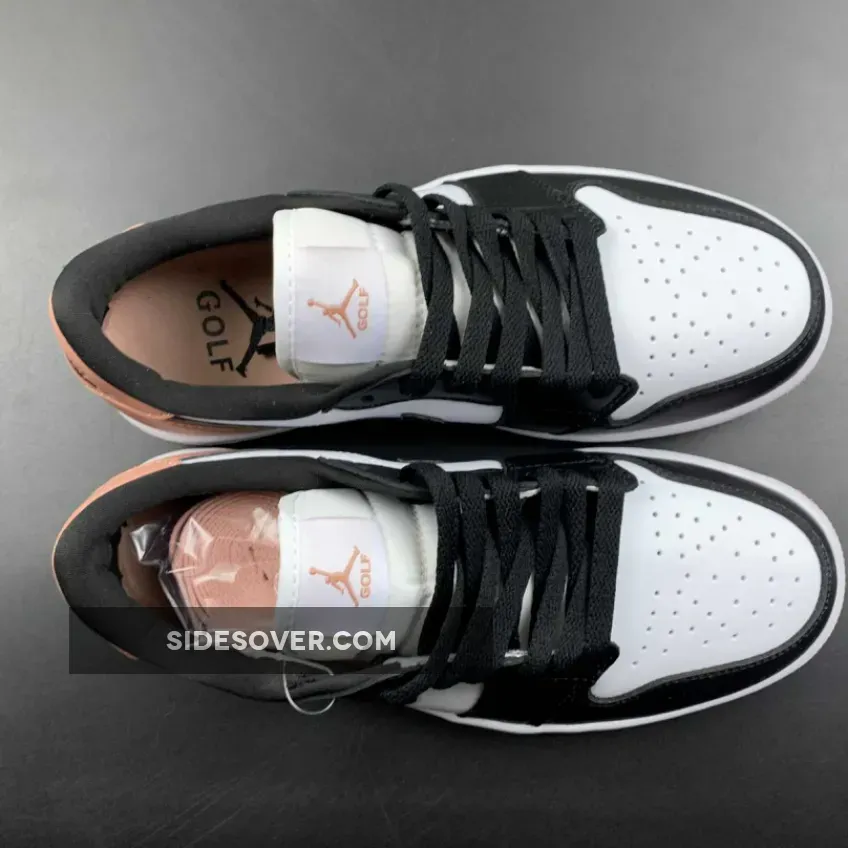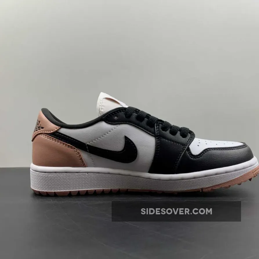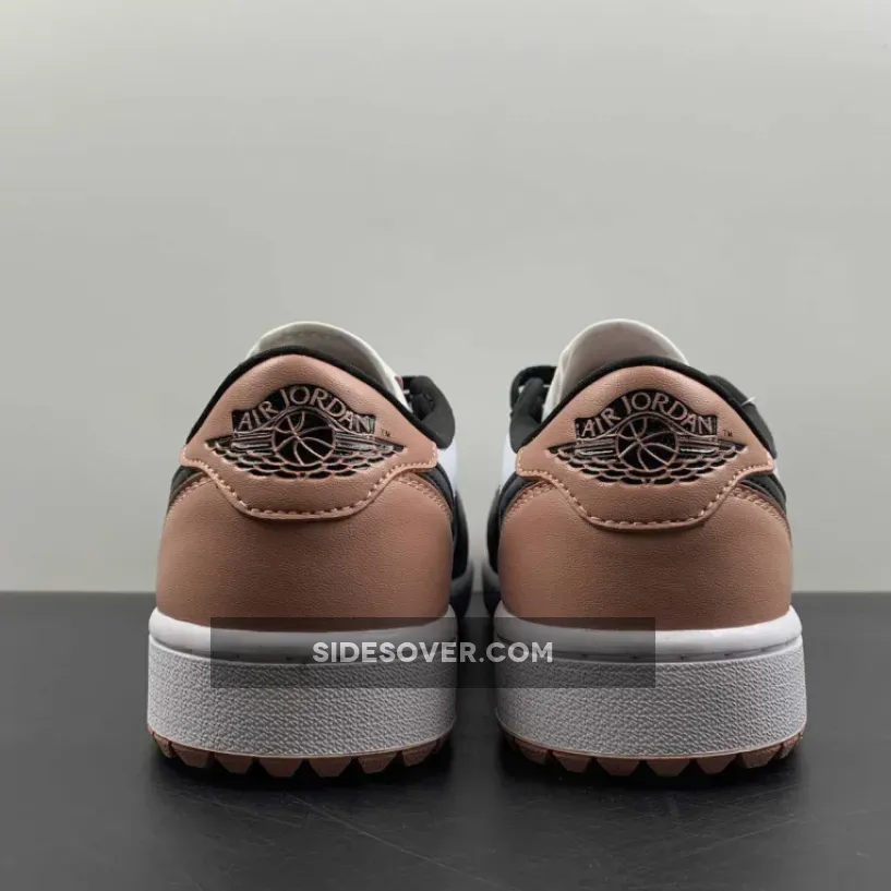 The Jordan Brand’s Air Jordan 1 golf line built with soles designed for the fairway, the Air Jordan 1 Low Gold, has a new offering featuring a black toe and a touch of rose. Get ready for the Air Jordan 1 Low Golf Rust Pink. This low-cut AJ1 Golf starts out with a “colourless” smooth leather base showing on the perforated toe box and the mid-panels. The smooth leather overlays on the toe cap, the mudguard and eye stay panels are all in contrasting pitch black. The laces, signature profile Swooshes on both the medial and lateral mid-panels and the plush sock liners all jump on the black bandwagon. A lovely shade of Rust Pink enters the picture on the leather heel tabs showing off black embossed “Wings” logos, the heel counters, the Jumpman branding on the tongue labels and the insoles.