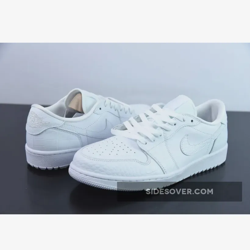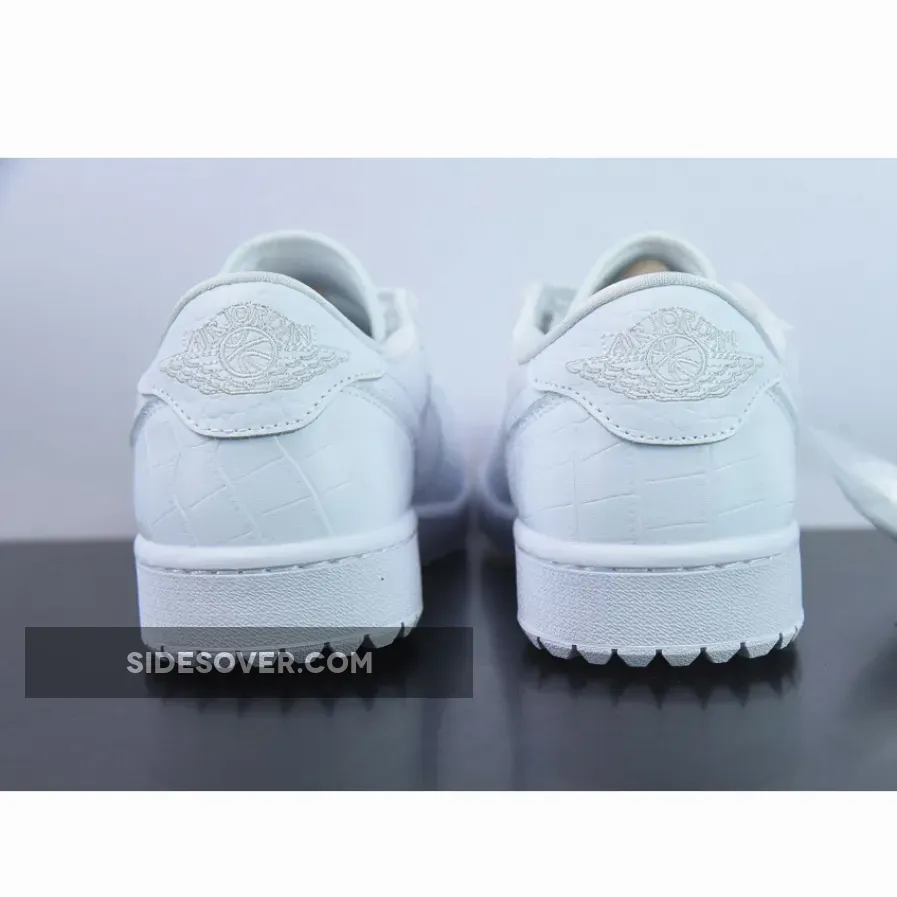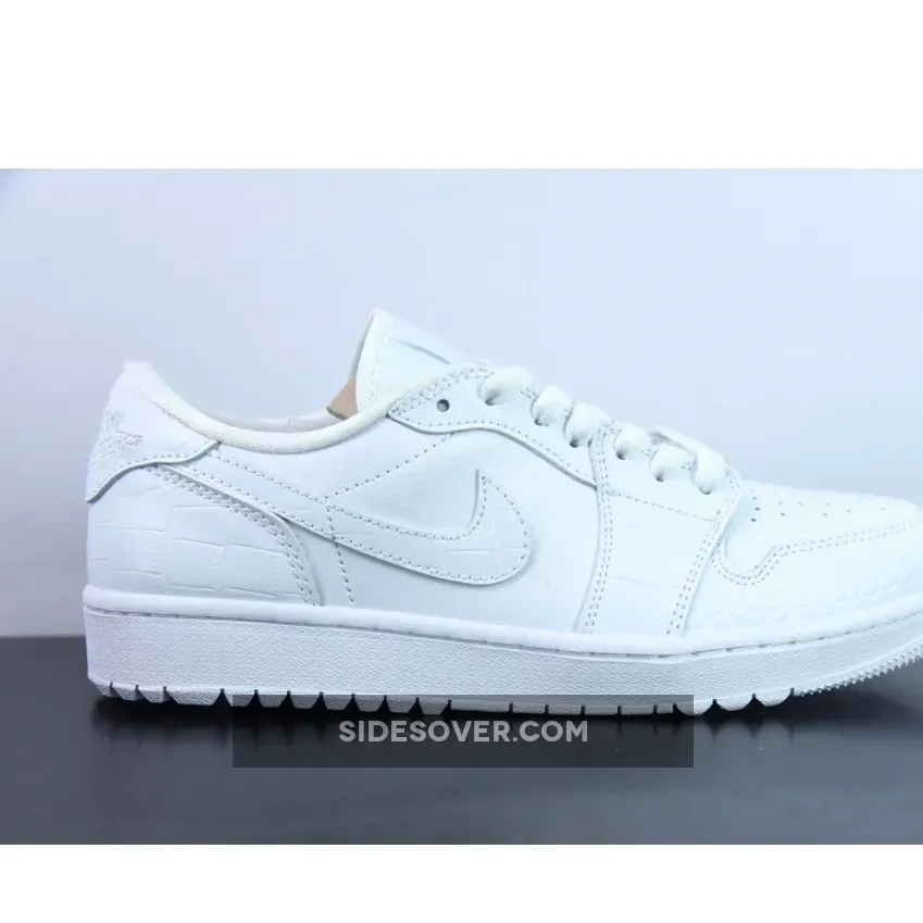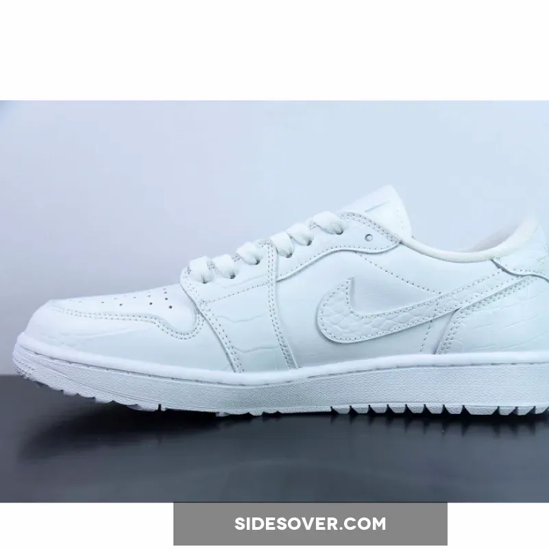 The Air Jordan 1 Low is back in its golf makeup, now sporting a mock-crocodile upper to take a walk on the premium side. The a triple white look, using different materials to bring contrast. White leather on the base with faux Croc skin in white seen on the overlays and Swoosh. The tongue tag is seen in white with the Jumpman and GOLF branding in grey and the Wings logo stitched on the heel in white. Smooth leather can be found on the sidewall and toe box, forgoing the crocodile texture seen on the other panels, providing the flexion needed for the upper to remain comfortable. The midsole has also been given the golfing update with its new tread, containing aggressive lugs that balance traction and pivoting, a key element to anybody’s game.