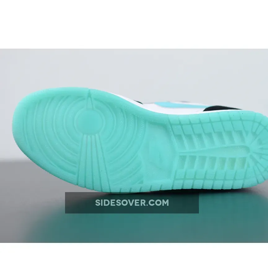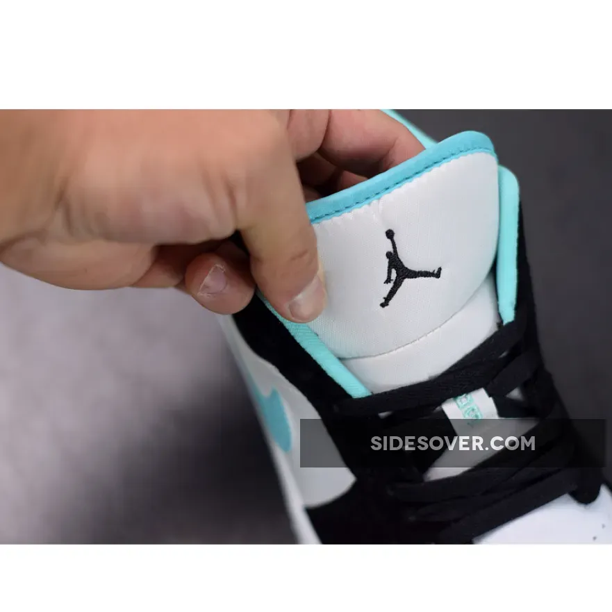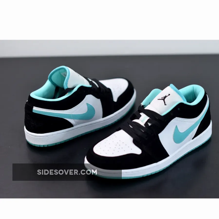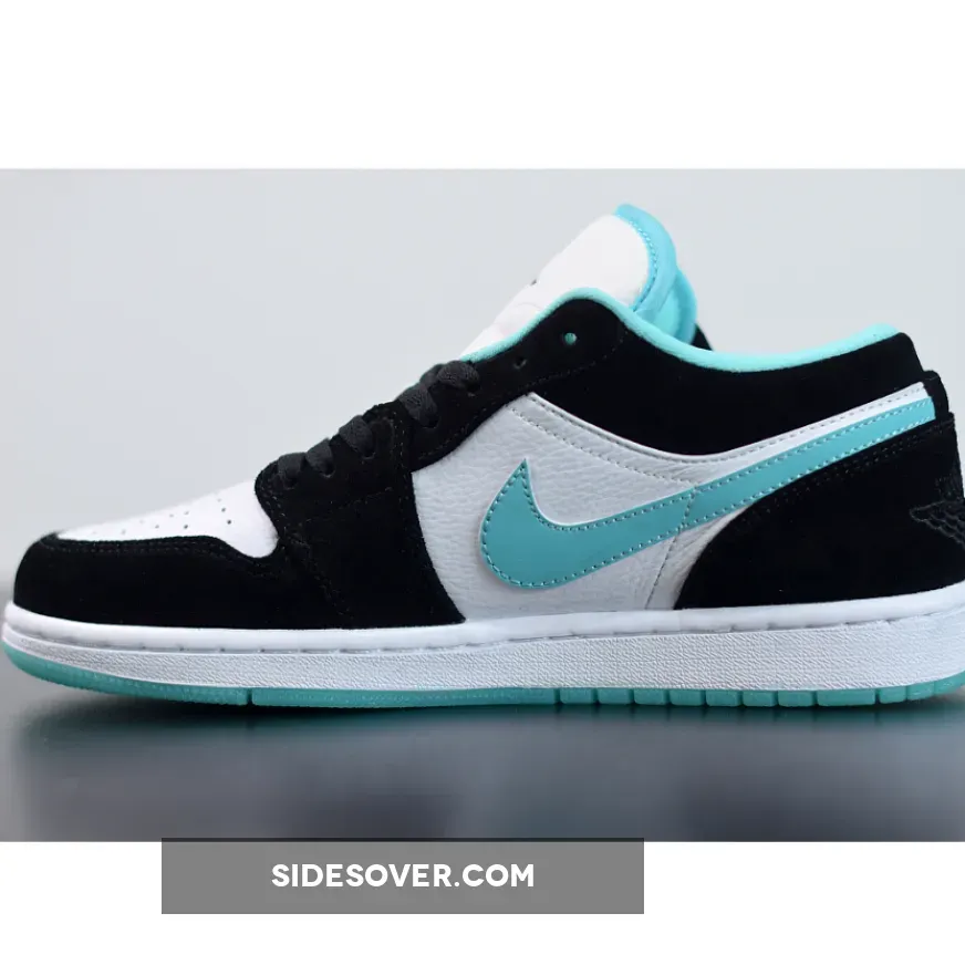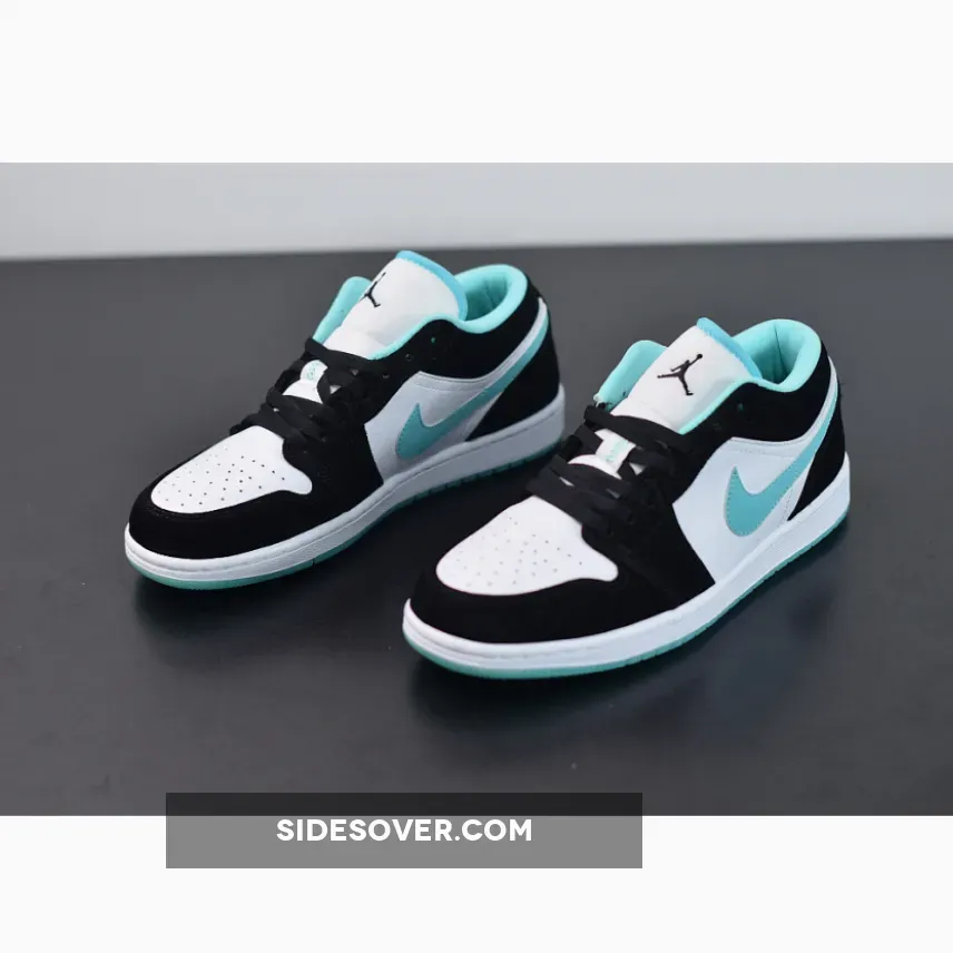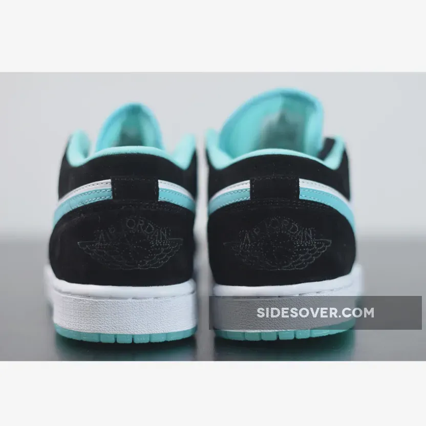 This offering of the low-top Air Jordan 1 features a White leather upper with Black nubuck overlays. Island Green accents coverer the tongue, interior, Swoosh logos, as well as the outsole completed with a White midsole and Black insoles.