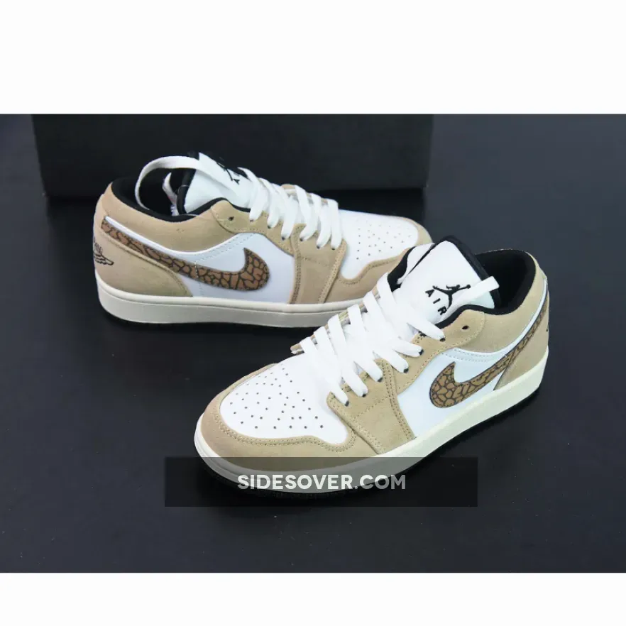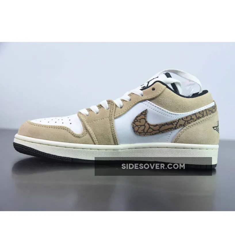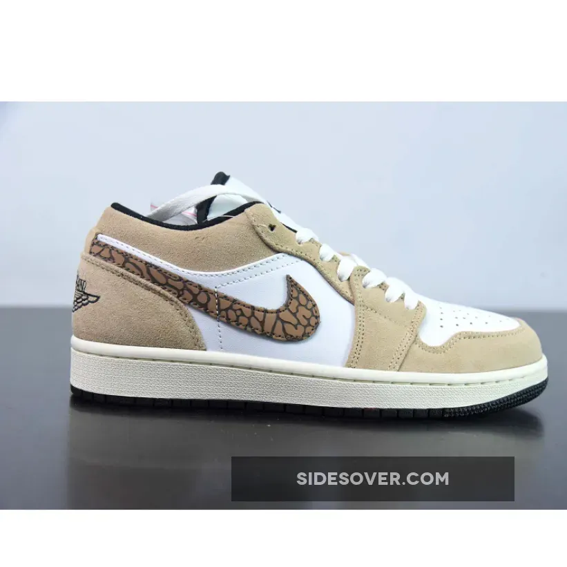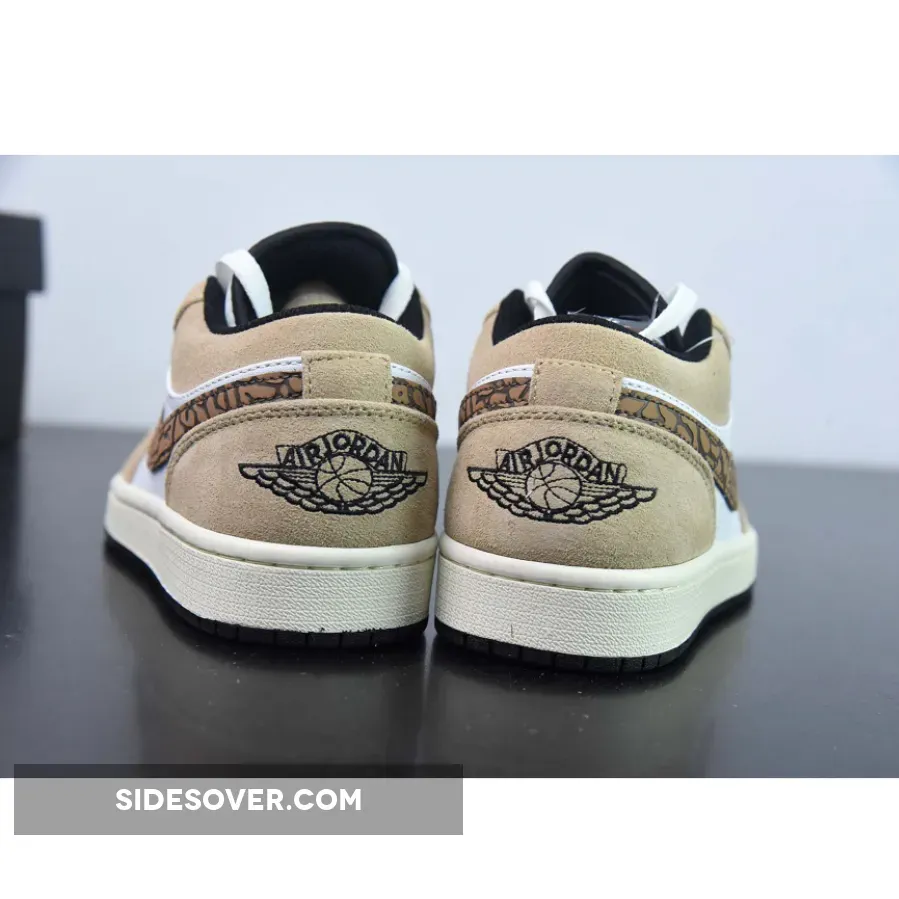 Dressed in a Hemp, Metallic Gold, White, Light British Tan, and Black color scheme. This offering of the Air Jordan 1 Low comes constructed in a mix of mesh, leather, and suede materials detailed with Brown elephant print Swooshes. A White midsole atop a Black rubber outsole completes the design.