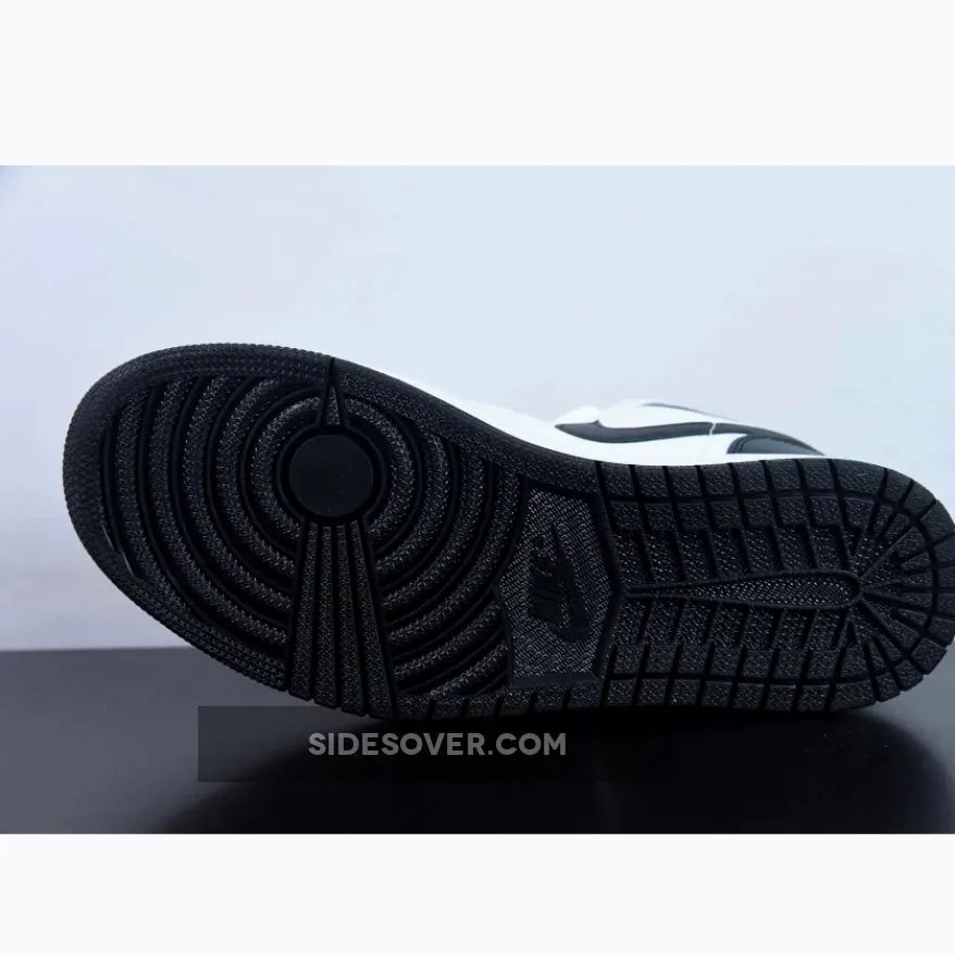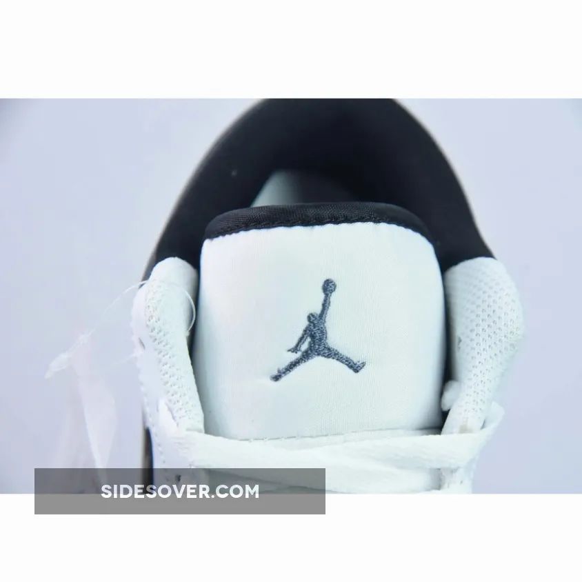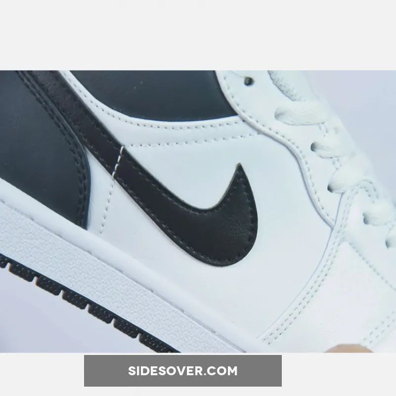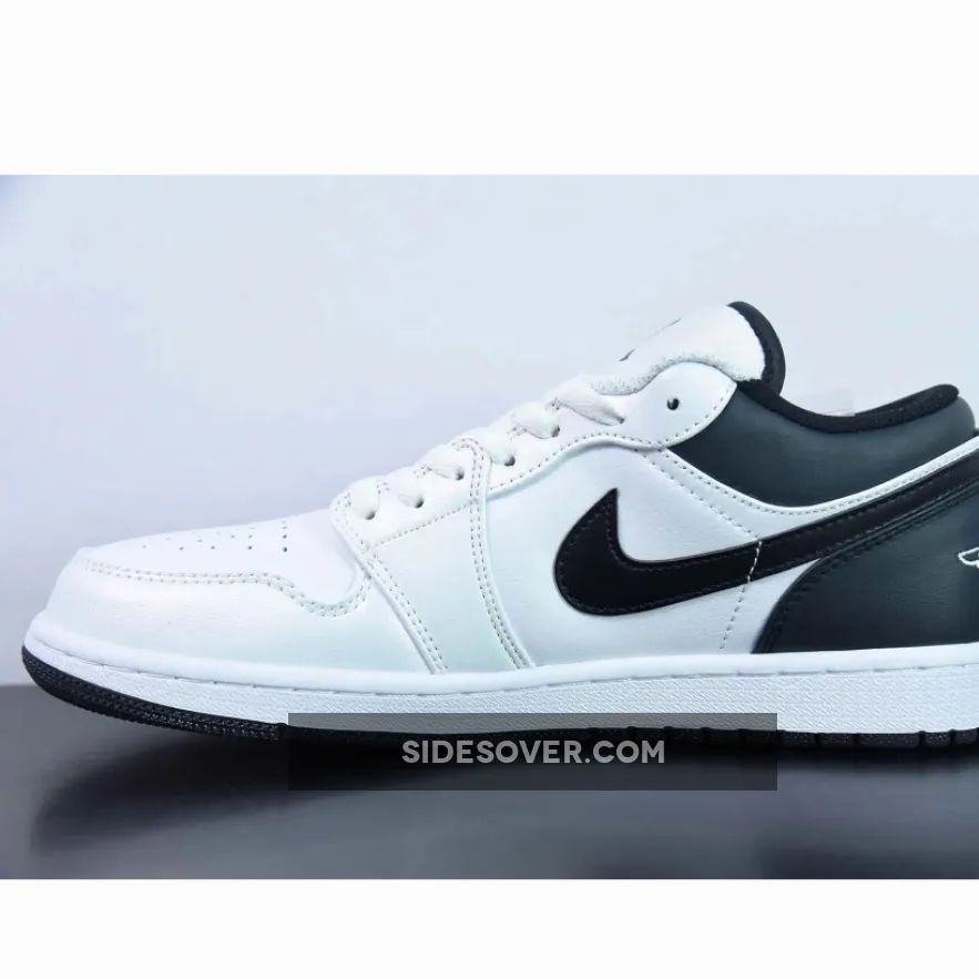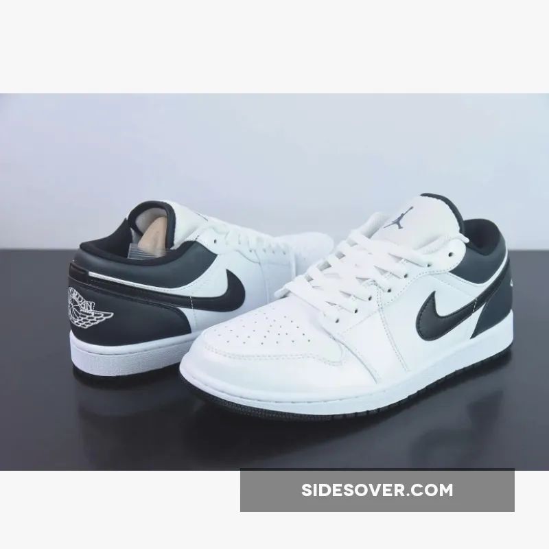 this Air Jordan 1 Low is primarily covered in white leather with contrasting black accents on the back half.Smooth white leather gracefully wraps around the toe box, mudguard, eyestays, and quarter panel.