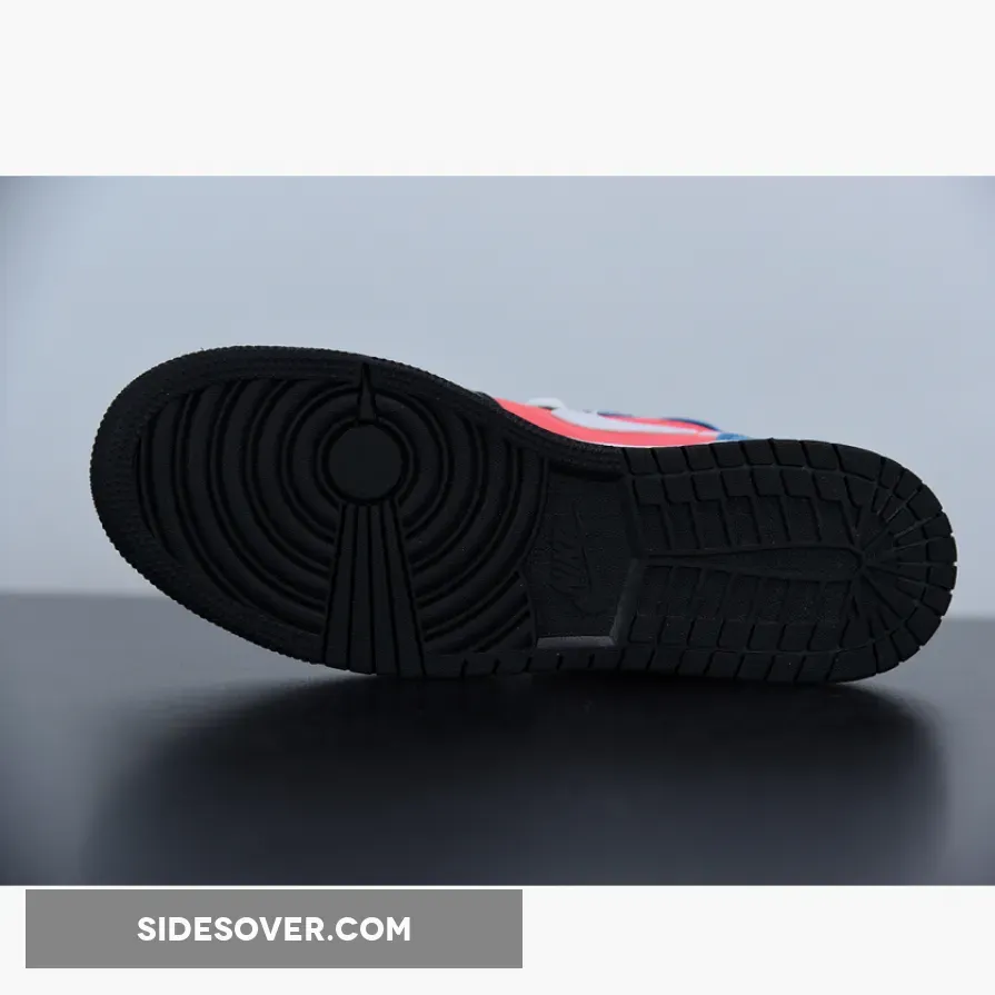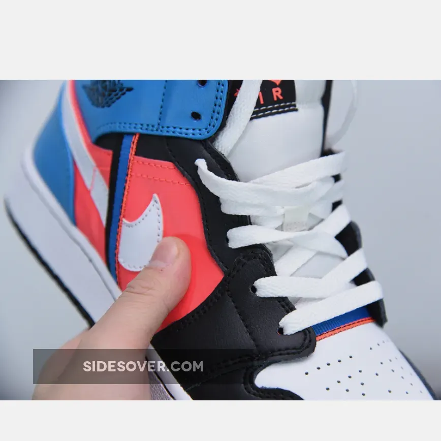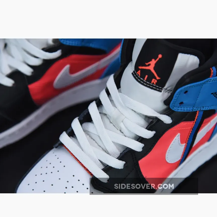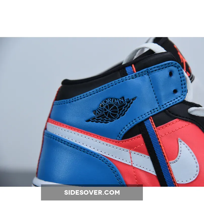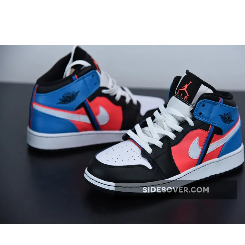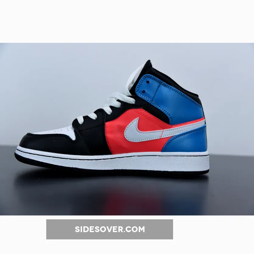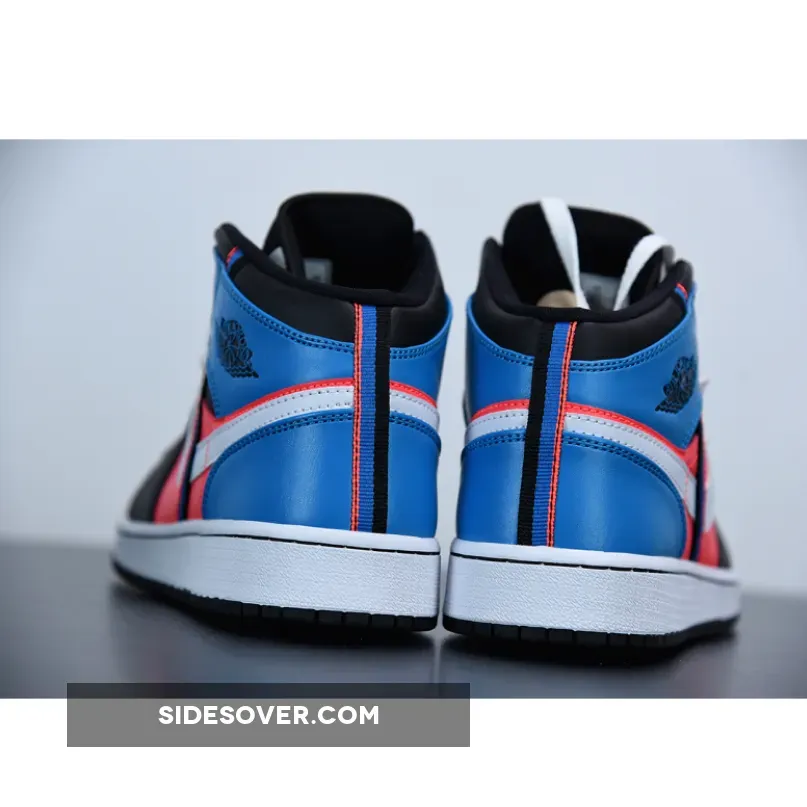 This offering of the mid-top Air Jordan 1 features White covering the toes, laces, tongue, and Swoosh logos, while having Black overlays up front, Crimson panels, and Blue in the rear. Tri-color ribbons are added on the lateral side, lower tongues, and heels completed with mismatched insoles, a White midsole atop a Black rubber outsole.