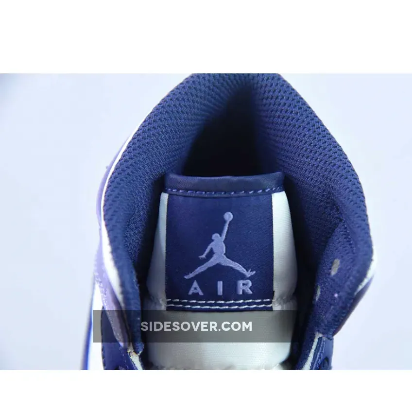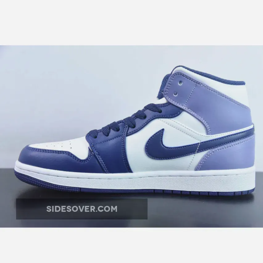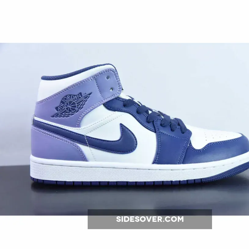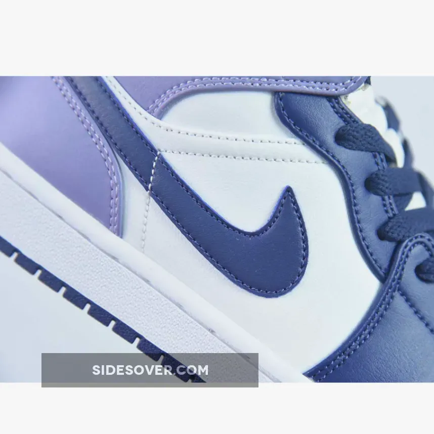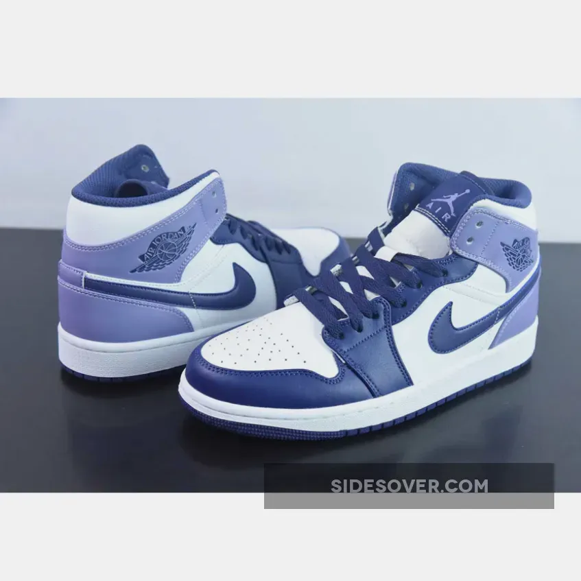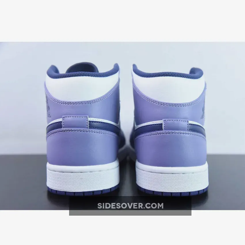 This offering of the Air Jordan 1 Mid features a full leather build on the upper with White serving as the base hue and two different shades of purple seen on the overlays.