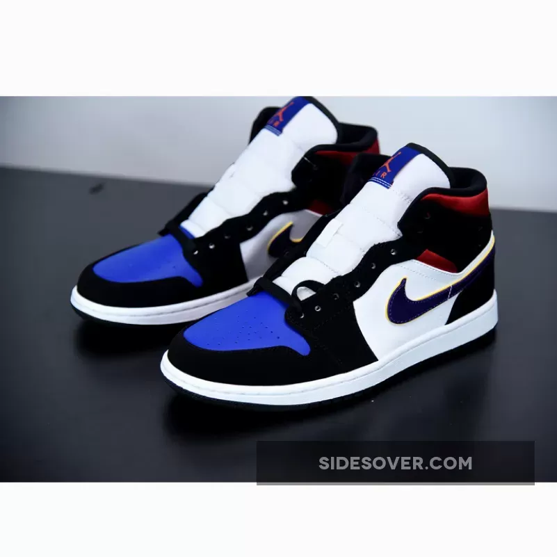 This mid-top Air Jordan 1 features the “Royal” toe box with Swoosh logos that nods to the LA Lakers. White side panels, Black nubuck overlays, Gym Red accents atop a White midsole and Black rubber outsole completes the design.