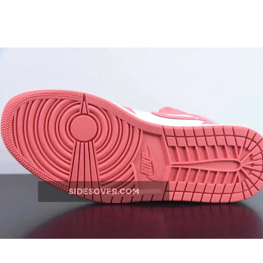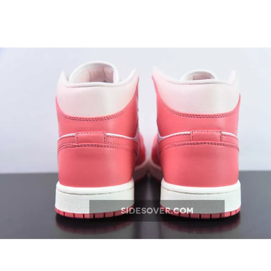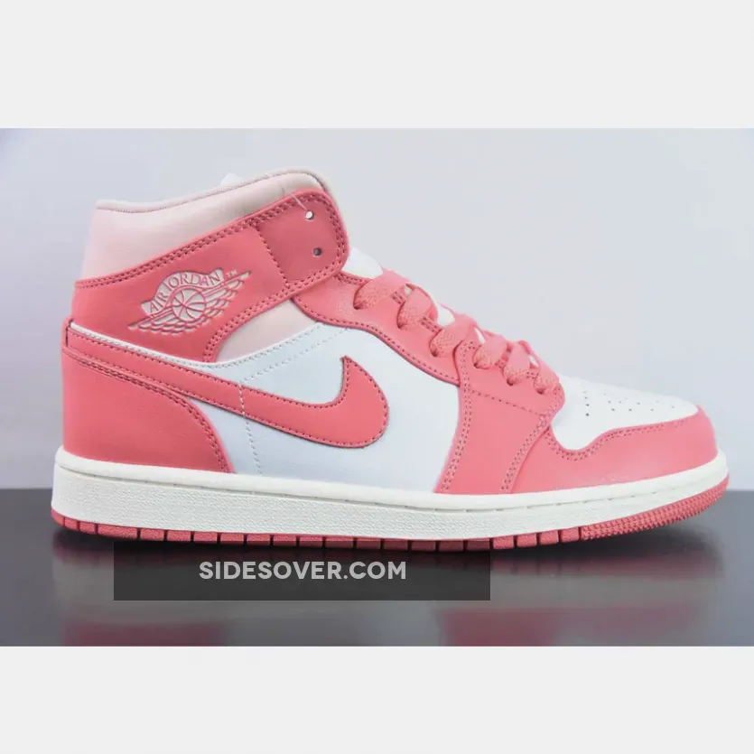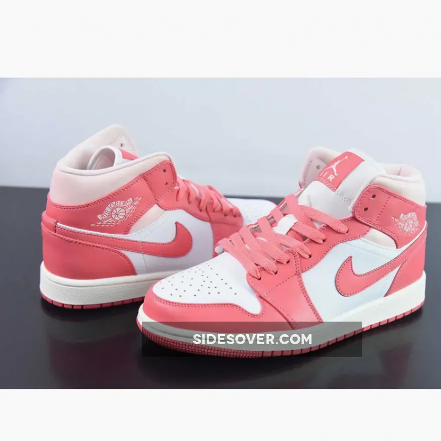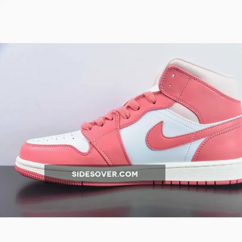 The Jordan 1 Mid Strawberries and Cream (Womens) is a womens sneaker that features a delightful two-tone design, combining a predominantly white colorway with lovely coral-pink accents. The materials used in the construction of the shoe include Calf Leather for the outer, which ensures a premium feel. The rubber sole enhances the shoes longevity and performance, while the fabric lining contributes to a comfortable and soft interior.