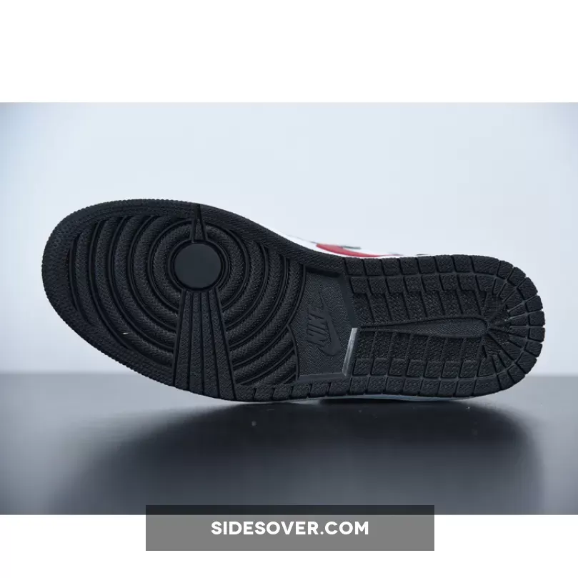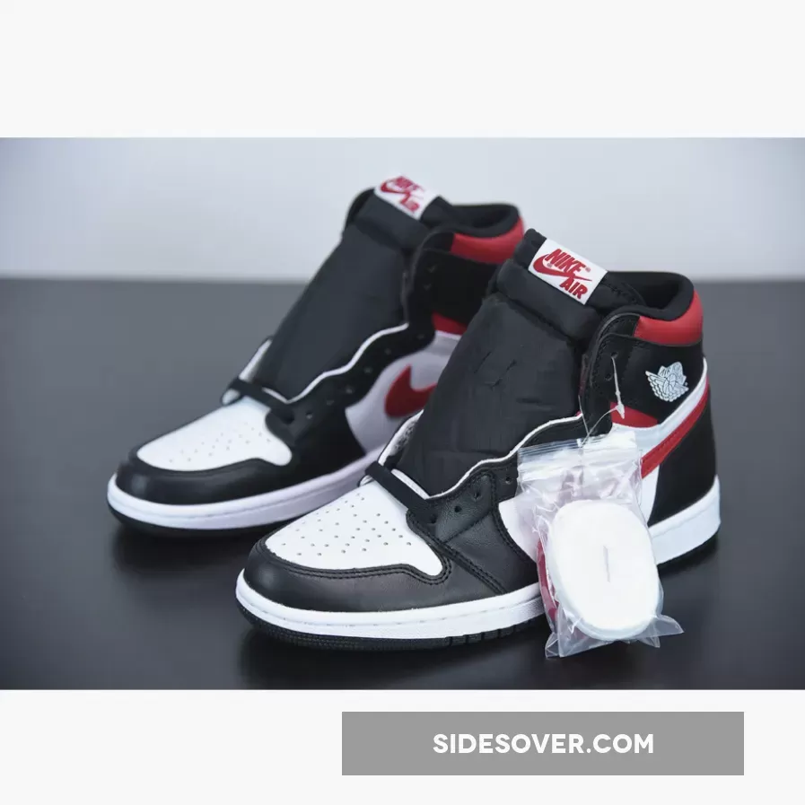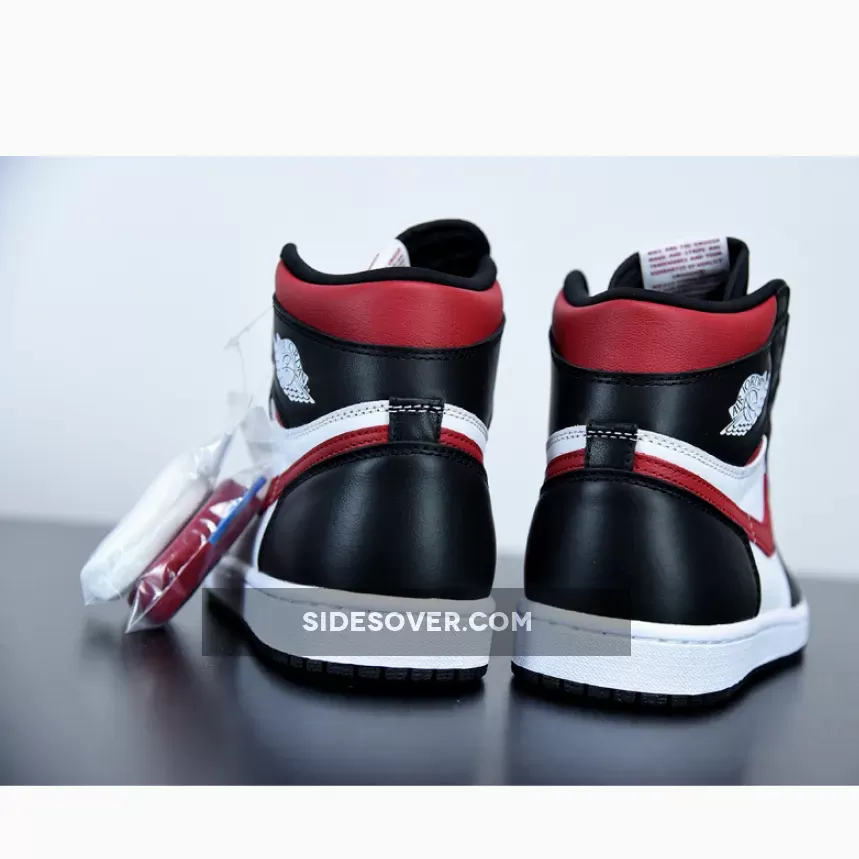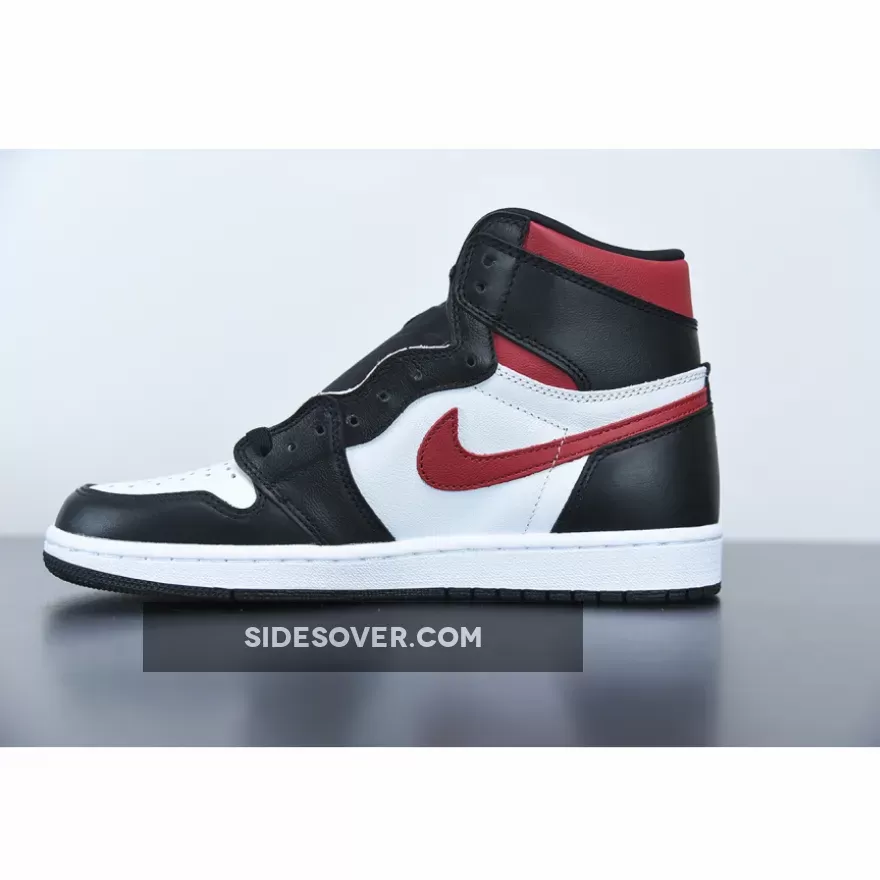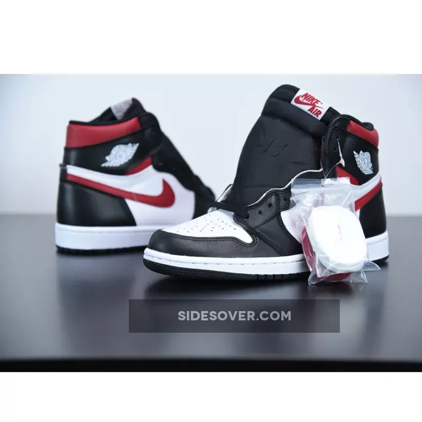 Dressed in a Black, White, Sail, and Gym Red color scheme. This Air Jordan 1 features a White leather upper with Black overlays and Red accents on the collar and Swoosh logos. Nike Air tongue labels and branded insoles completes the design.