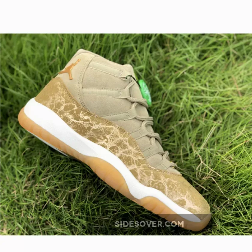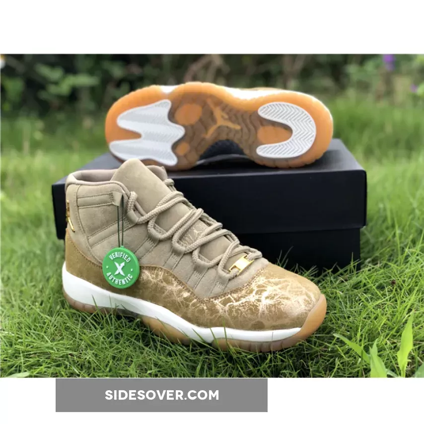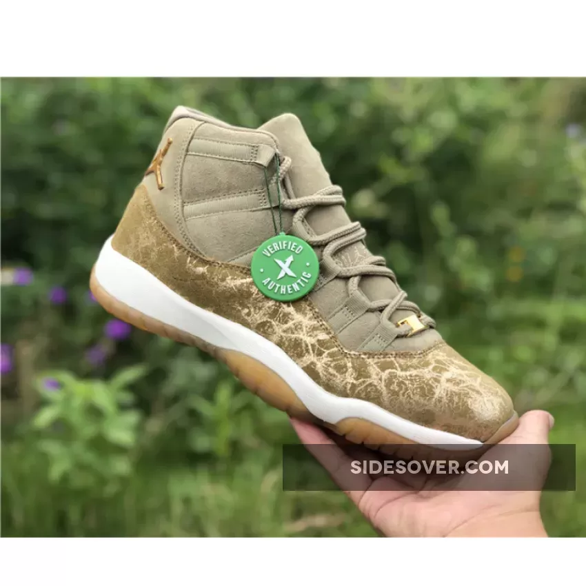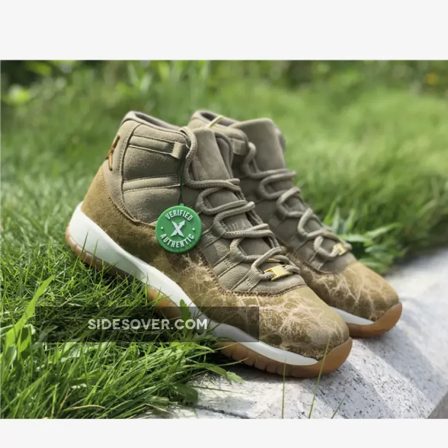 Dressed in a Neutral Olive, Sail, Gum Light Brown and Metallic Stout color scheme. This Air Jordan 11 features an Olive upper with a glitter texture replacing its patent leather overlay.