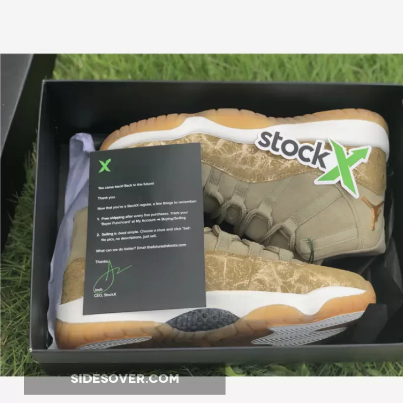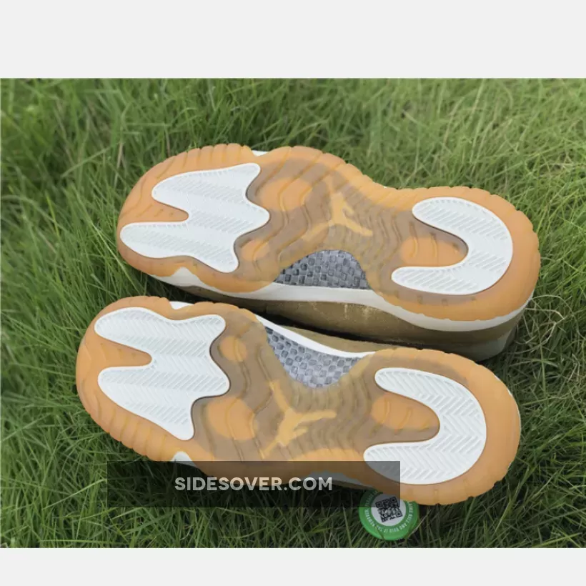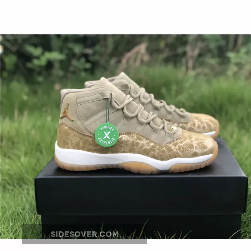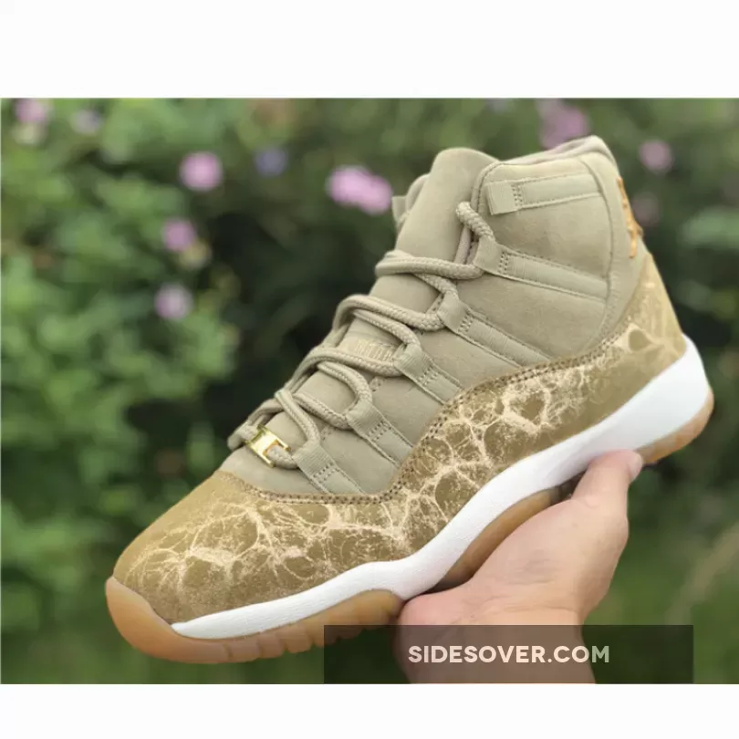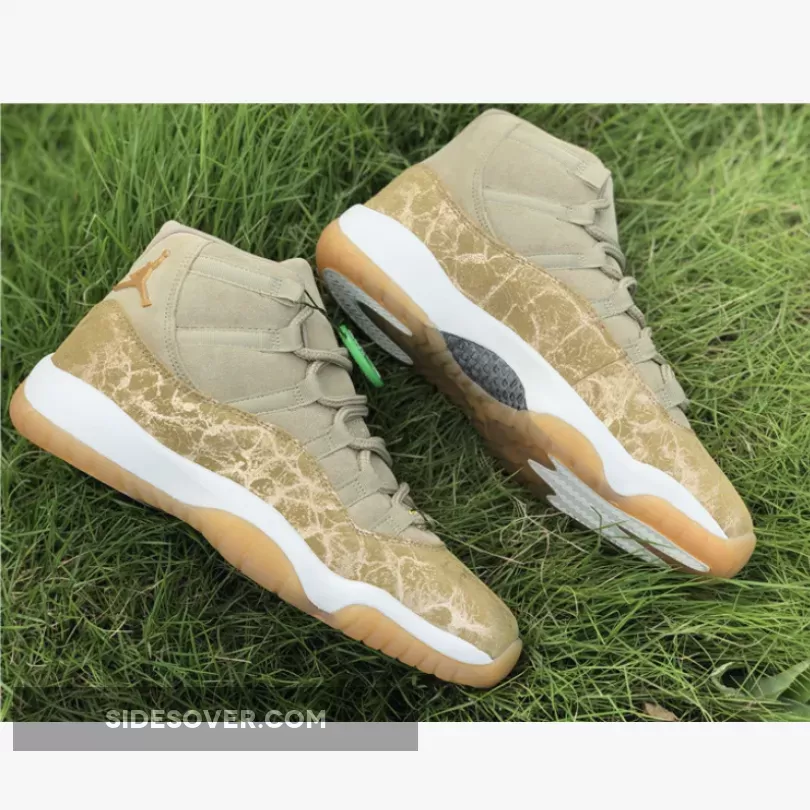 Dressed in a Neutral Olive, Sail, Gum Light Brown and Metallic Stout color scheme. This Air Jordan 11 features an Olive upper with a glitter texture replacing its patent leather overlay.