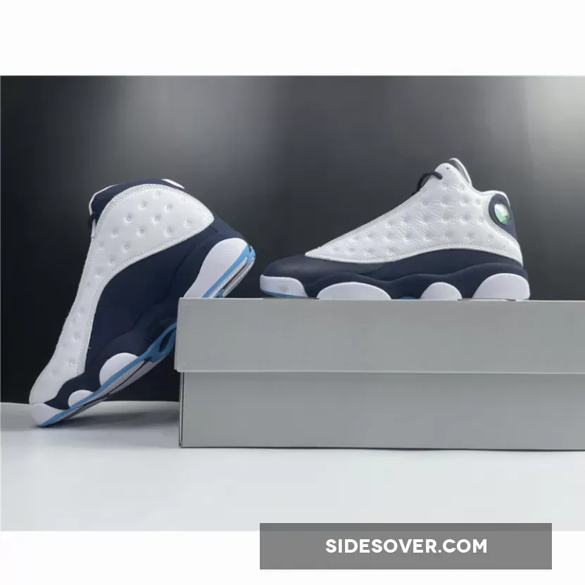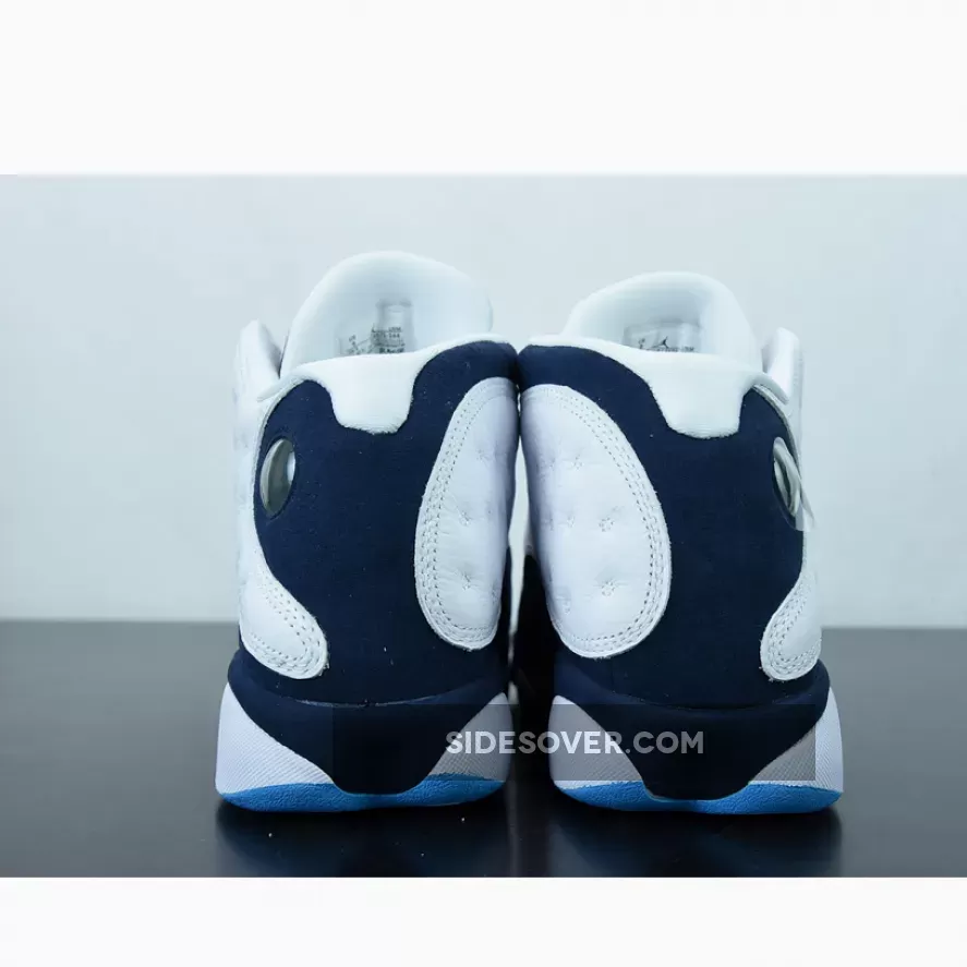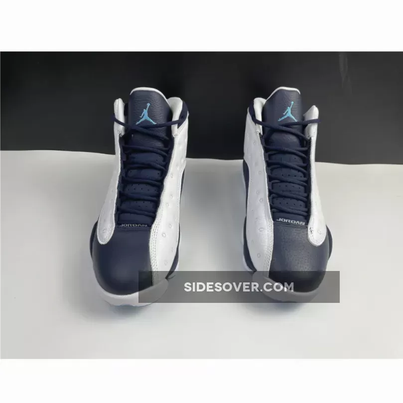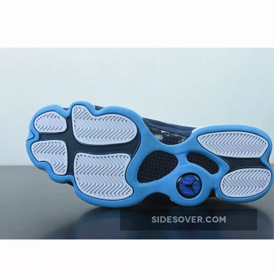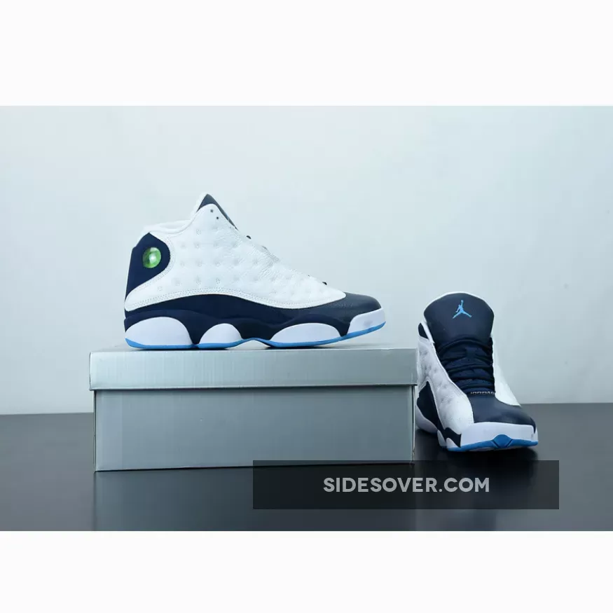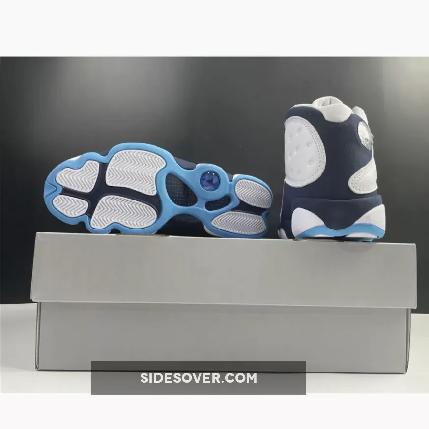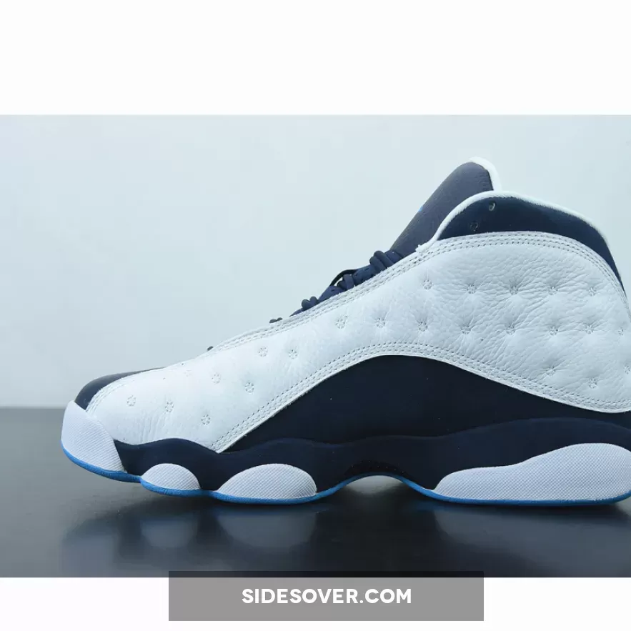 Dressed in a White, Obsidian, and Dark Powder Blue color scheme. This Charlotte Hornets-themed Air Jordan 13 features a White leather upper with Dark Blue underlays along with Light Blue accents on the tongue’s Jumpman logo and rubber outsole.