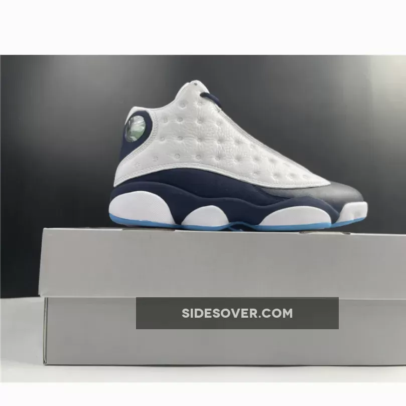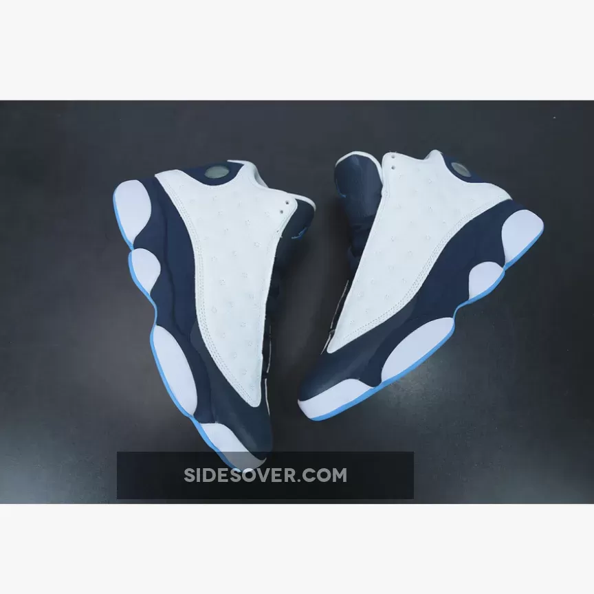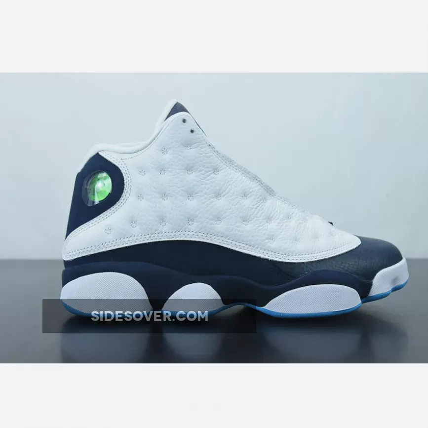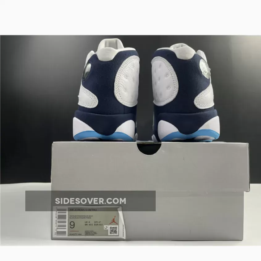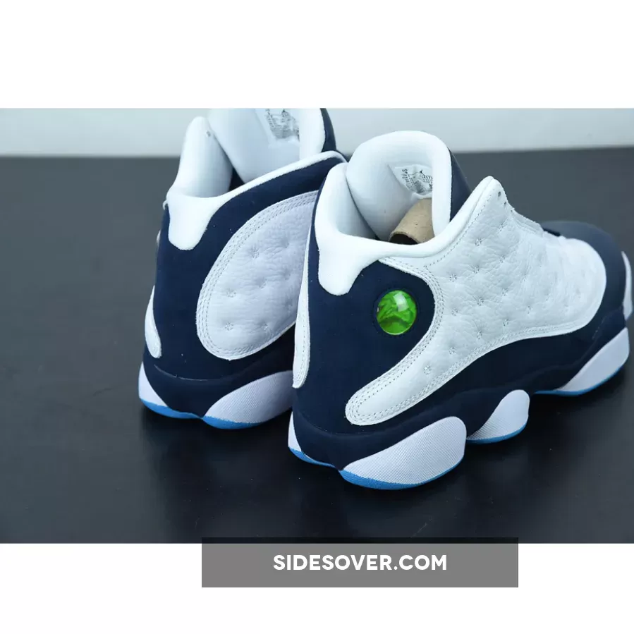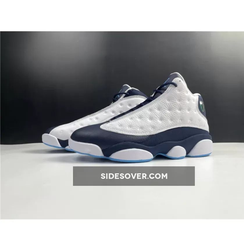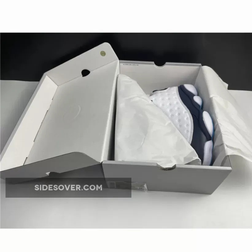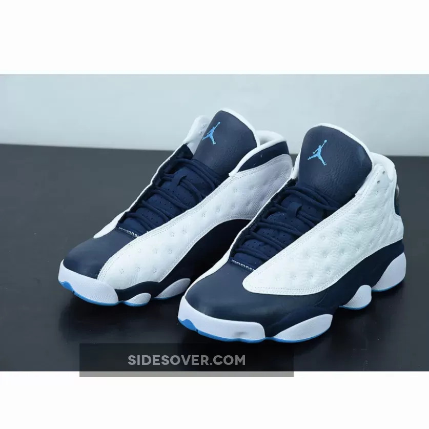 Dressed in a White, Obsidian, and Dark Powder Blue color scheme. This Charlotte Hornets-themed Air Jordan 13 features a White leather upper with Dark Blue underlays along with Light Blue accents on the tongue’s Jumpman logo and rubber outsole.