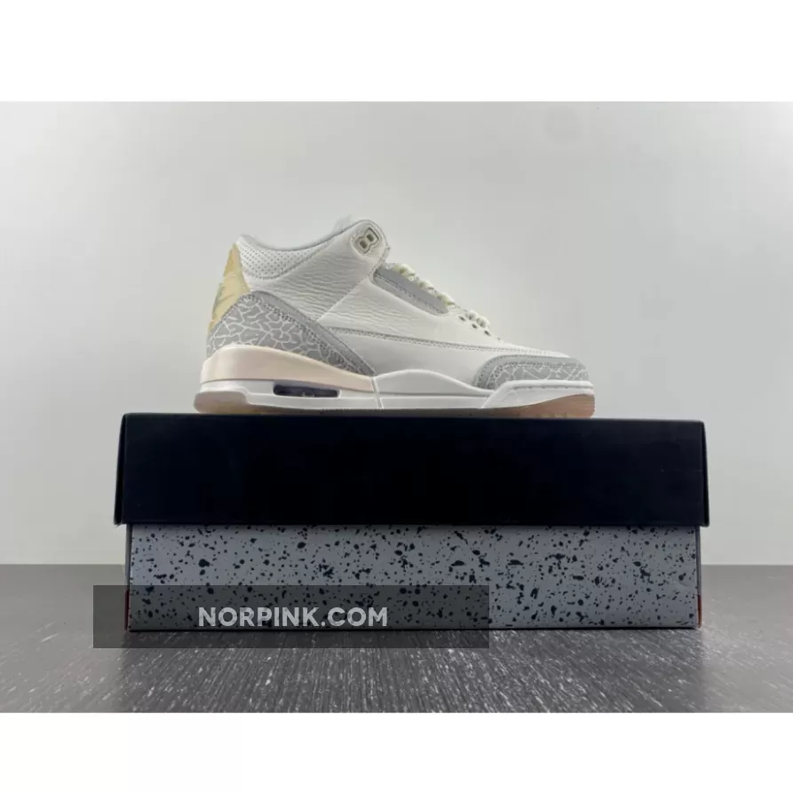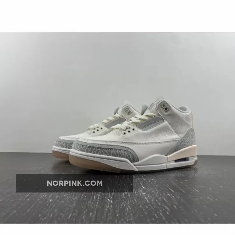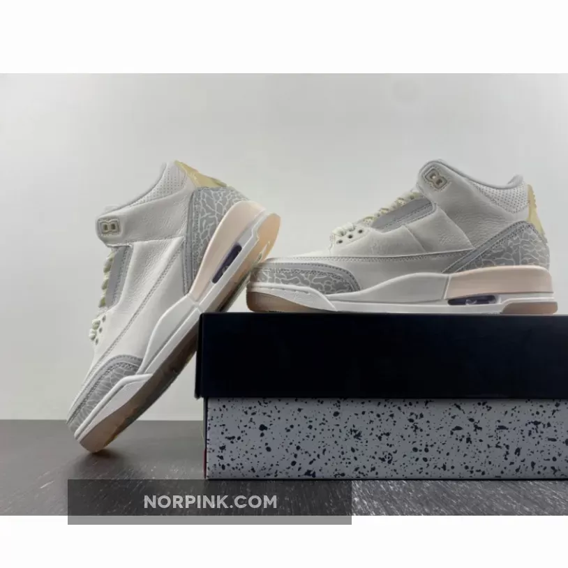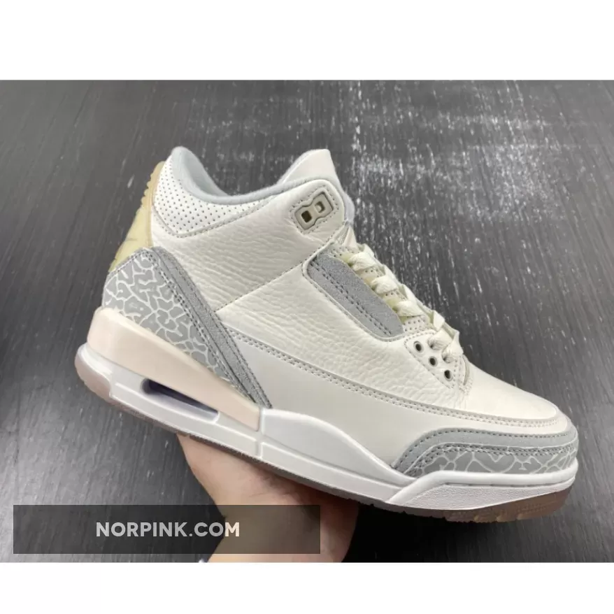 This particular rendition of the Air Jordan 3 showcases an elegant blend of Ivory, Grey Mist, and Cream hues. Its defining feature is the Ivory tumbled leather that envelops the upper, embellished with perforations encircling the collar. The smooth leather mudguards and suede overlays on the toe and heel introduce a tactile and visual contrast.