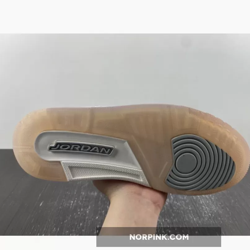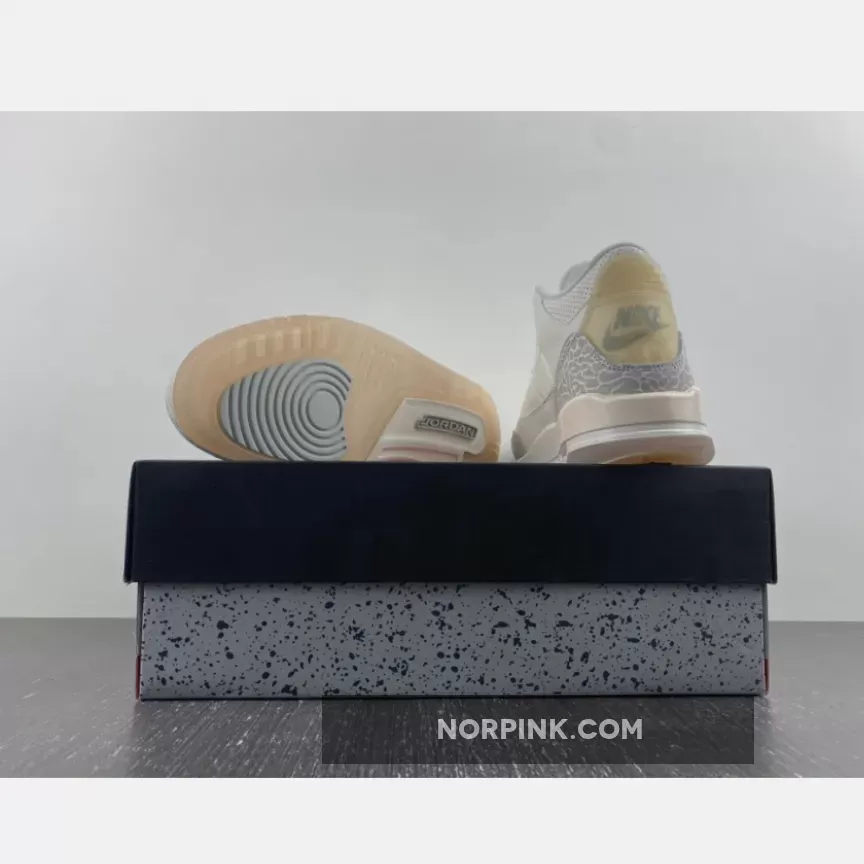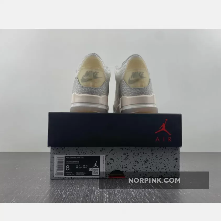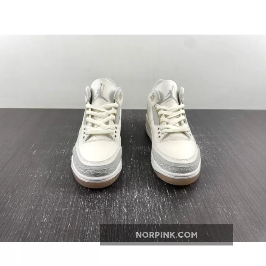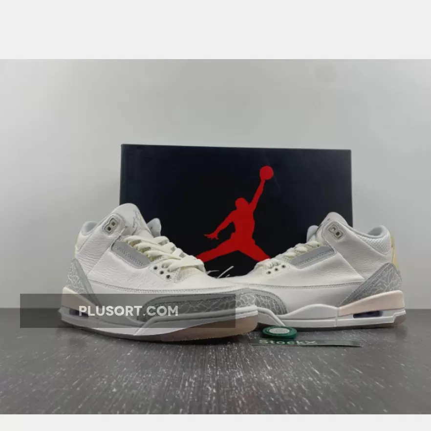 This particular rendition of the Air Jordan 3 showcases an elegant blend of Ivory, Grey Mist, and Cream hues. Its defining feature is the Ivory tumbled leather that envelops the upper, embellished with perforations encircling the collar. The smooth leather mudguards and suede overlays on the toe and heel introduce a tactile and visual contrast.