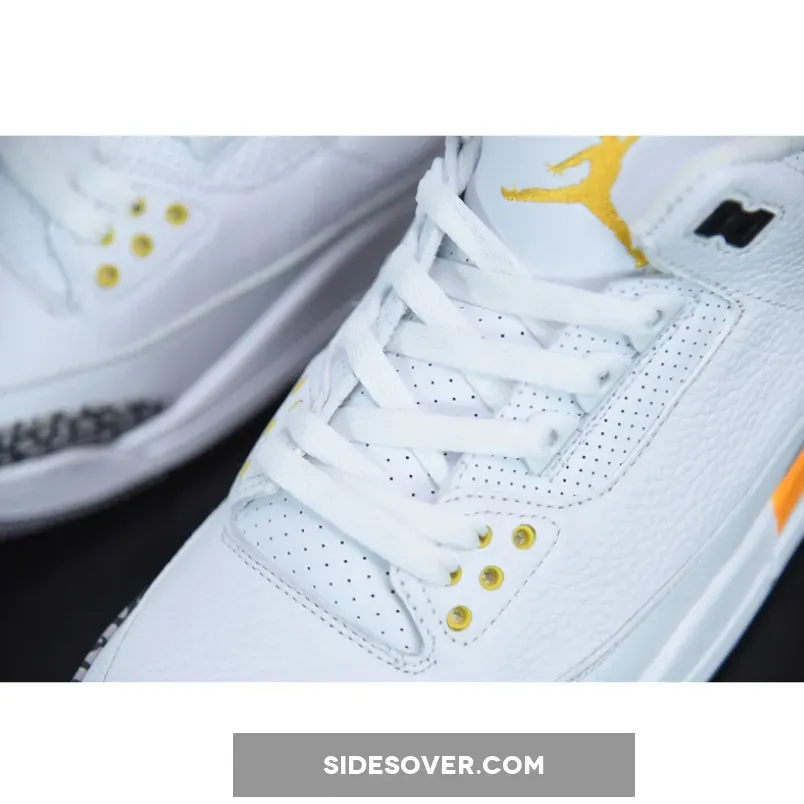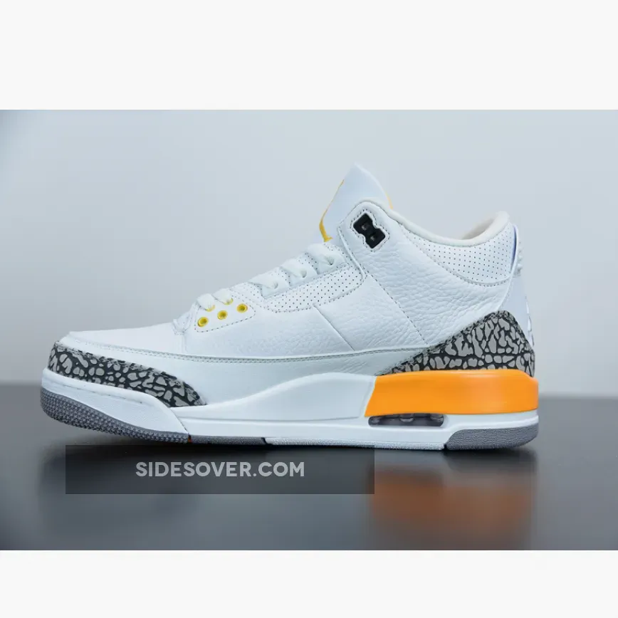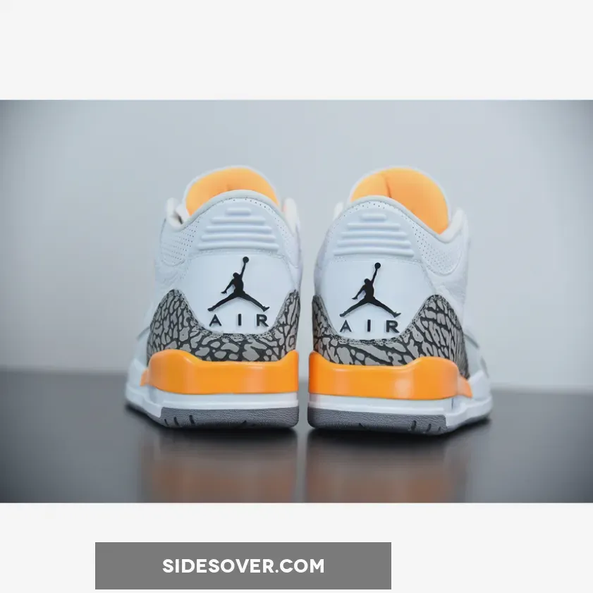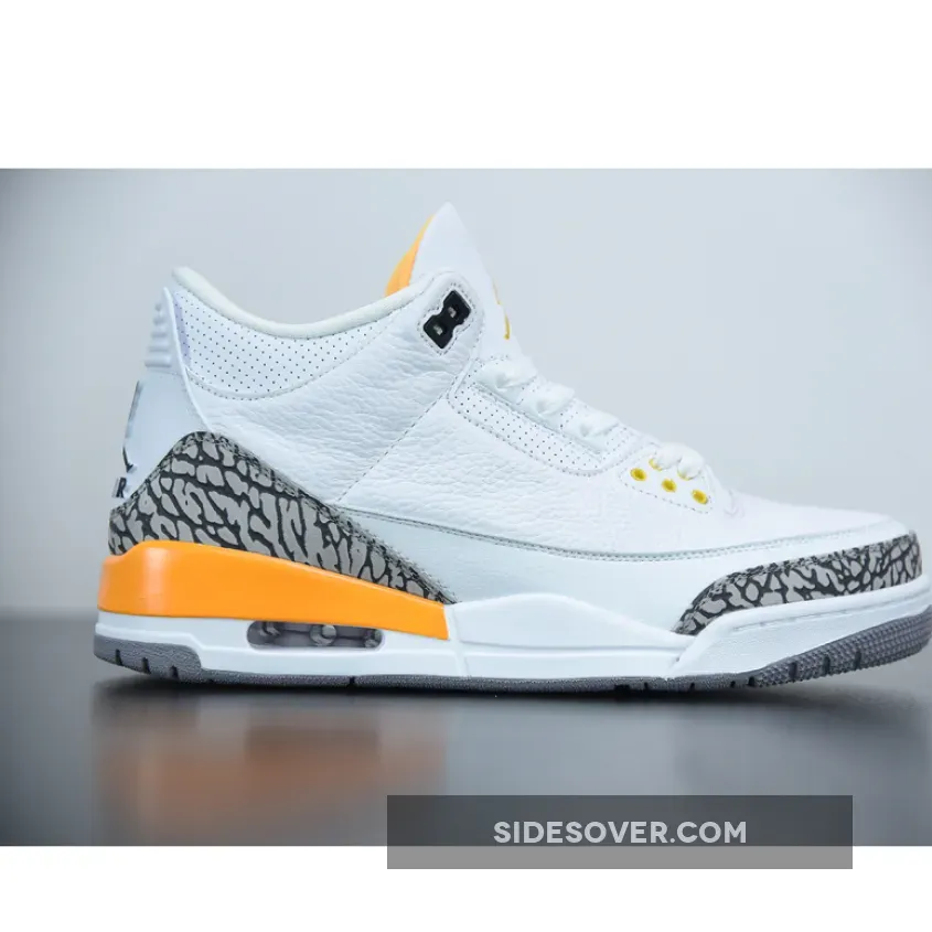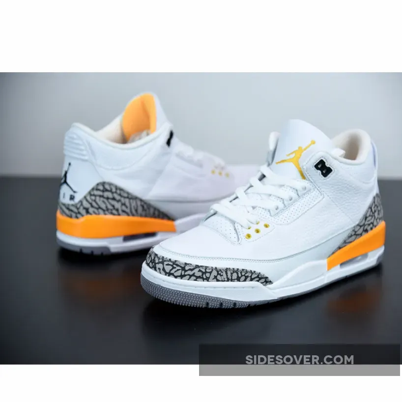 This Air Jordan 3 features a White tumbled leather upper with hits of Laser Orange throughout the sockliner, eyelets and midsole. Incorporating iconic elephant print on the toe and heel, this iteration is completed by a Laser Orange Jumpman “Air” hangtag. though branding at the rear and underfoot forgoes its beloved 1988-form in favor of retro styling.