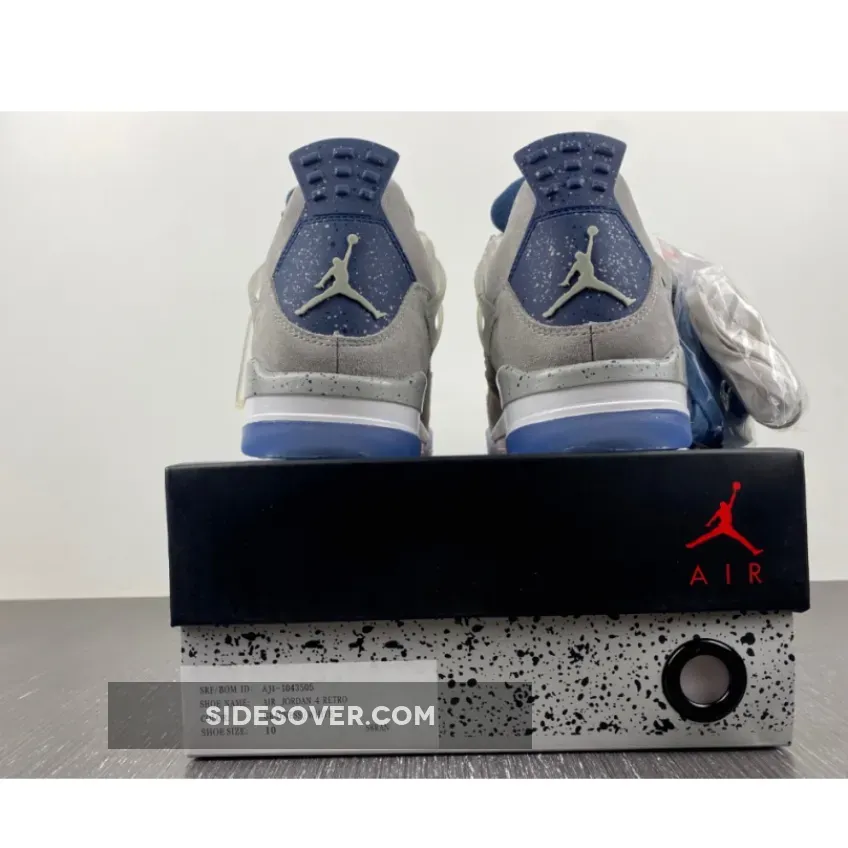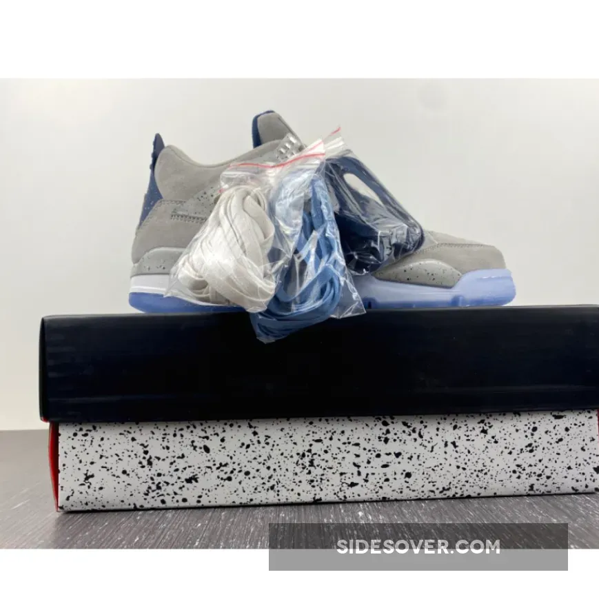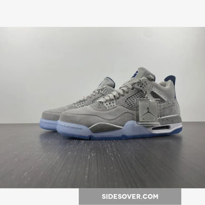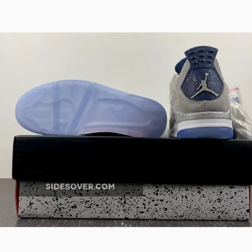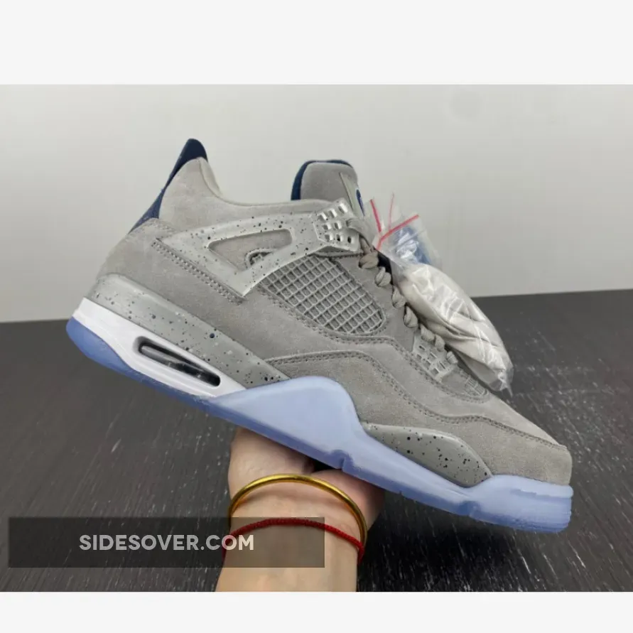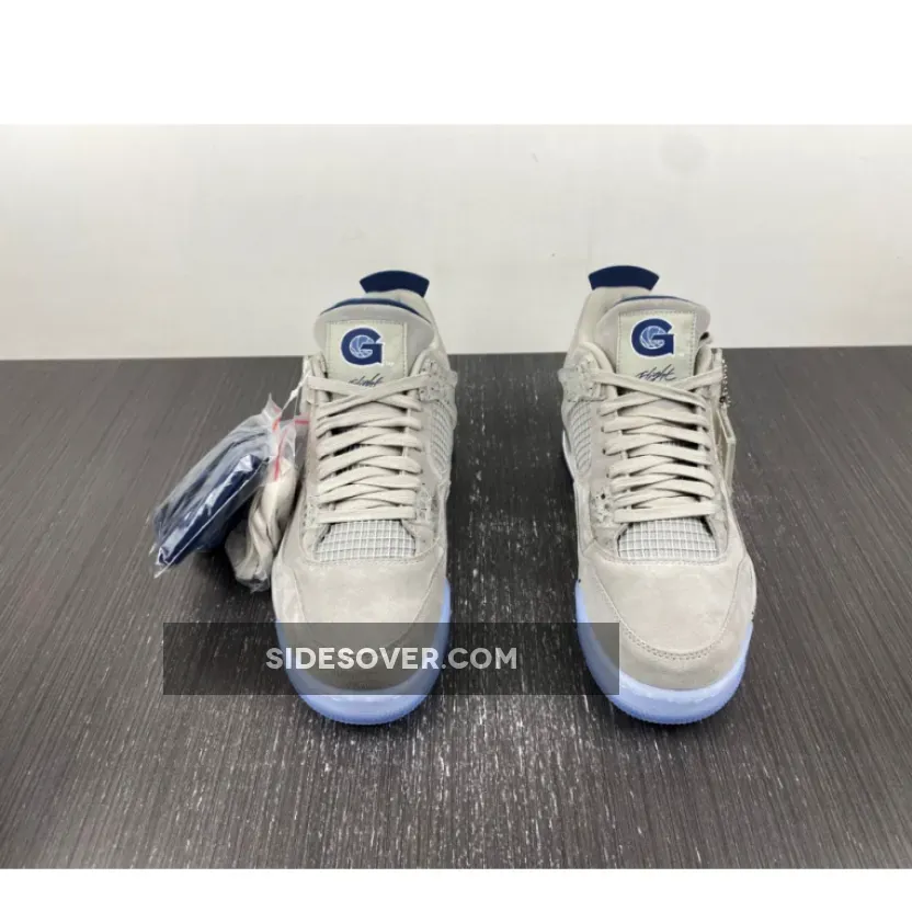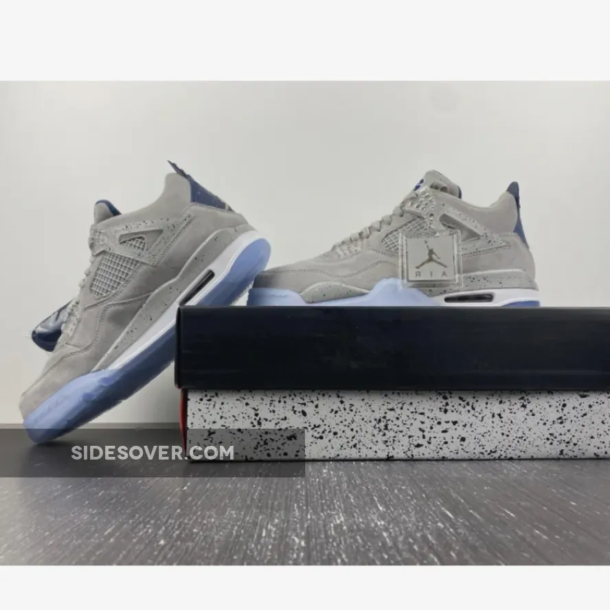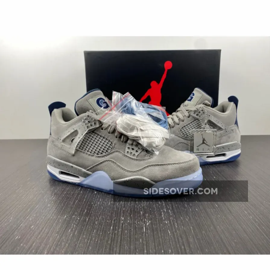An Air Jordan 4 Georgetown PE has surfaced, which pays special tribute to the Georgetown Hoyas basketball team. Exclusive to the players and staff, the model boasts light grey suede uppers that are detailed with semi translucent wings panels and eyelets, which are also covered with navy speckling. Other details include the Georgetown Hoyas logo on the tongue labels, navy colored behind the tongue and heel tabs that are speckled with grey, alongside a grey Jumpman logo. Finally, a white midsole, icy translucent outsole and more navy speckles on the midsole top it all off.