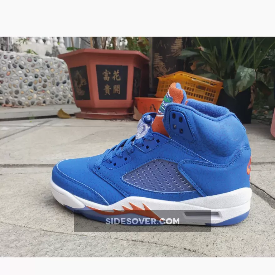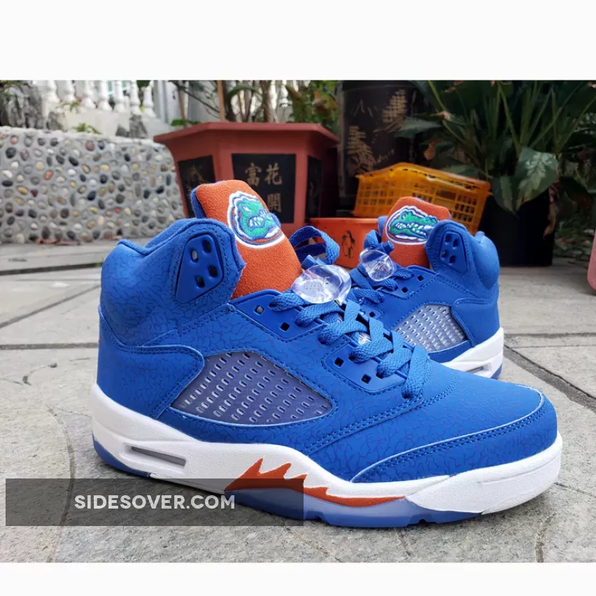 This Air Jordan 5 comes highlighted with Blue across the upper while subtle elephant print runs throughout. Next, Orange suede adorns the tongue with an embroidered ‘Gators’ logo. Following, the same shade appears on the shark teeth across the White midsole.