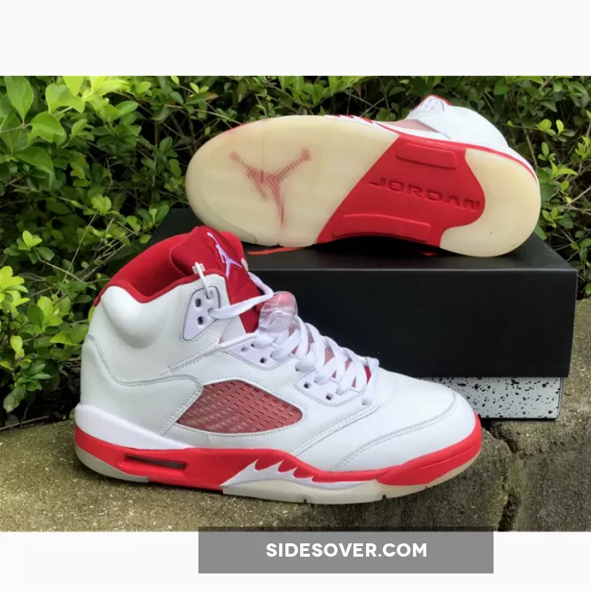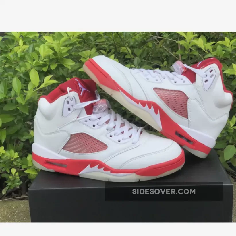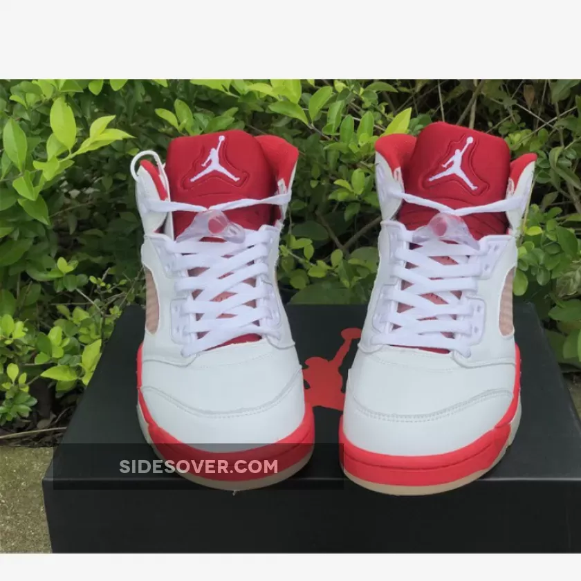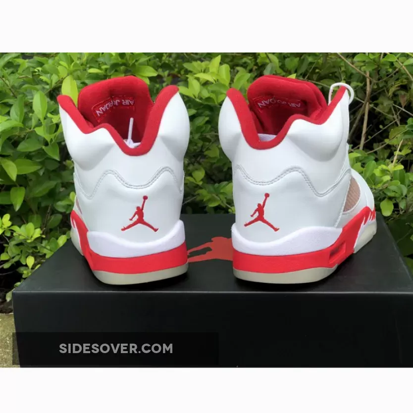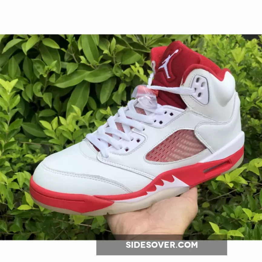 The shoe’s upper is predominantly white, and is constructed from a combination of leather and mesh materials. Red accents can be seen all round the shoe, including prominent areas like the tongue, collar, and midsole, while the outsole appears in a translucent color. The shoe maintains most of the signature design elements of the Jordan 5, such as the shark-tooth detailing on the midsole and a translucent mesh panel on the sides. It also has a visible Air unit in the midsole around the heel to help with impact absorption.