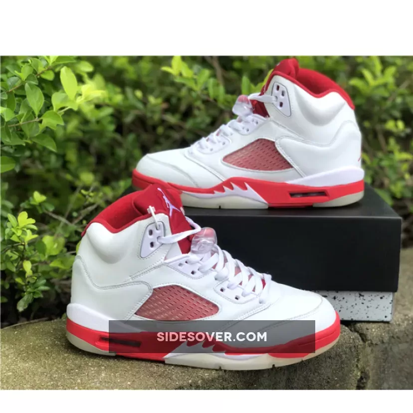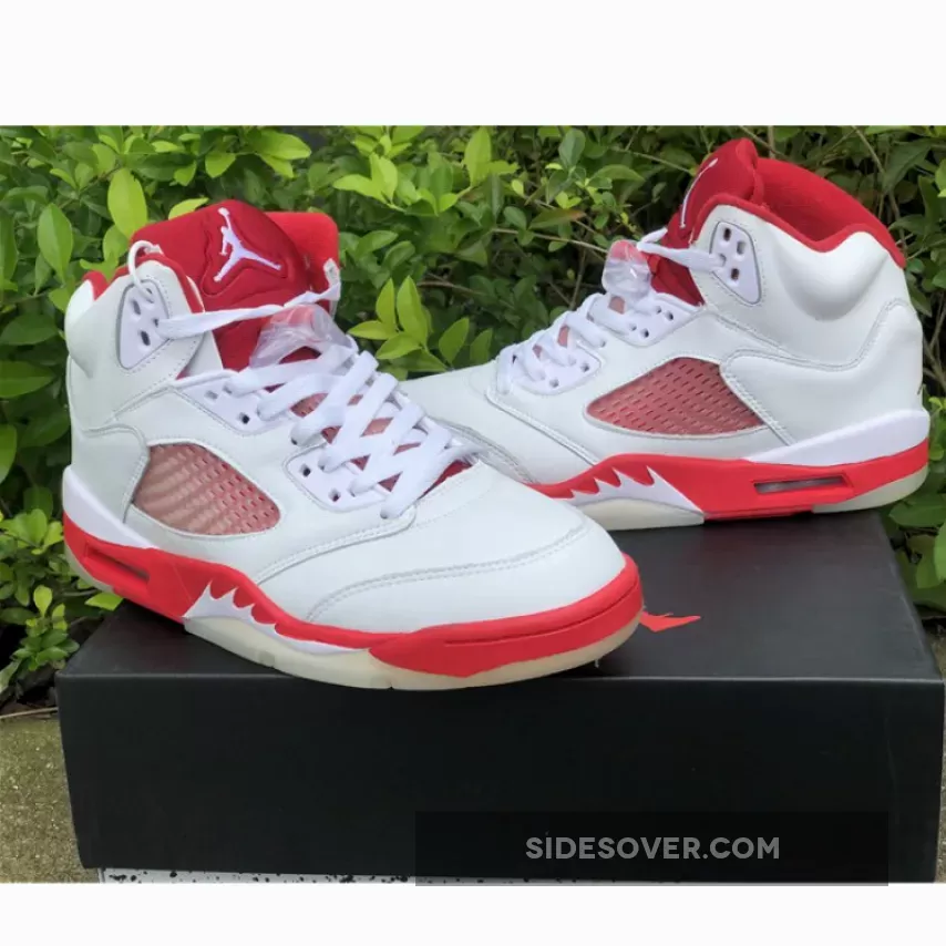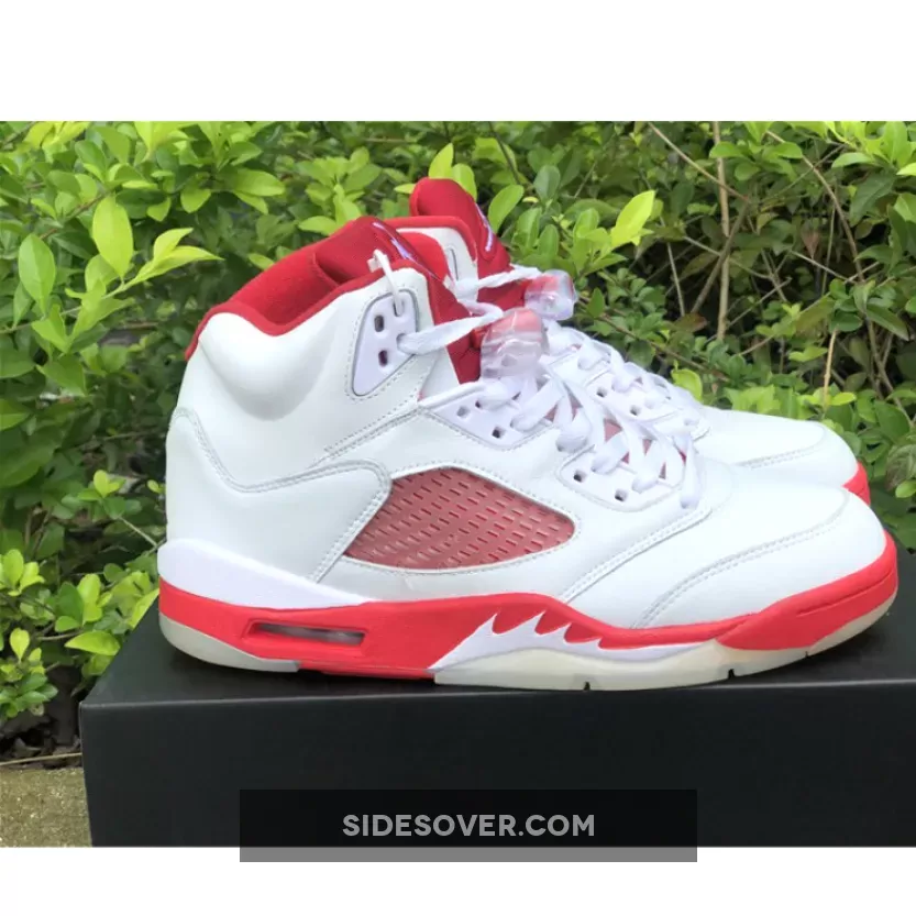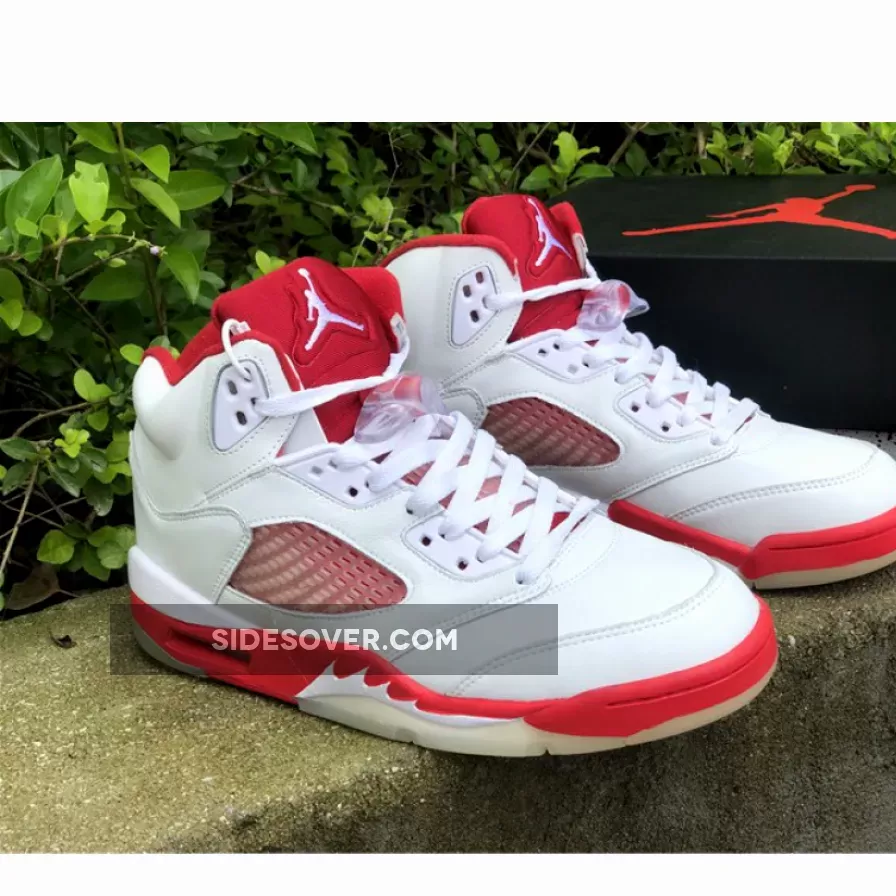 The shoe’s upper is predominantly white, and is constructed from a combination of leather and mesh materials. Red accents can be seen all round the shoe, including prominent areas like the tongue, collar, and midsole, while the outsole appears in a translucent color. The shoe maintains most of the signature design elements of the Jordan 5, such as the shark-tooth detailing on the midsole and a translucent mesh panel on the sides. It also has a visible Air unit in the midsole around the heel to help with impact absorption.