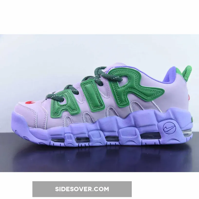 AMBUSH’s Nike Air More Uptempo Low has a “Lilac” nubuck upper with “AIR” lettering across the sidewalls in “Apple Green.” The Nike Swoosh on the toebox is embroidered in “University Red,” which is repeated in bubble form on the heel.