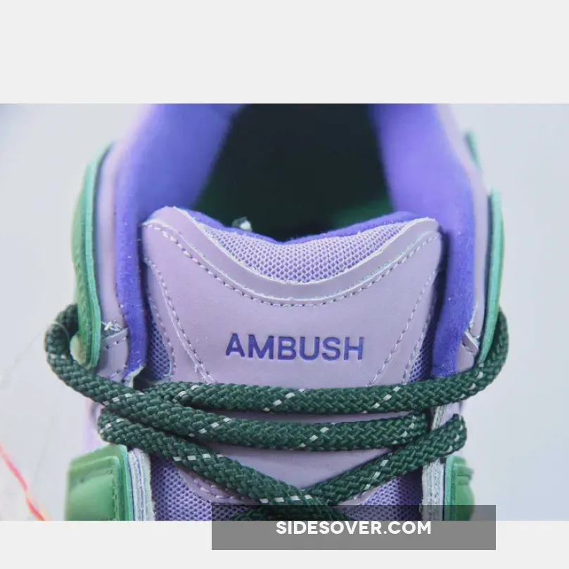 Additional touches of Green can be seen on the laces, pull tabs, and AMBUSH branding on the heels. The inner lining is covered in Purple, while the Purple sole incorporates a transparent full-length Air unit, providing a distinct finishing touch to the overall design.