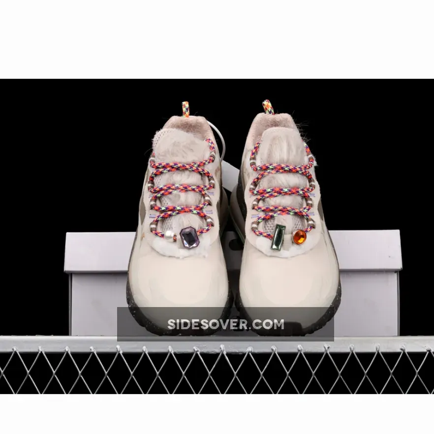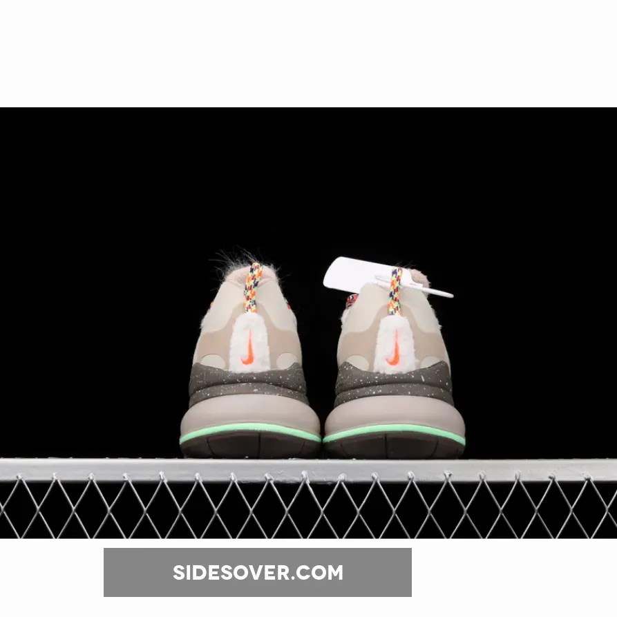 The most outstanding of the offering’s features would undoubtedly be the attached fur that outfits a large section of the instep. Its hairs are wrapped over top by colorful rope laces whose topmost loop is accessorized with a green carabiner and a complementing paracord keychain. What’s more, the vamp brings along the brand’s penchant for jewelry as gems of emerald, orange, and purple shades are used as if dubraes. A light tan then lies underneath in two fashions: one a more flat, unblemished finish and the other an eccentric mosaic of animal print. Speckled soles then draw just below, volt accents the model’s matted Air unit, and terry cloth warms from within.