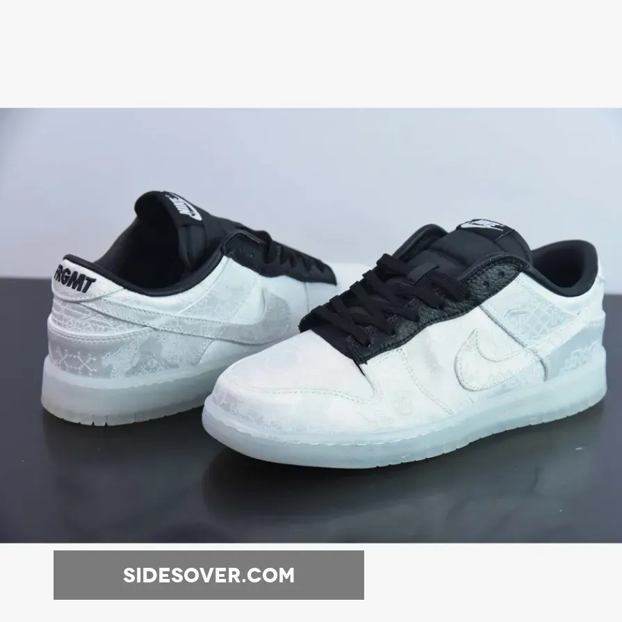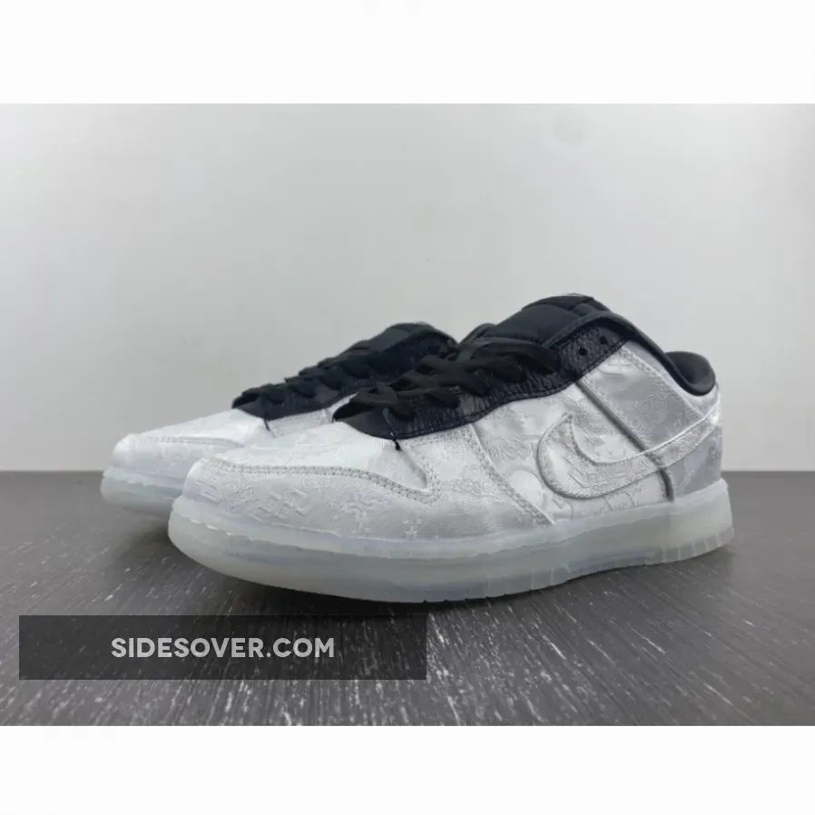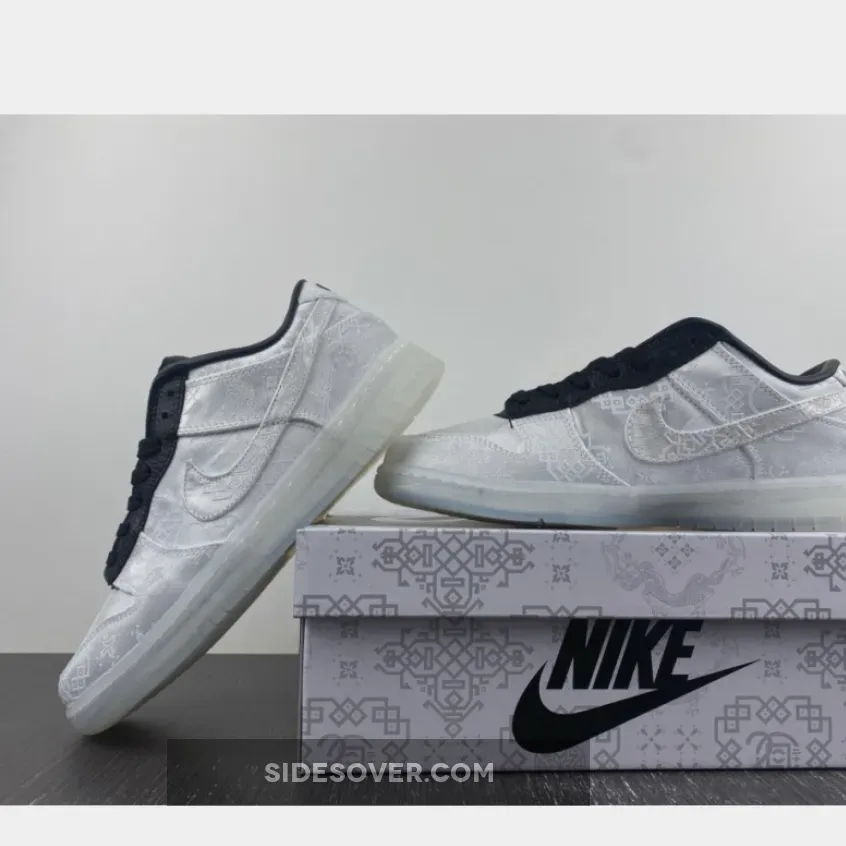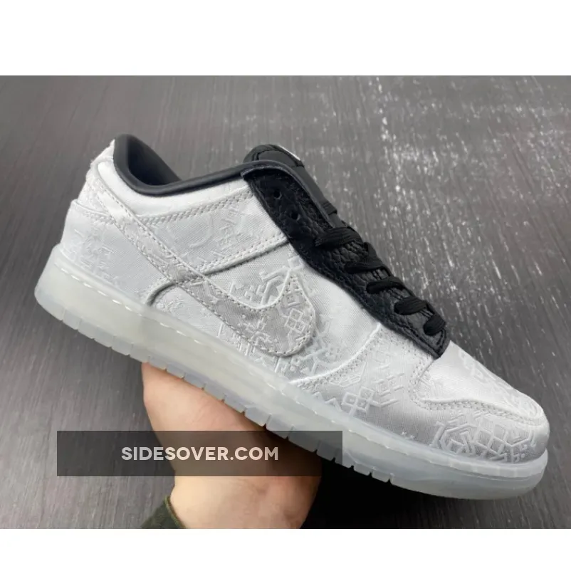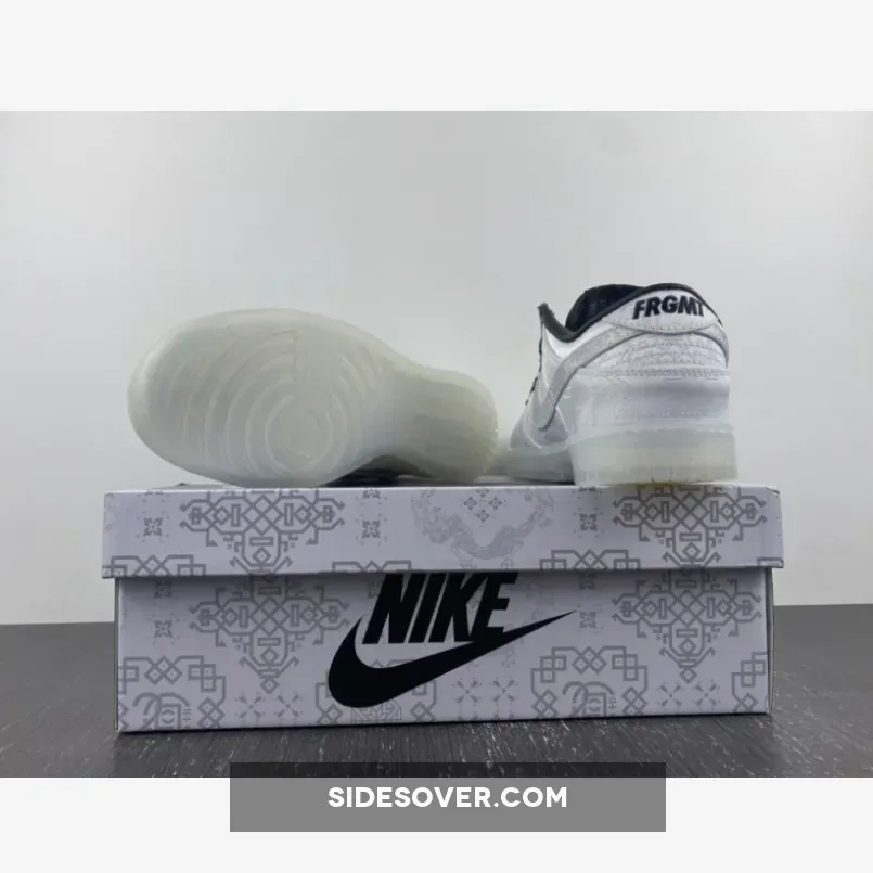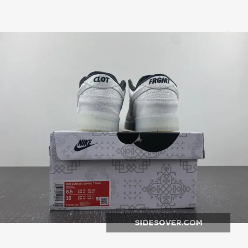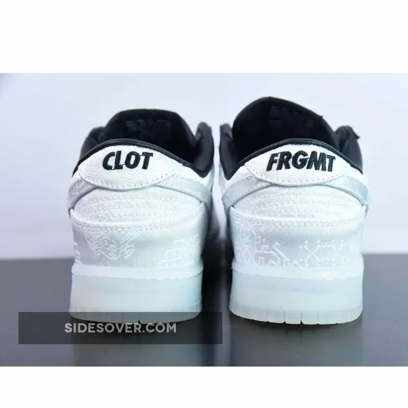 the Clot x Fragment x Nike Dunk Low features a tearaway silk upper in White with Black leather eyestays and lining atop a translucent outsole. “FRGMT” branding is embroidered on the heels, while co-branded Clot and Fragment logos are stamped onto the insoles. The shoe will also come housed in special packaging.