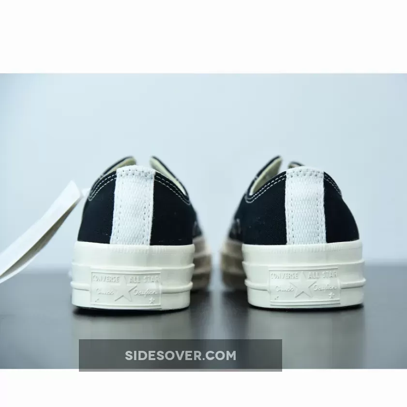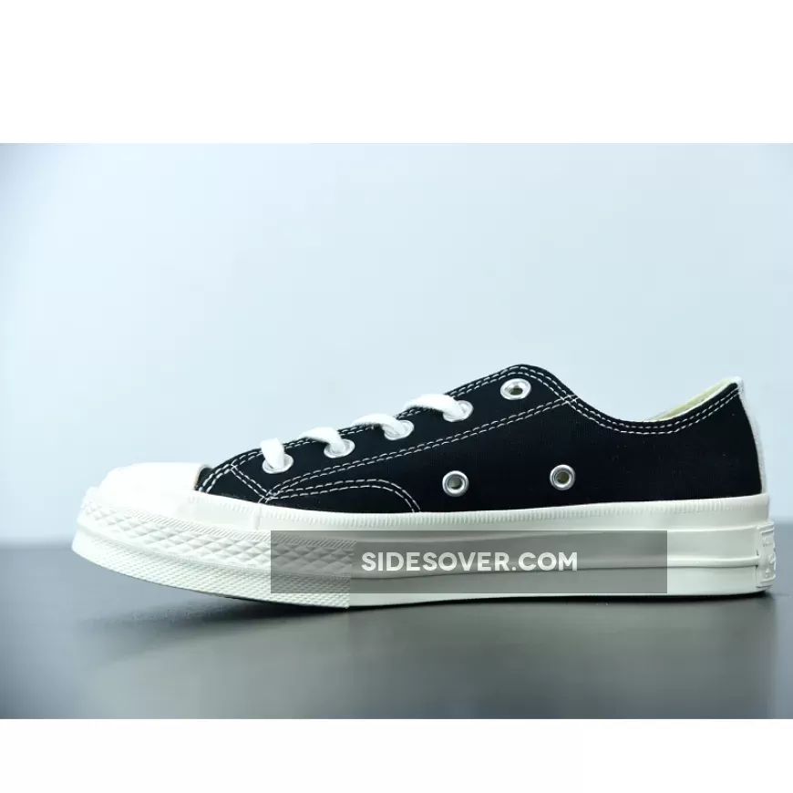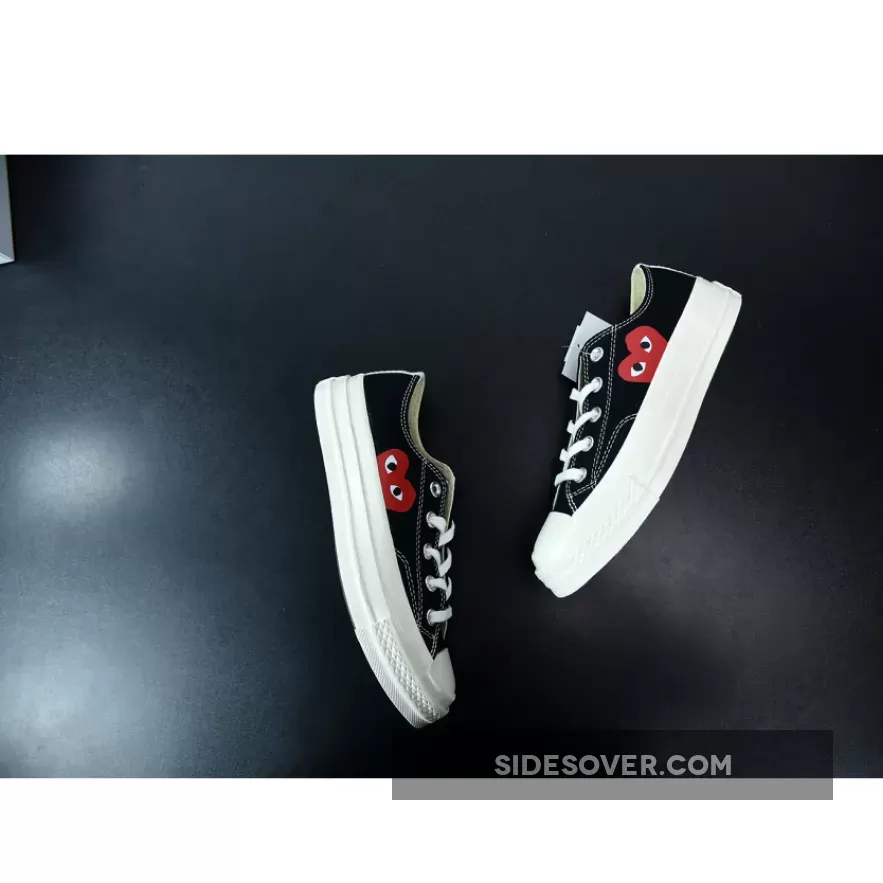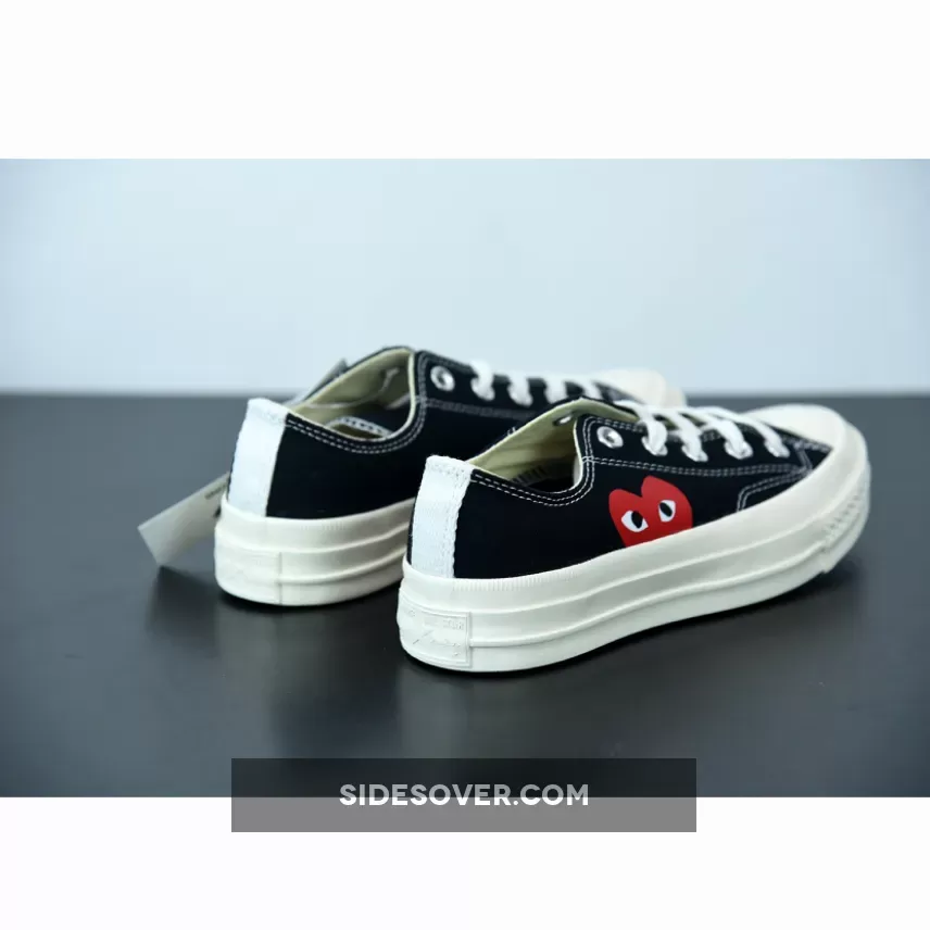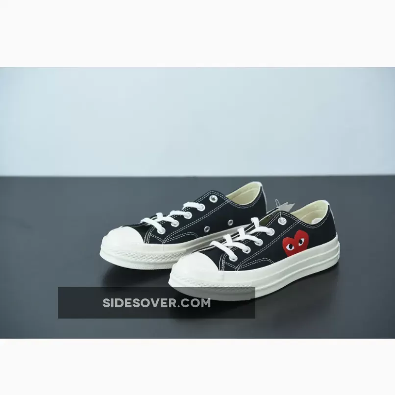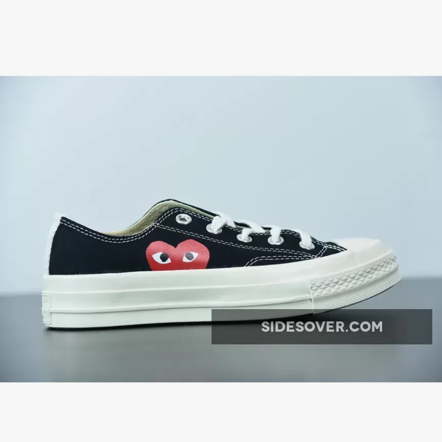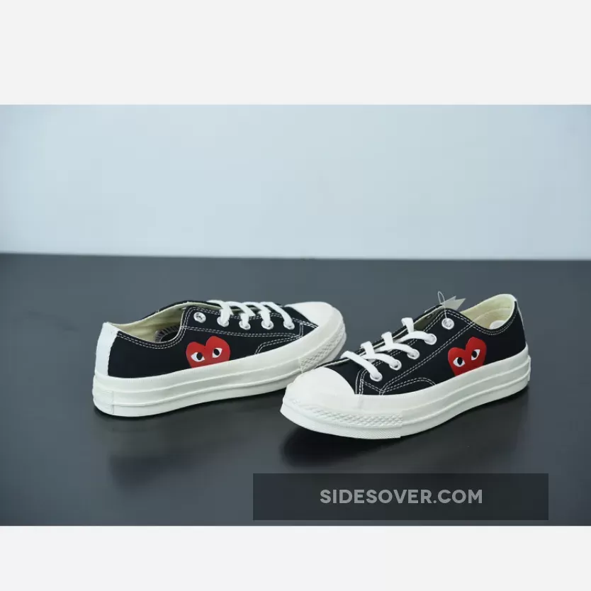 Designed by graphic artist Filip Pagowski and Comme des Garçons founder Rei Kawakubohe, the Comme des Garçons x Chuck Taylor 1970 Low ‘Play’ is a special edition colorway that features a black canvas upper with an oversized signature CDG red heart printed at the quarter panels.