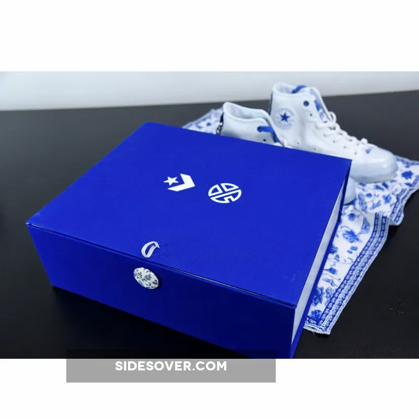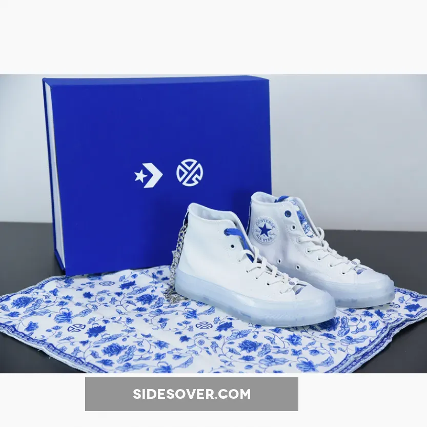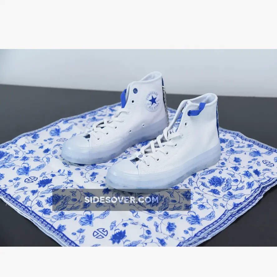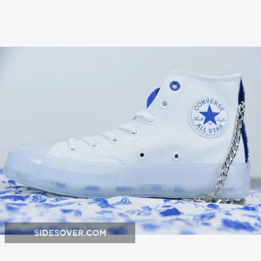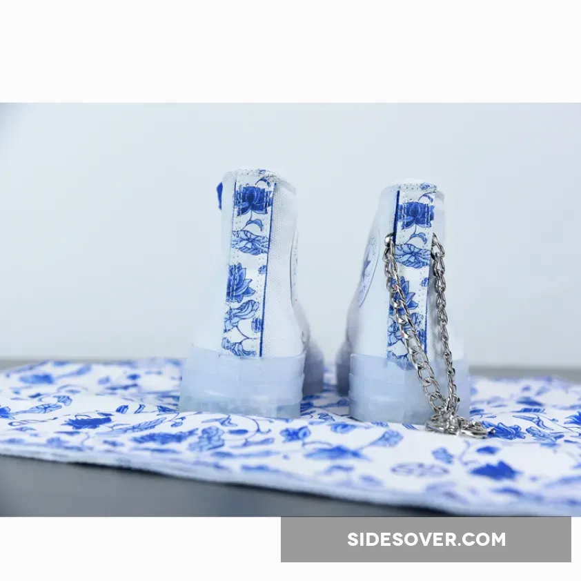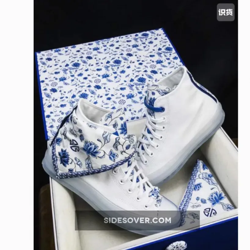 Using the high-cut edition of the perennially popular Chuck 70, Zhang specs all-white canvas uppers. Being the premium Chuck Taylor, expect a heavier and more durable gauge of fabric. Accenting the tongue is an intricate blue pattern, referencing the blue-glazed lotus artwork that historically adorns Chinese pottery. These lotuses repeat on the heel and ankle stripes, and also decorate the silk-like bandana that’s tied around the right shoe’s ankle. According to Zhang, this signifies a union between cultural motifs.
