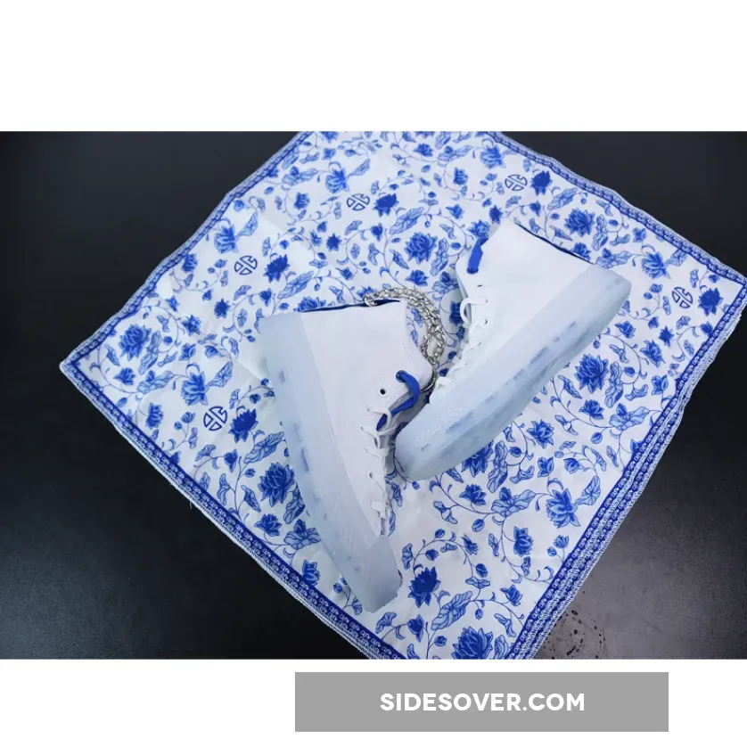 The joining of Eastern artistry and Western showmanship continues on the iced-out midsole, revealing more of the pottery pattern underfoot. Furthermore, the clear soles reveal a glow-in-the-dark effect that activates in the dark. Other details that are initially hidden include Zhang’s logo printed on the bandana, and matching lace dubraes.