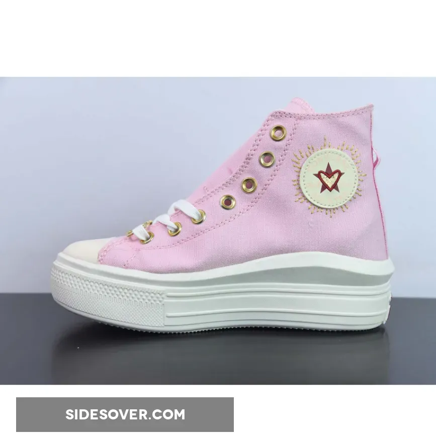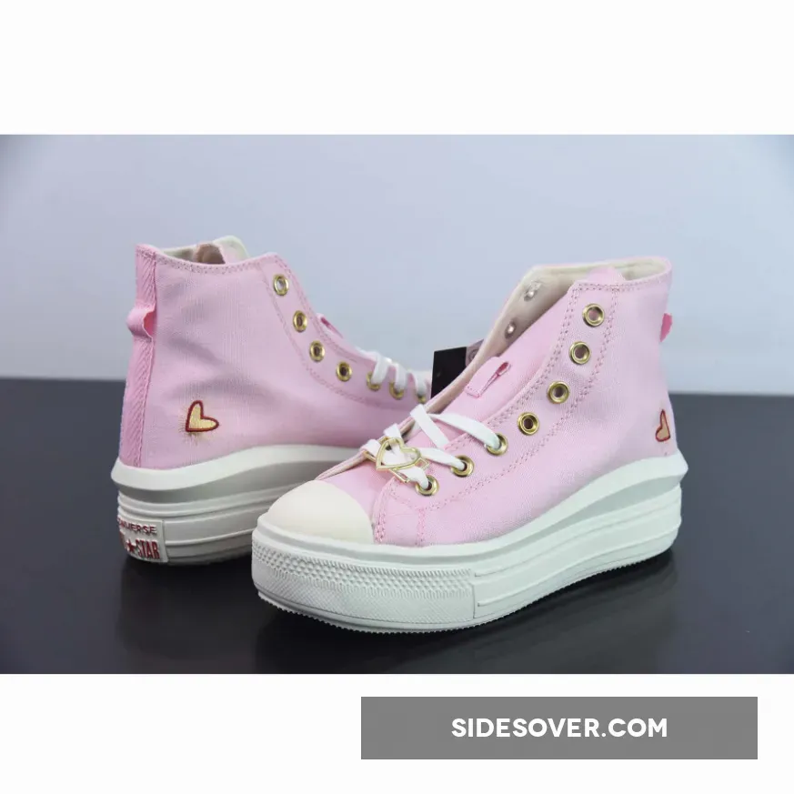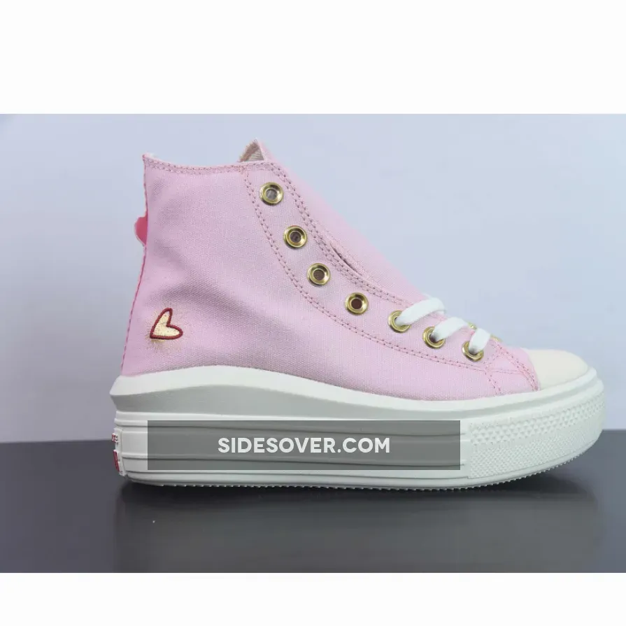 The Chuck Taylor Move, Platform High Hearts Pink, is a new take on the classic design, featuring a unique pink colourway with a heart pattern. It sports a pink canvas upper with white hearts printed on it, a platform rubber midsole and a rubber outsole. Made with high-quality materials, these grails are built to last. The pink colourway is unique and playful, and the heart pattern adds a touch of fun to this masterpiece. The platform midsole adds a bit of height, making you stand out even more. The rubber outsole provides great traction and durability.