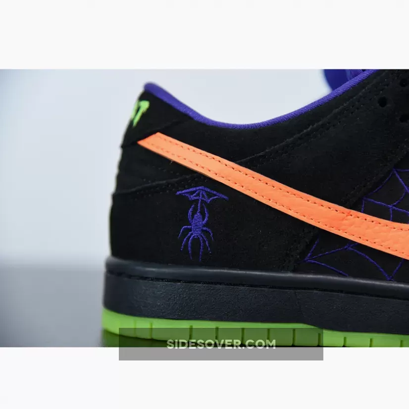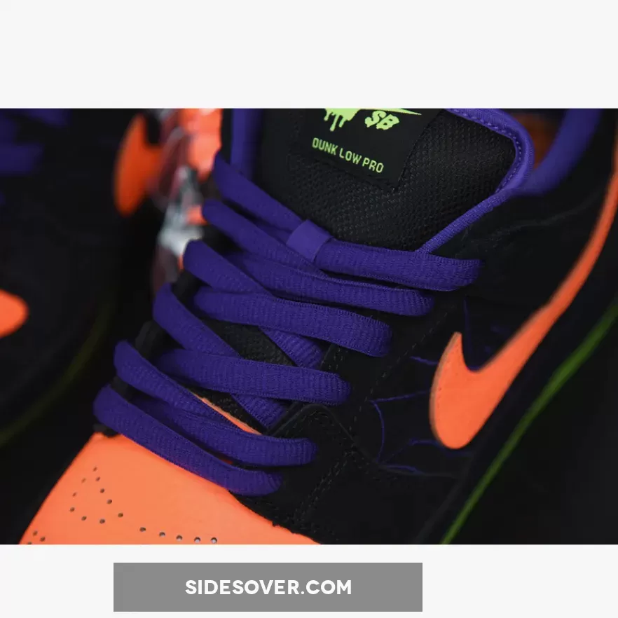 Whereas the Air Force 1 and Air Max 98 took on bones and cemetery motifs, respectively, the skate-focused silhouette is just slightly more subtle: graphic touch-ups at the profile tell a story of a spider and its web through purple embroidery, sitting next to contrast accents of bright orange and lying atop a backdrop of matte black suedes.