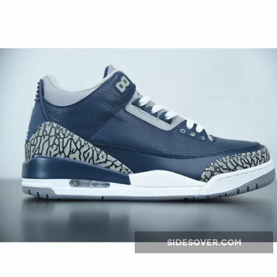 The upper of the Air Jordan 3 Retro Midnight Navy is composed mostly of a Midnight Navy tumbled leather while smooth perforated grey leather appears at the ankle and on the lacing system. In traditional Jordan 3 Cement styling, grey Elephant Print mudguards are located on the toe and heel. Jumpman logos on the tongue and heel tab, a grey Air Unit, and a white and grey sole completes this retro design.