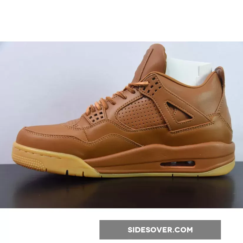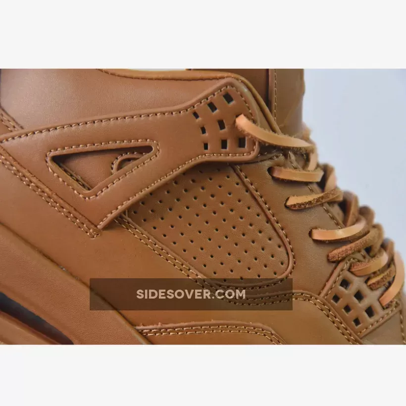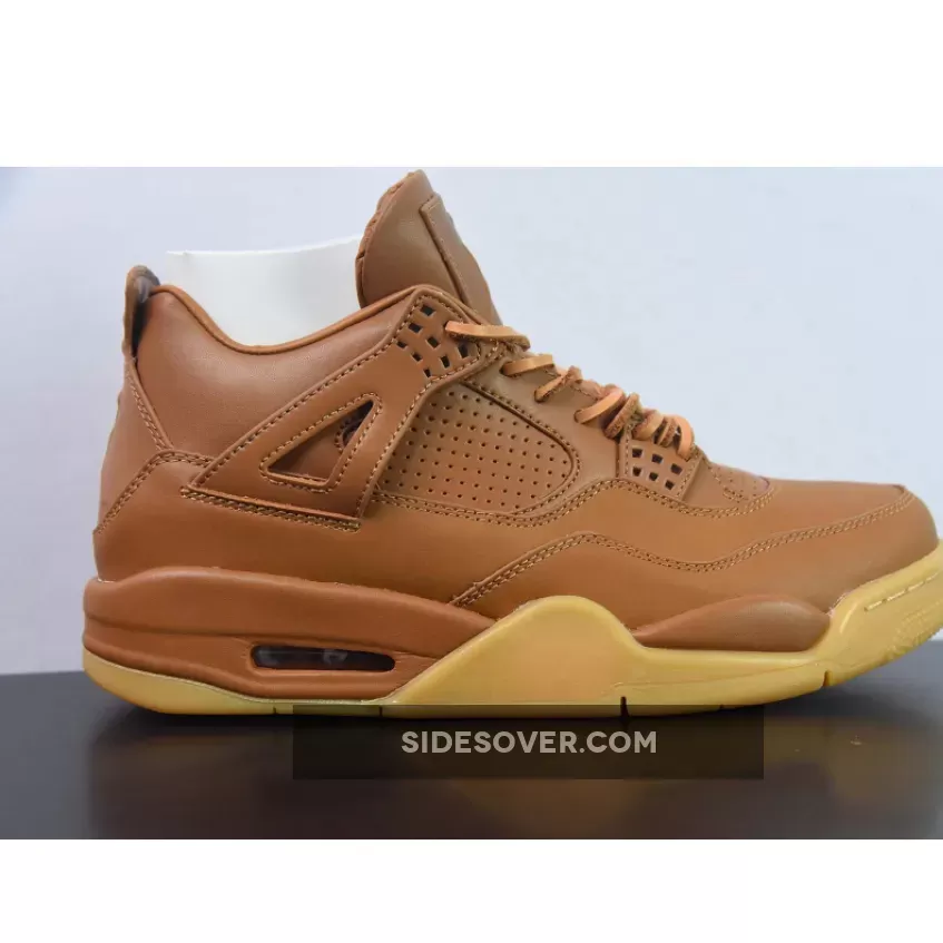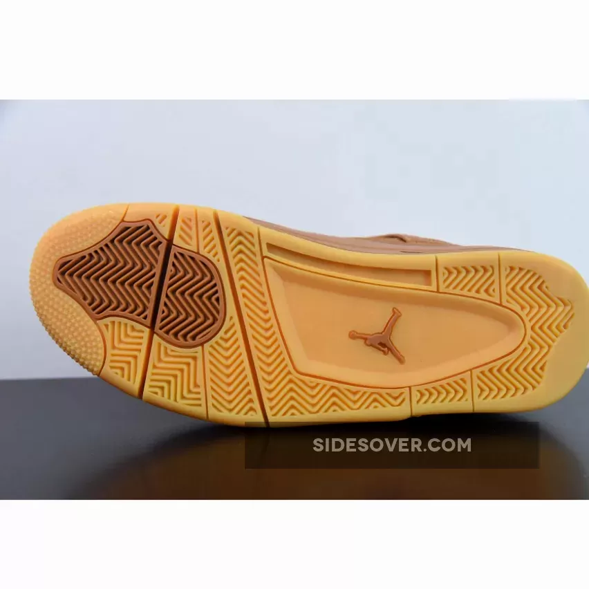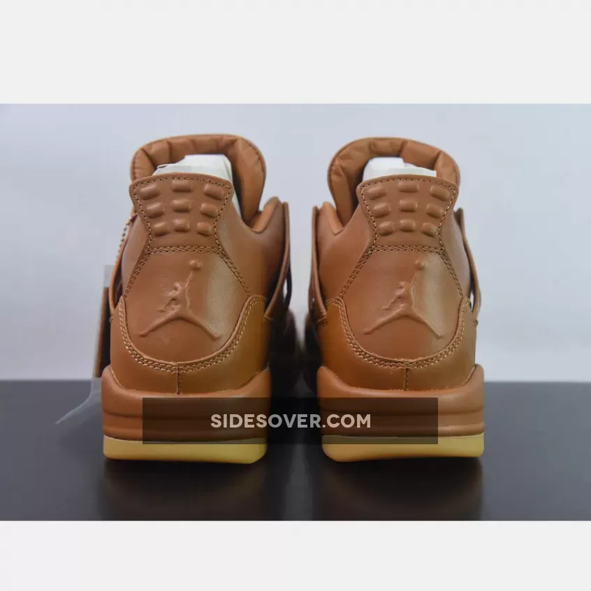 The shoe’s upper is made from nubuck leather, which has a soft and velvety texture, while the sole is made from gum rubber. The Wheat colorway gives the shoe a distinct earthy tone, reminiscent of wheat fields. It maintains several signature design elements of the Air Jordan 4, such as netting on the side panels and plastic wing eyelets, as well as Air-Sole units in the heel and forefoot for cushioning and impact absorption.