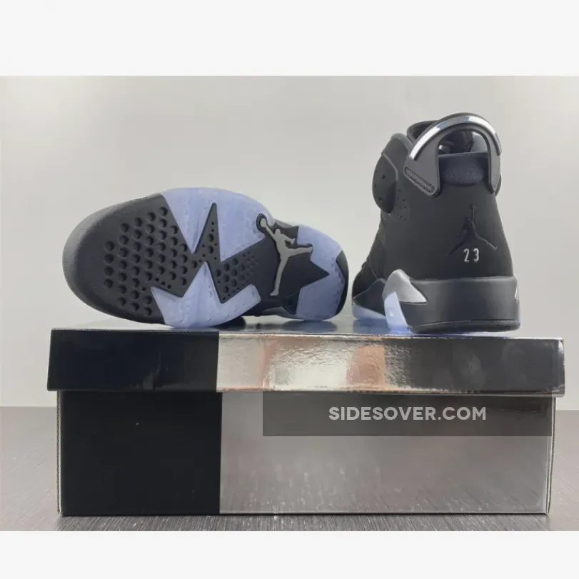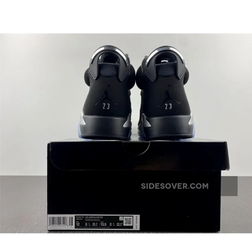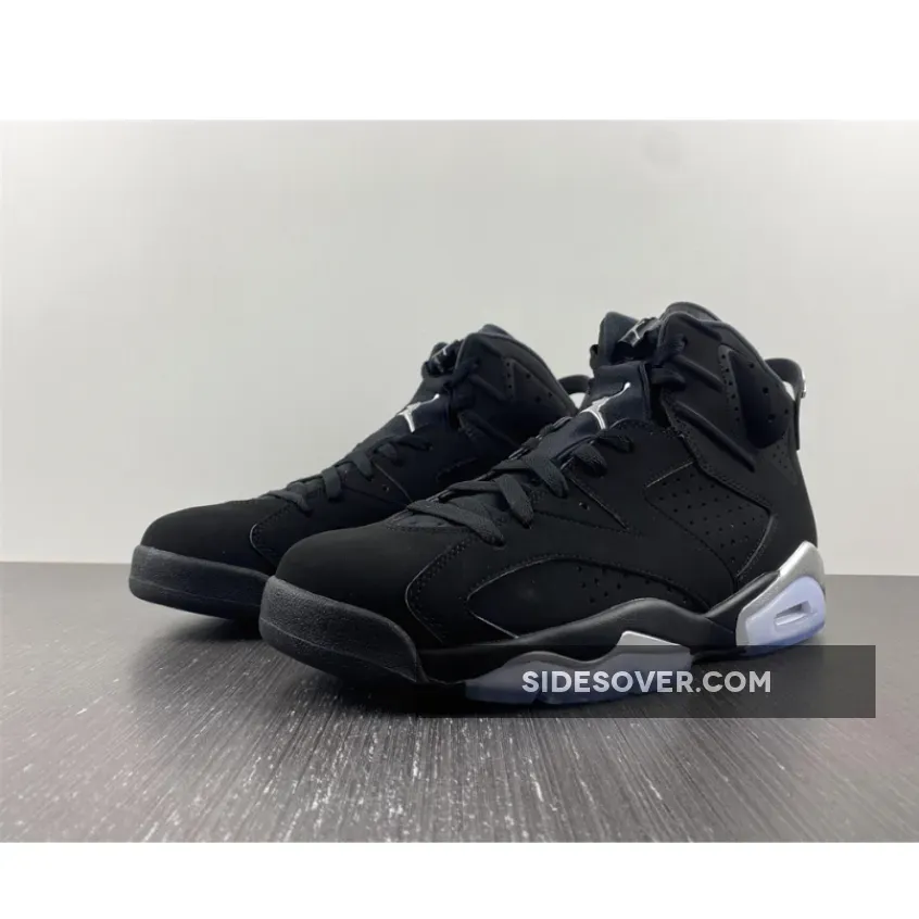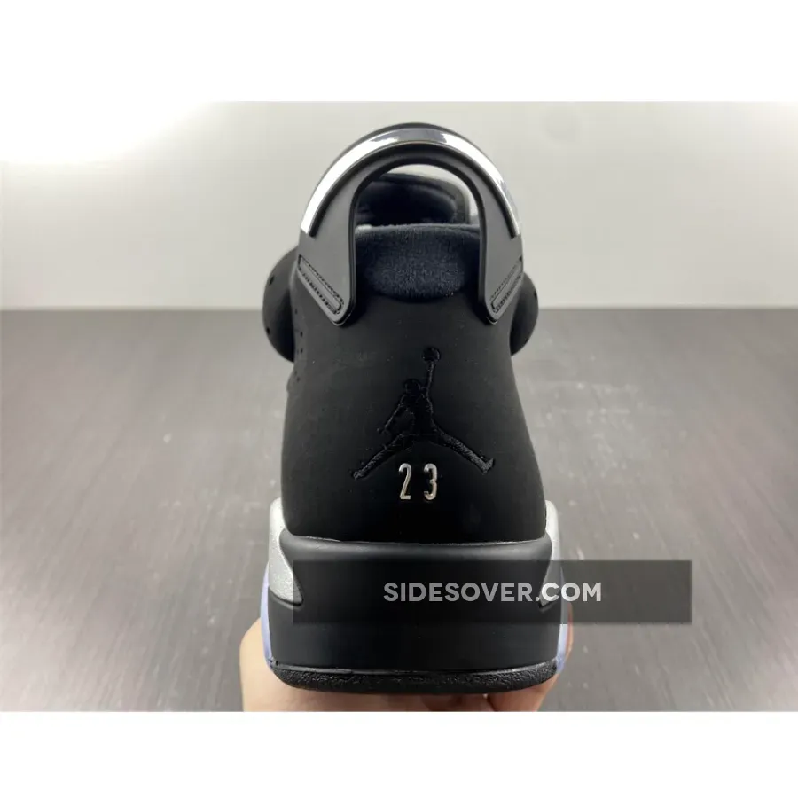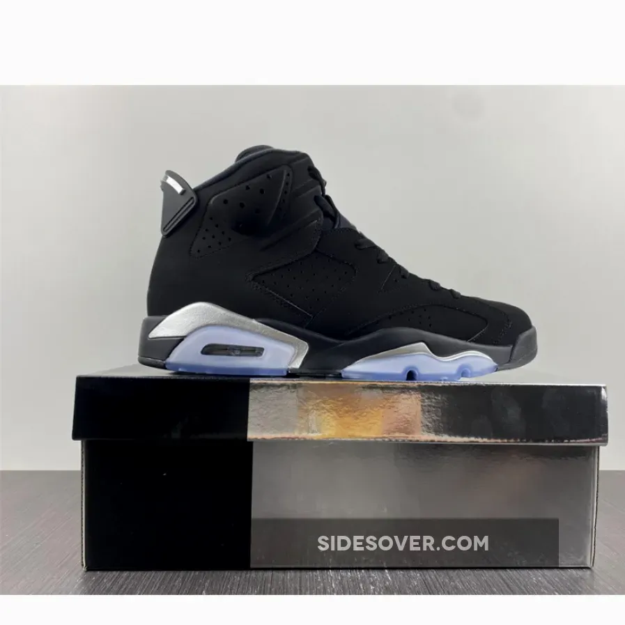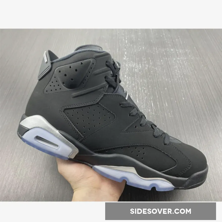 The Air Jordan 6 Retro ‘Chrome’ showcases a familiar design previously seen on the ‘Chrome’ Air Jordan 6 Low from 2015. The upper is crafted from solid black nubuck with silver Jumpman branding on the lace guard. Standard AJ6 details remain intact, including a windowed tongue, lace locks, and a spoiler-like heel tag. The mid-top is mounted on a black polyurethane midsole, accented with metallic silver detailing and supported by a translucent rubber outsole.