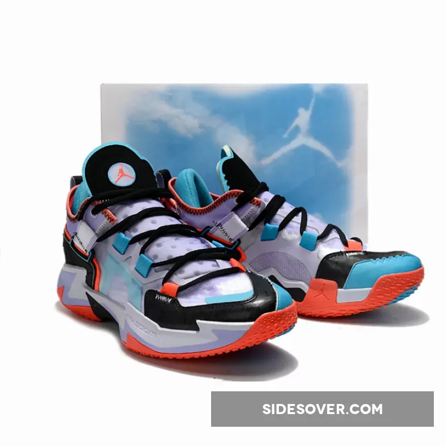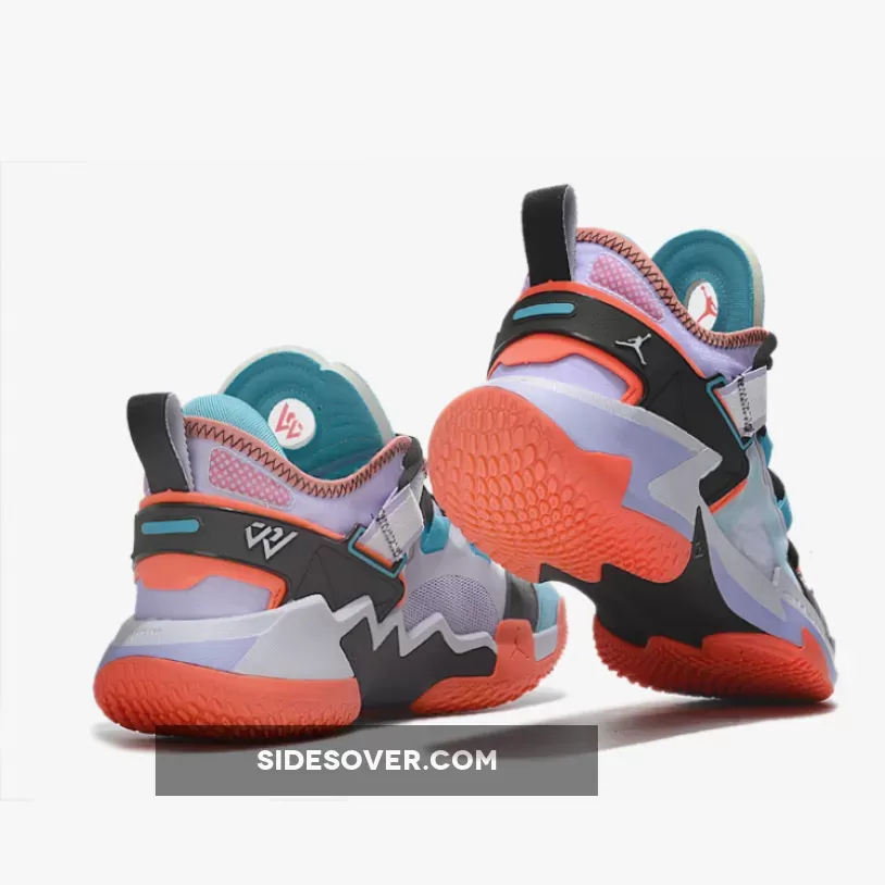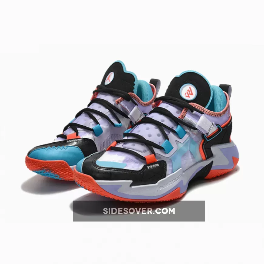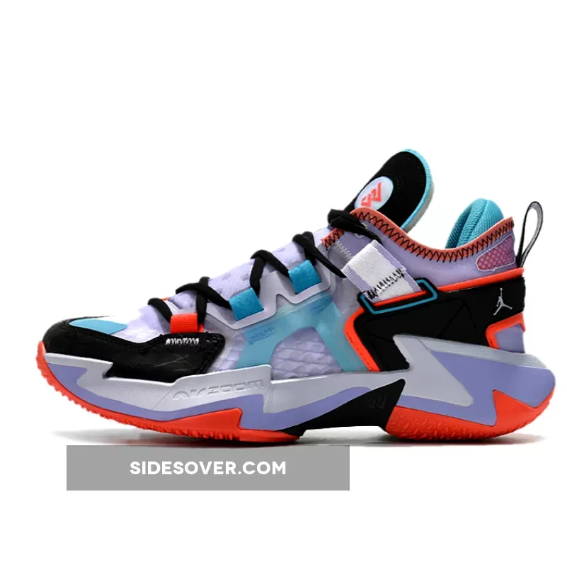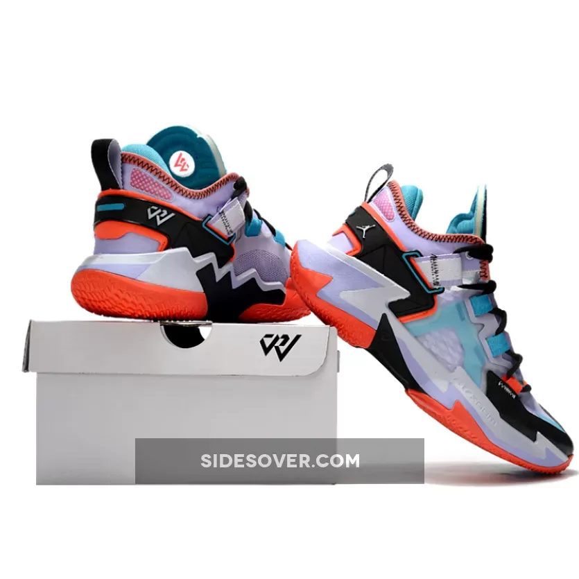 The ‘Childhood’ Jordan Why Not .5 celebrates Westbrook’s three kids and the next generation. As you can see, the pair features bright shades like Lilac, Orange, and Cyan along with a unique lacing system. Russell’s RW logo lands on the tongue and medial side, while the Jumpman adorns the lateral. Other highlights include a double-stacked Zoom Air unit in the forefoot, and a Crimson Orange rubber outsole.