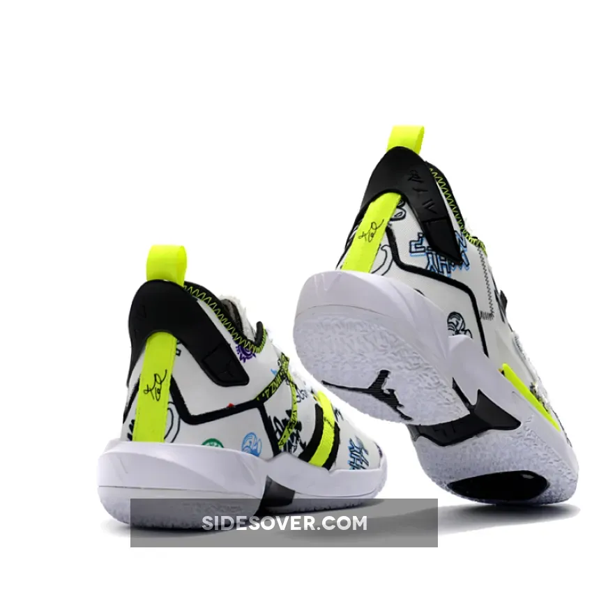 This Why Not Zer0.4 features a White upper as its canvas fully covered in illustrated graphics. Transparent TPU overlays, Black detailing with added Volt contrasting accents throughout.
