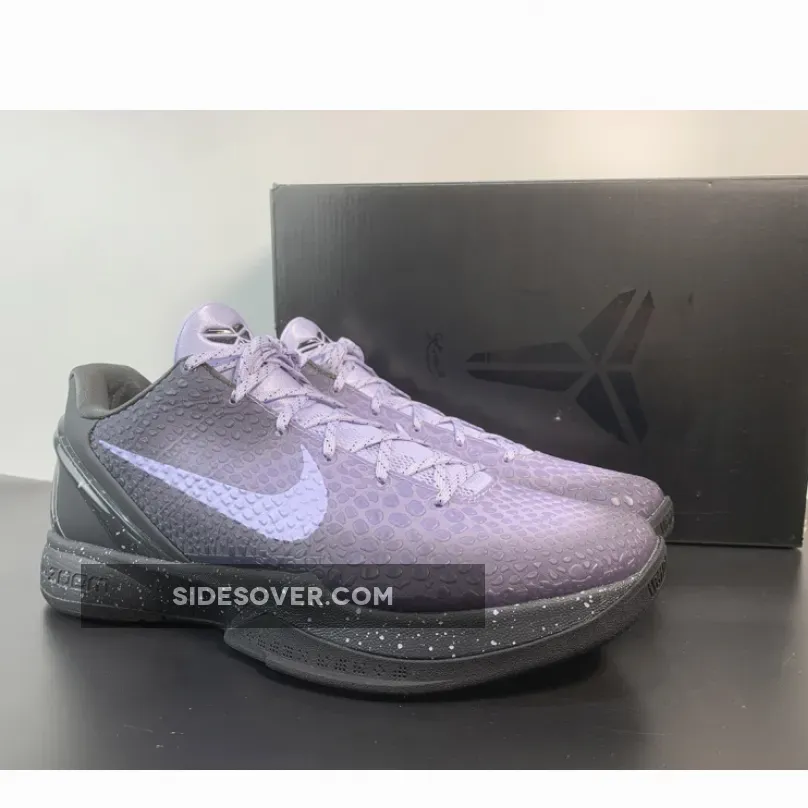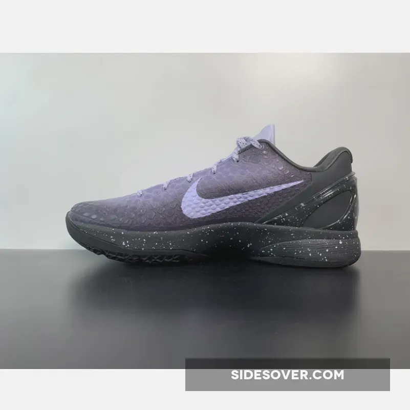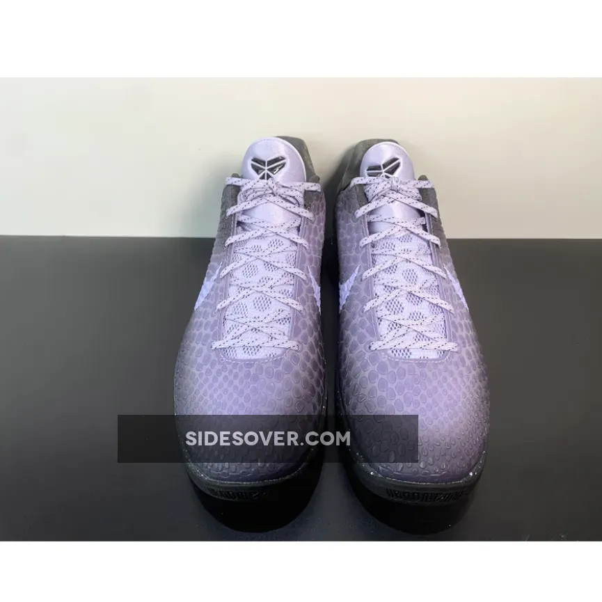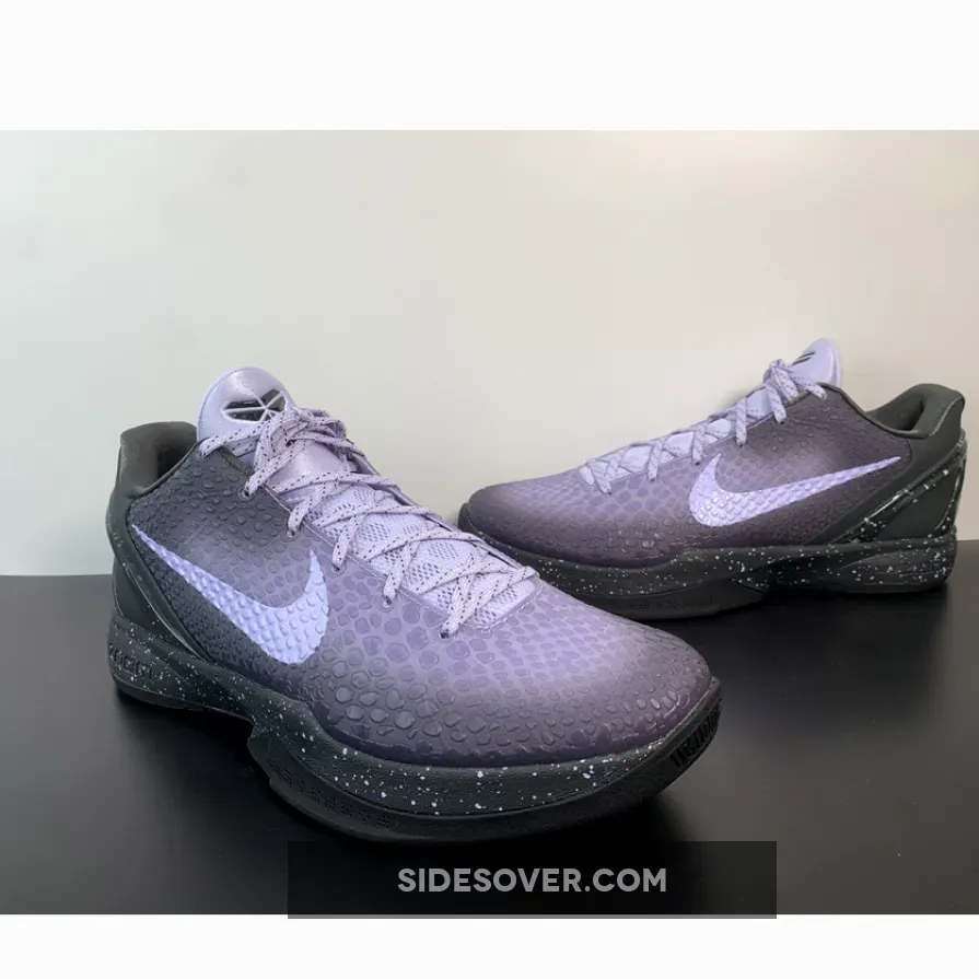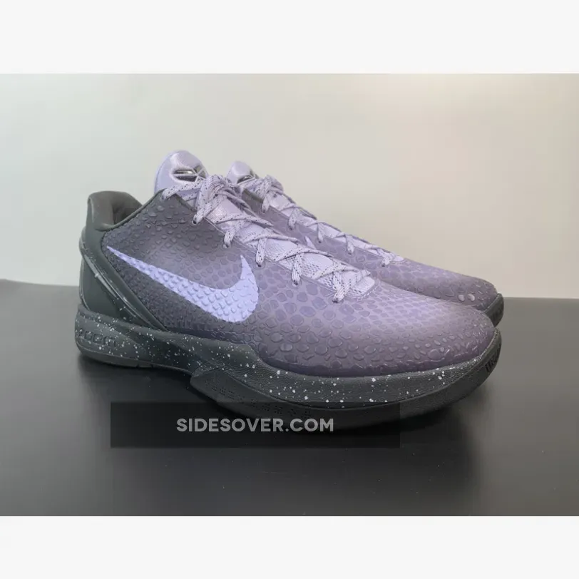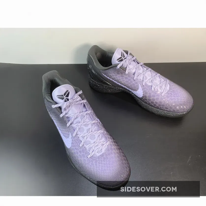 The Kobe 6 Protro “EYBL” offers a scaly synthetic upper with a purple gradient fade that’s lighter towards the top of the foot and grows much darker as it descends towards the black midsole. Tongues and throats are presented in a light lilac color, while branding is handled by a white midfoot Swoosh and Kobe’s Kill Bill-inspired sheath logo in black on the tongue. Heels are done up in black, and overlaid by a black TPU heel cage with silver speckling and a silver EYBL logo. Down below, the aforementioned midsoles feature enhanced Zoom Air cushioning units for a modernized on-court feel while also adding their own silver speckled detailing for extra style.