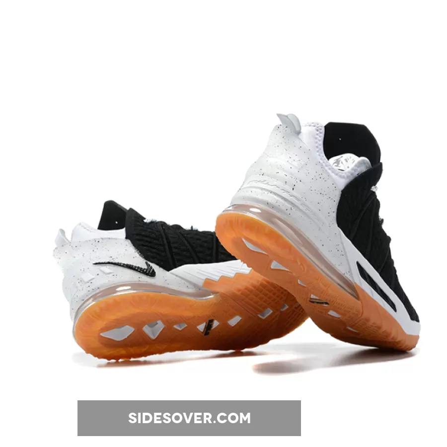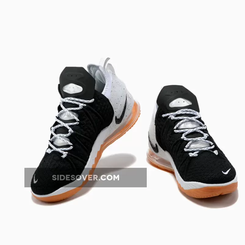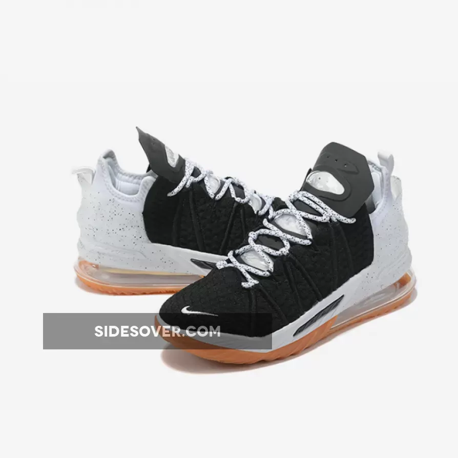 Dressed in a Black, White, and Gum Medium Brown color scheme. This offering of the Nike LeBron 18 features a Black Flyknit upper with a White mesh heel, embroidered mini Swoosh on the toe, and midsole. A speckled “Oreo”-like heel counter with matching laces atop a Gum rubber outsole completes the design.