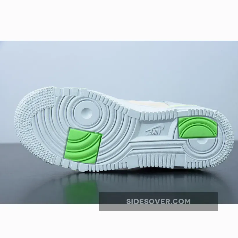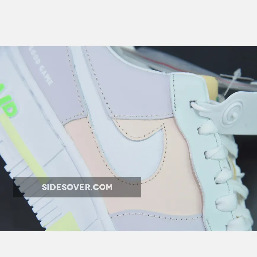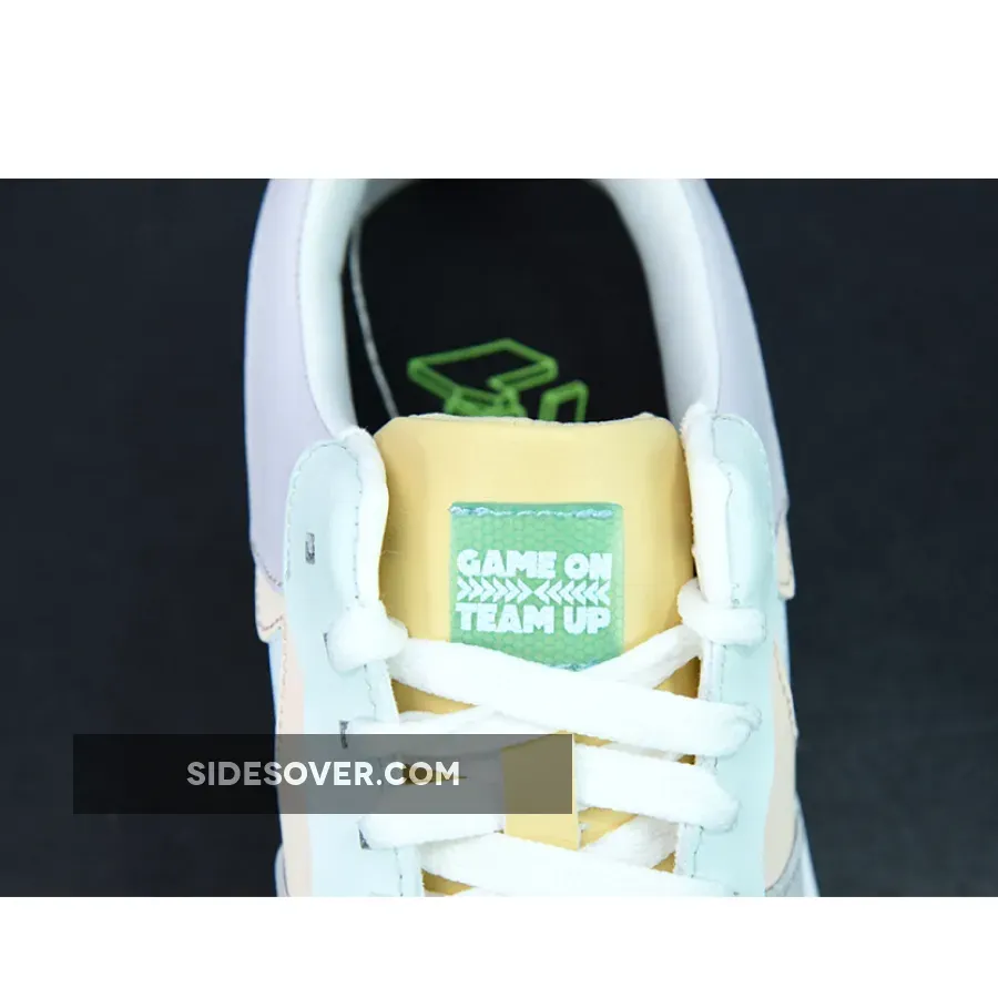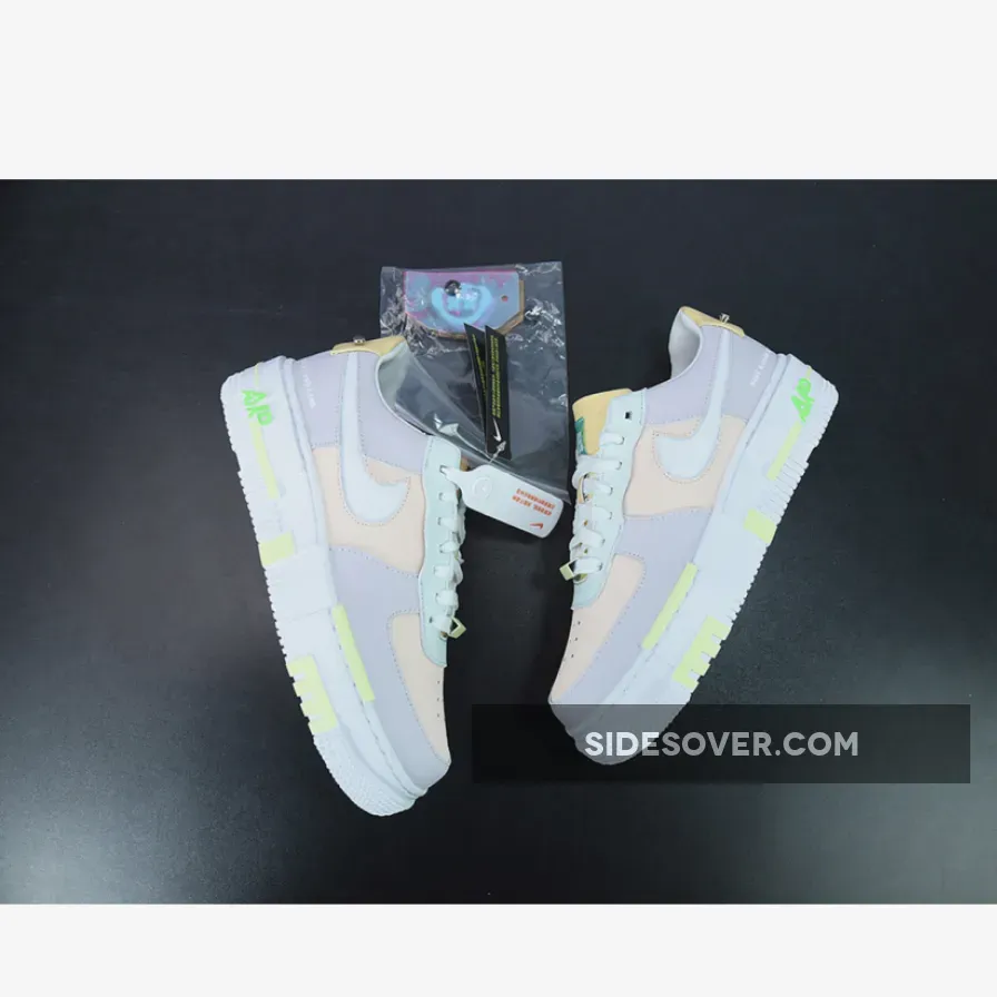 Anchored in light fawn and white, the pair then presented a smorgasbord of pastel and neon pops. The former arrives across the leather constructs, including yellow tongues and heel overlays, seafoam eyestays, and peach uppers. Vibrant pink TPU heel overlay overlays compliment the volt and neon found at the midsoles, whilst tongues again feature translucent tags, her in green. Completing the design are glow-in-the-dark detailing at the Swoosh and blocky dubrae.