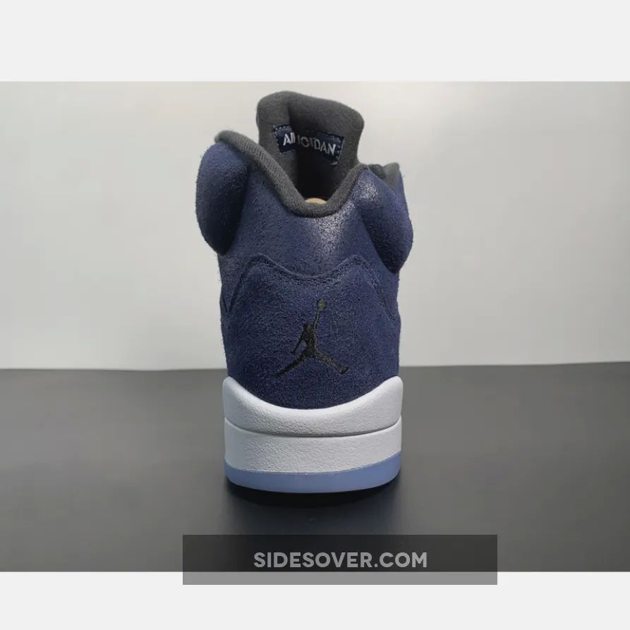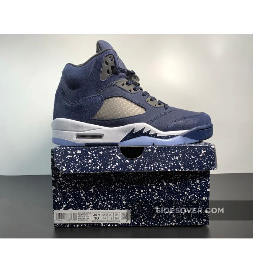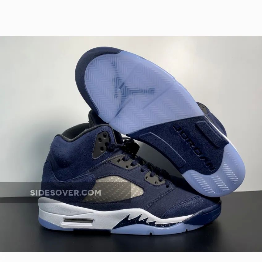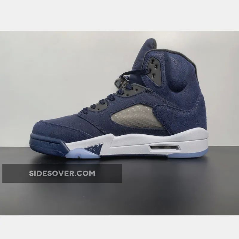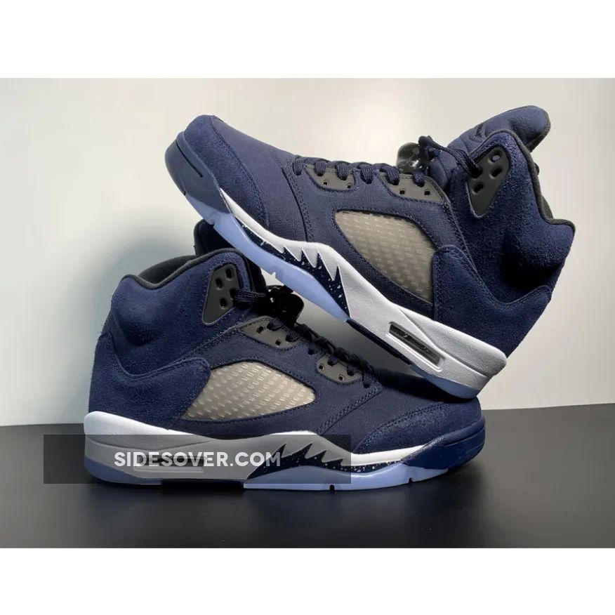 This Air Jordan 5 Georgetown come dressed in a Midnight Navy, Black, and Football Grey color scheme. The titular hue is predominantly featured throughout, giving off a “Fear” Jordan 5 vibe. Other details include Black eyelets and inner lining, Jumpman logos on the tongues and heels and the signature translucent side netting and branded lace locks.as well as the white midsole, speckled shark teeth overlays, and icy translucent outsole. the dark blue color blocking retains its connection to Georgetown University as grey hues envelop the mid-foot window in closing.