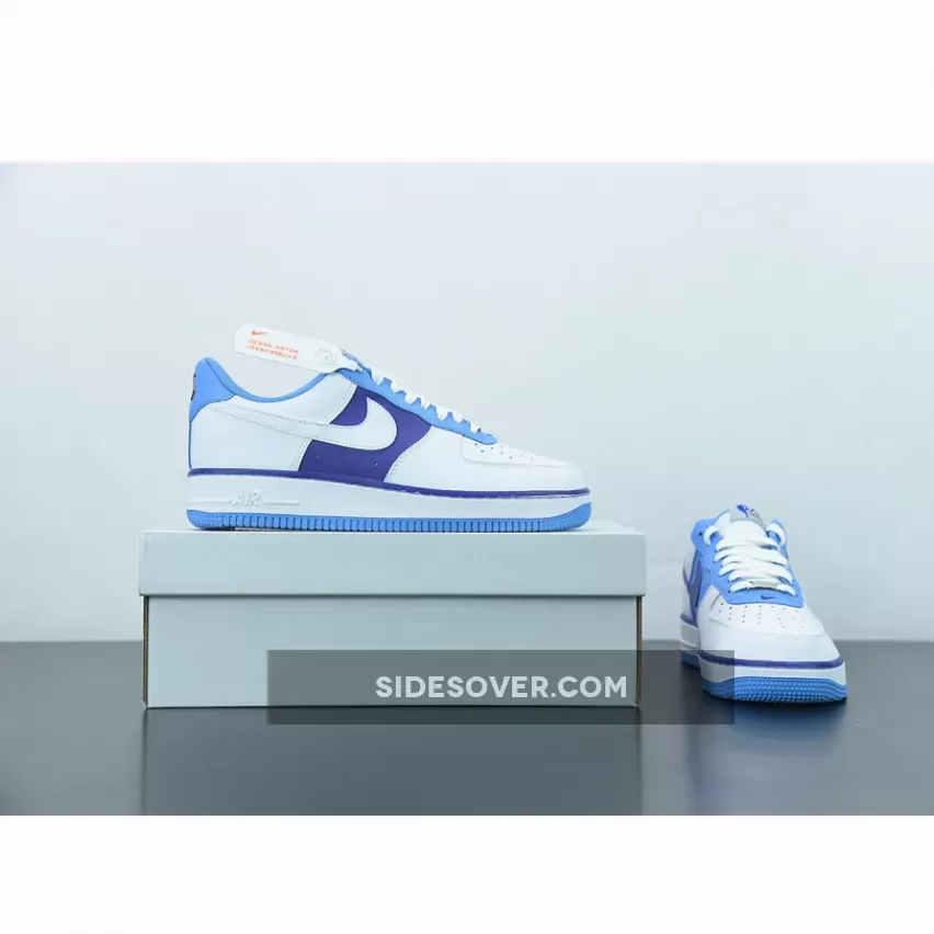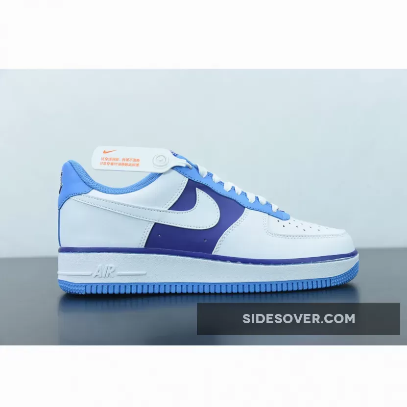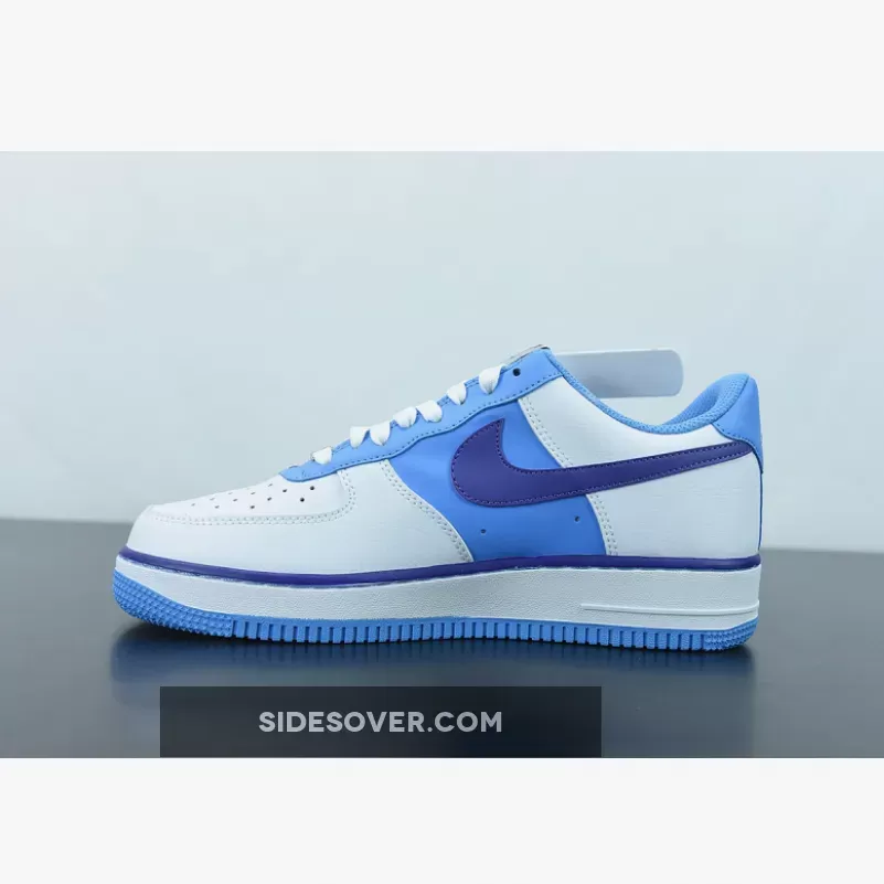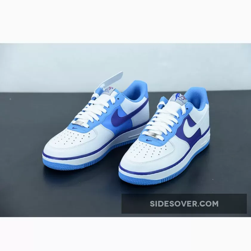 The entire vamp area and the quarter are a smooth white leather. The mid panel is a Lakers Purple matching the purple lining along the all-around feather edge. Baby blue comes out on the eye stay, the mesh sock liner, the tongue lining, the stitching right below the feather edge and the outsole. The lateral Swoosh in pure white stands out against the purple mid panel and blends in on the quarter. The diamond etched on the silver deubré is a nice finishing touch to this themed Air Force 1. Don’t froget to use our Air Force 1 size guide to know how it fits.