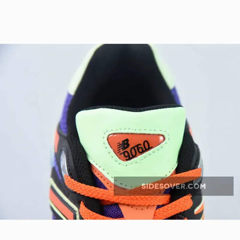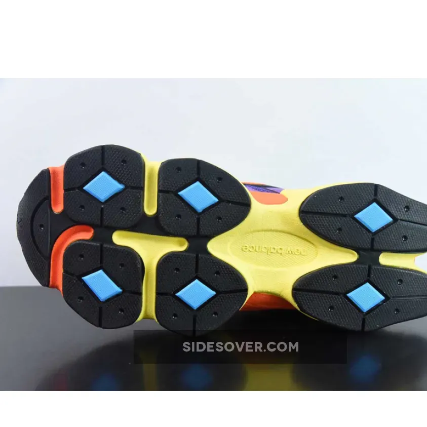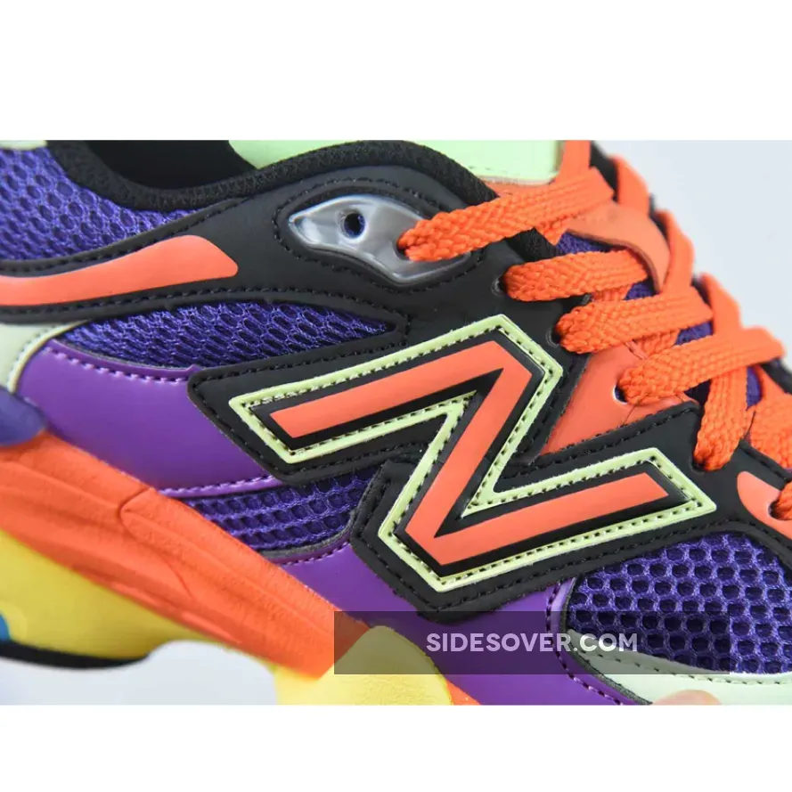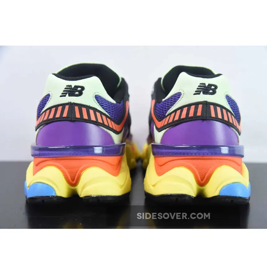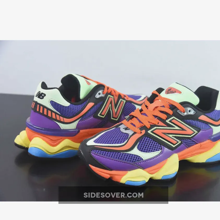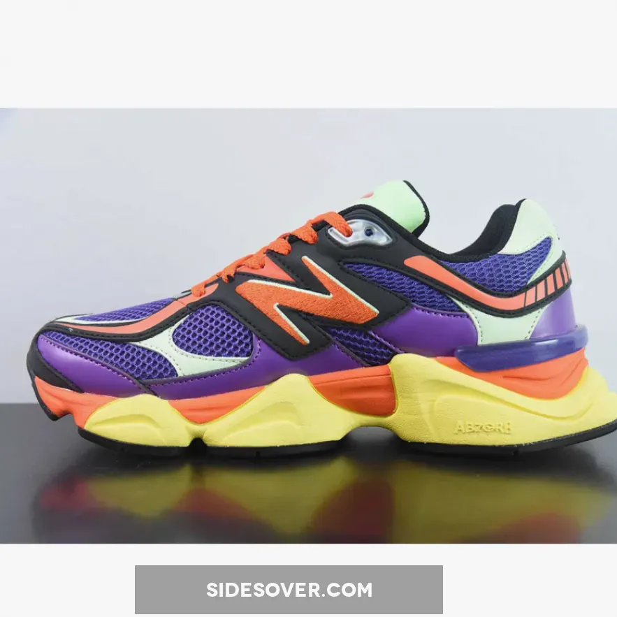 This New Balance 9060 features an energetic colour medley of purple, glow, orange, yellow and blue. The breathable, wide-holed mesh base is purple. The smooth leather overlays on the bottom half of the shoe also follow suit. Vibrant orange joins the mix via the toe accents, the heel accents, the laces and the “N” logos on both the medial and lateral mid-panels. The sock liners, the tongue lining and the embroidered NB branding on the heel tabs are all in black. The midsole with ABZORB and SBS cushioning boasts bright and striking yellow, orange and aqua blow. A black rubber outsole with aqua blue diamond accents caps off the design of these kicks.