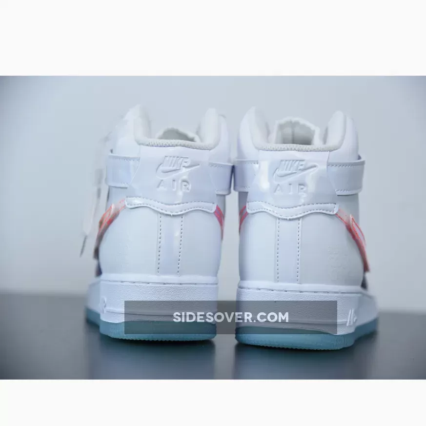 his rendition is swathed with bright white uppers and midsoles, as well as icy blue treading. However, the most attention-grabbing features of the pair are the iridescent accents that shimmer through various territories such as the ankle straps, quarter panels, lower throat overlays, and Swooshes which happen to be removable. Packaged with these sneakers are velcro patches such as this 8-bit heart that hosts the Nike logo pictured below
